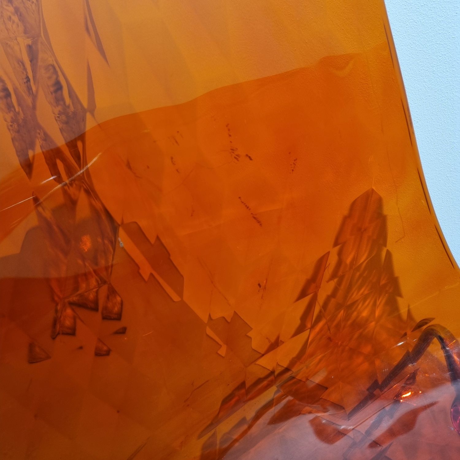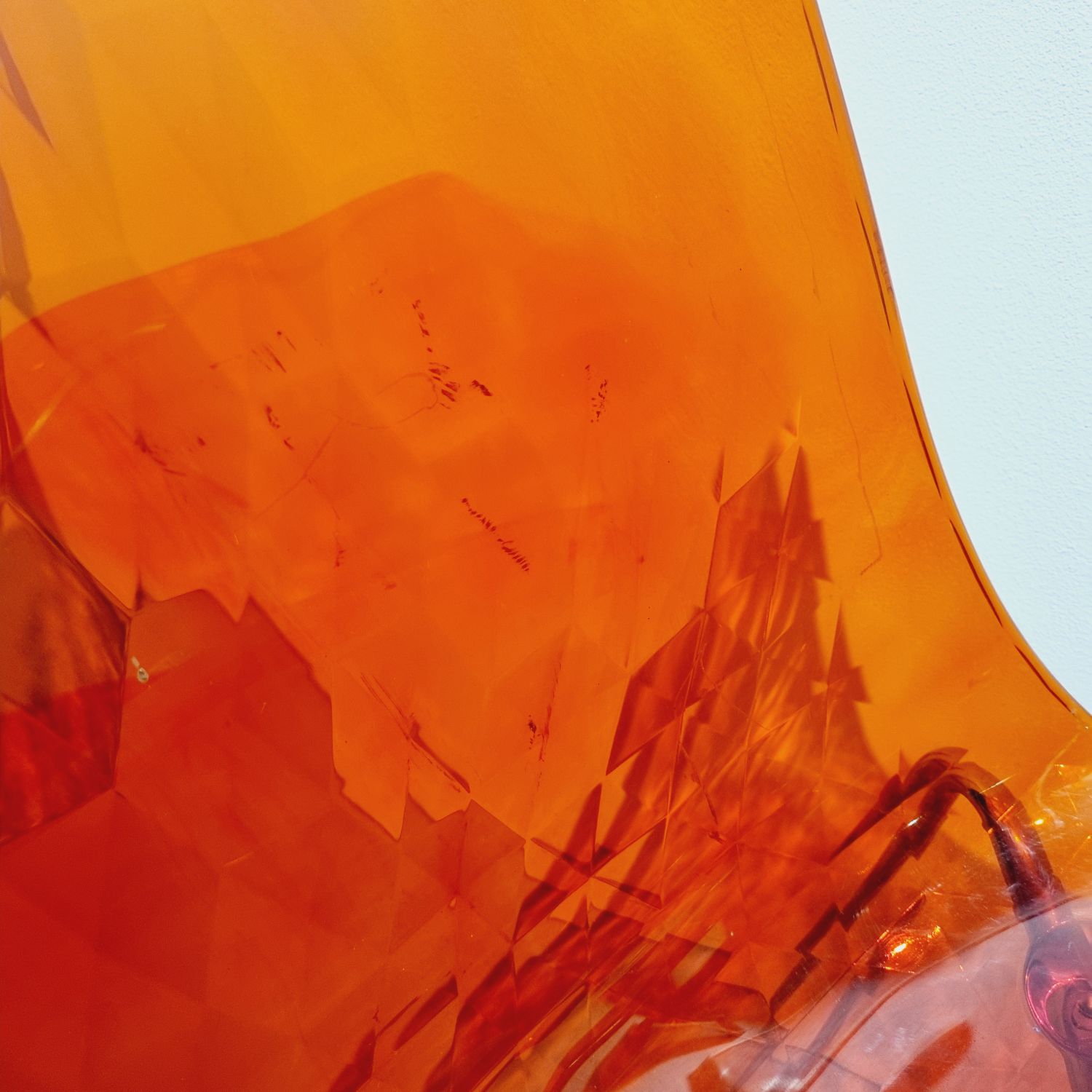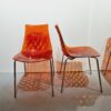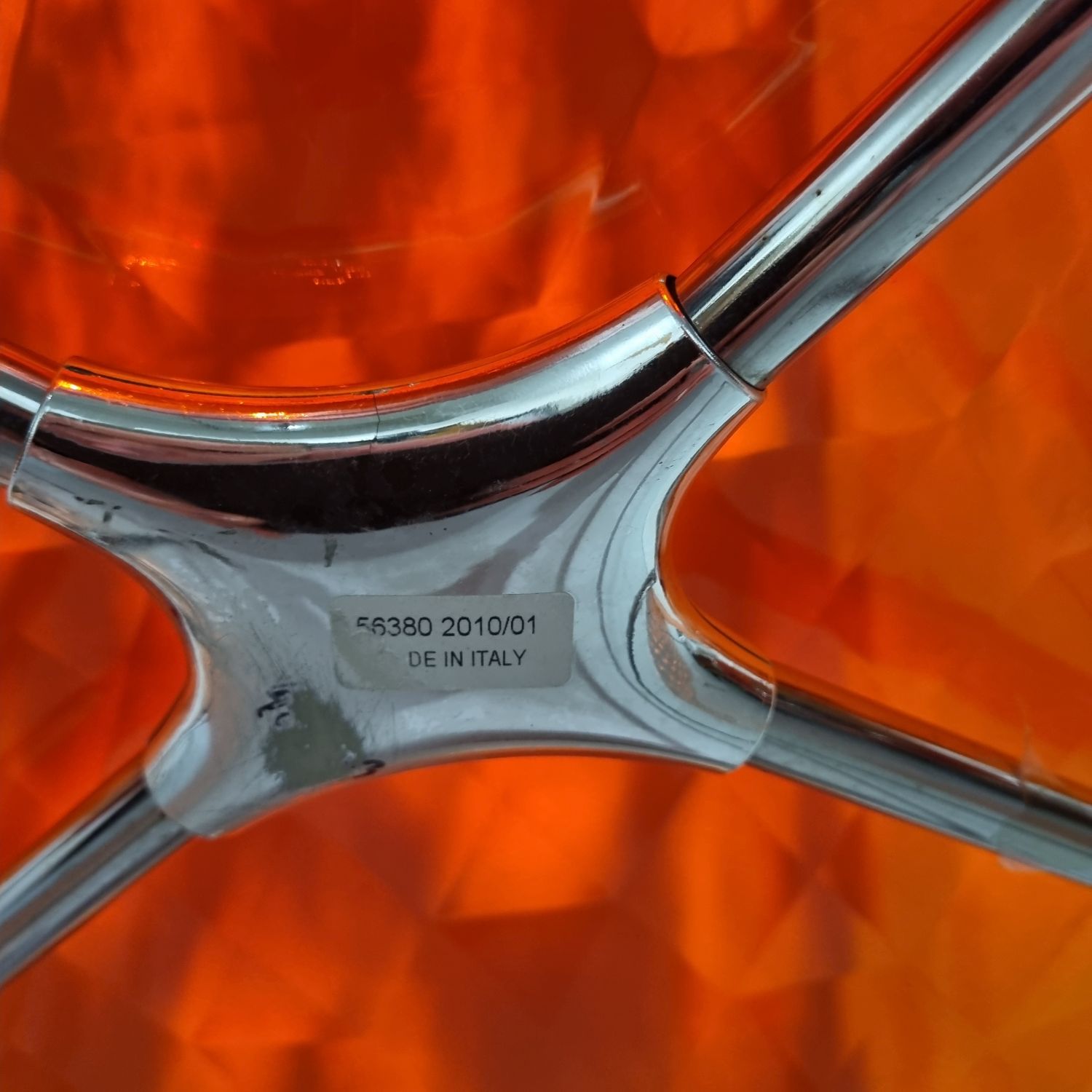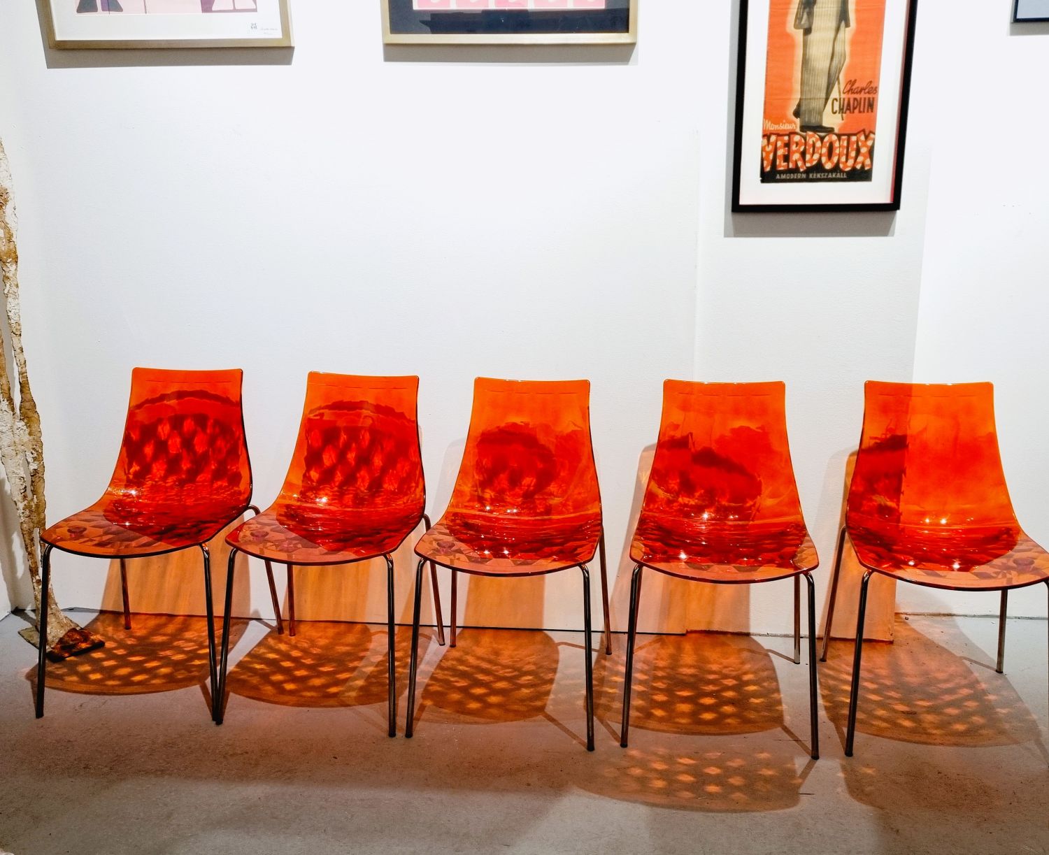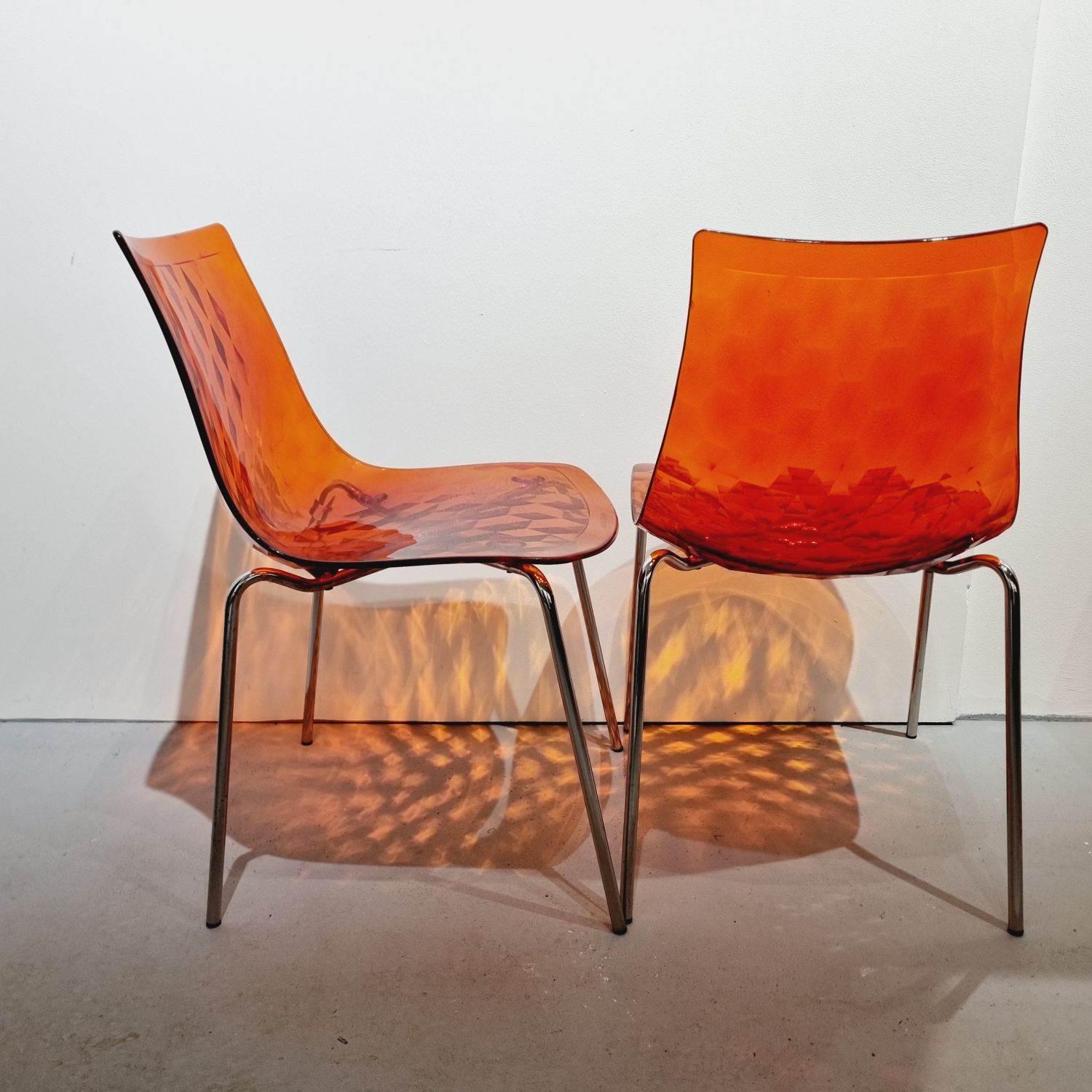 Az olasz Calligaris márka egyik legikonikusabb darabja, az Ice chair. Krómozott fémlábak és az áttetsző ülőrész miatt a szék nem nehezíti el a teret, kisebb helyiségekben is jól mutat. Belső felülete texturált, gyémántmintás csiszolásra emlékeztet, ami megtöri a fényt, így a szék drágakőszerűen csillog. Használatból eredő karc előfordulhat rajta. a székek állapotát a fotók hűen tükrözik.