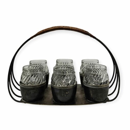 Hatszemélyes borospohár készlet ezüstözött réz pohártartó kosárral az 1930-as évekből