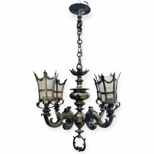 Antik flamand stílusú bronz csillár 4 karral, rácsos opálüveg búrákkal. Elegáns kivitelezés, egyedi stílus jellemzi. Működőképes, korának megfelelő állapotú.Méretei: 80 x 50 x 50 cm.