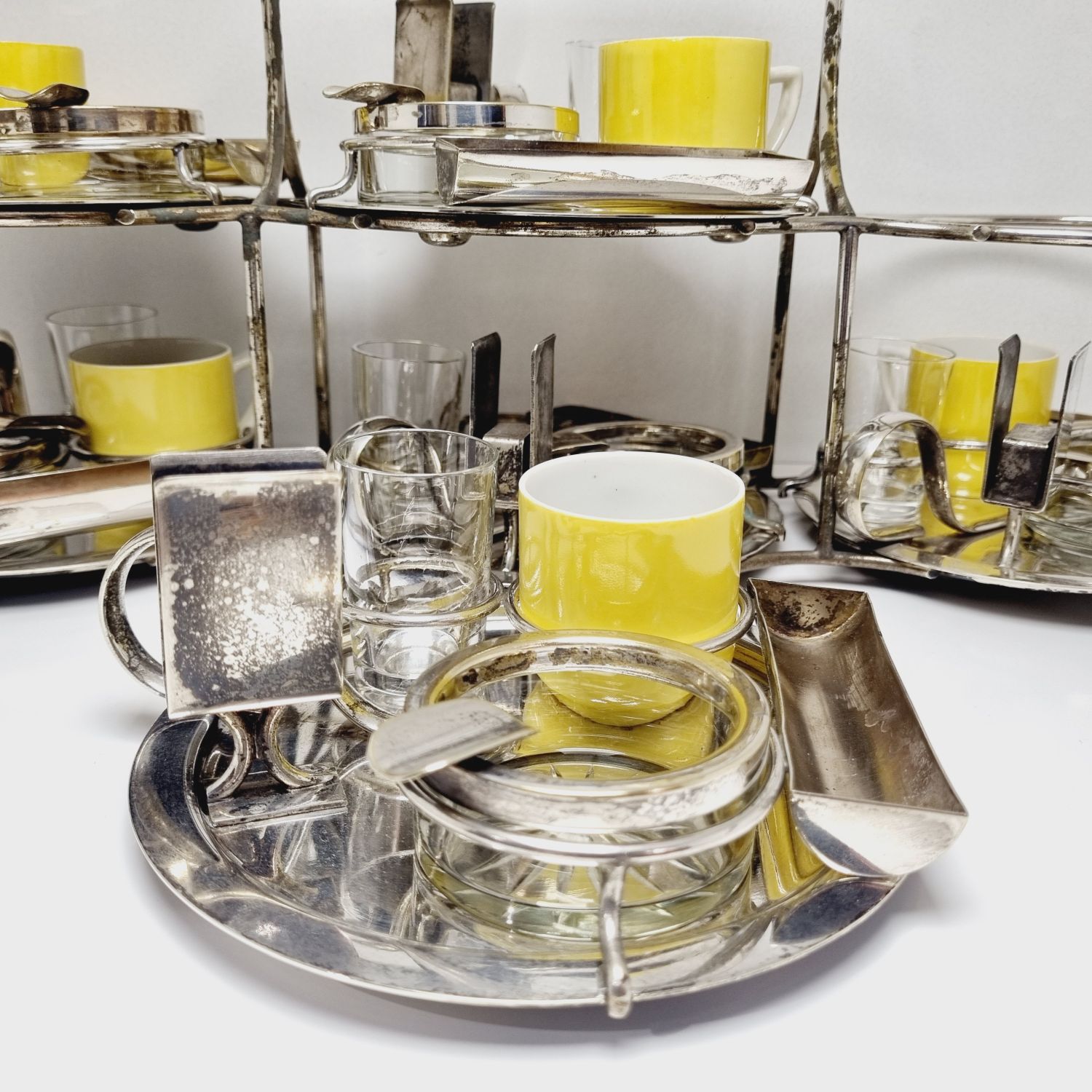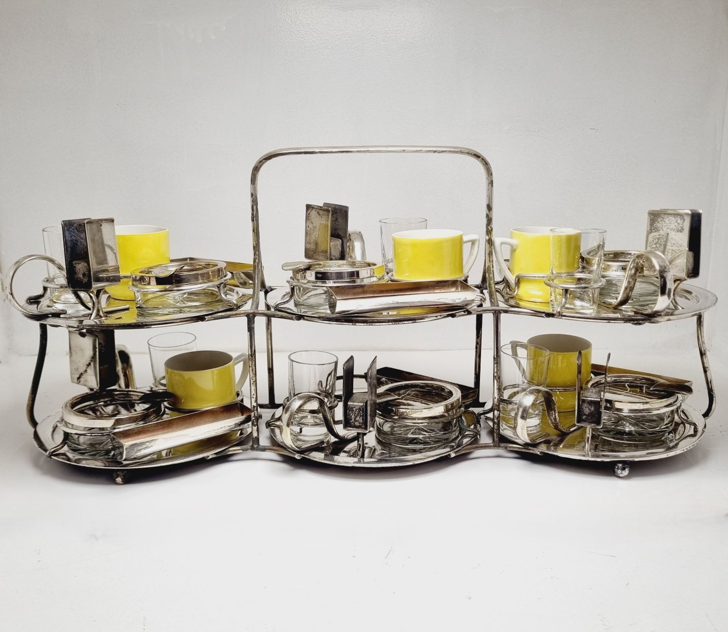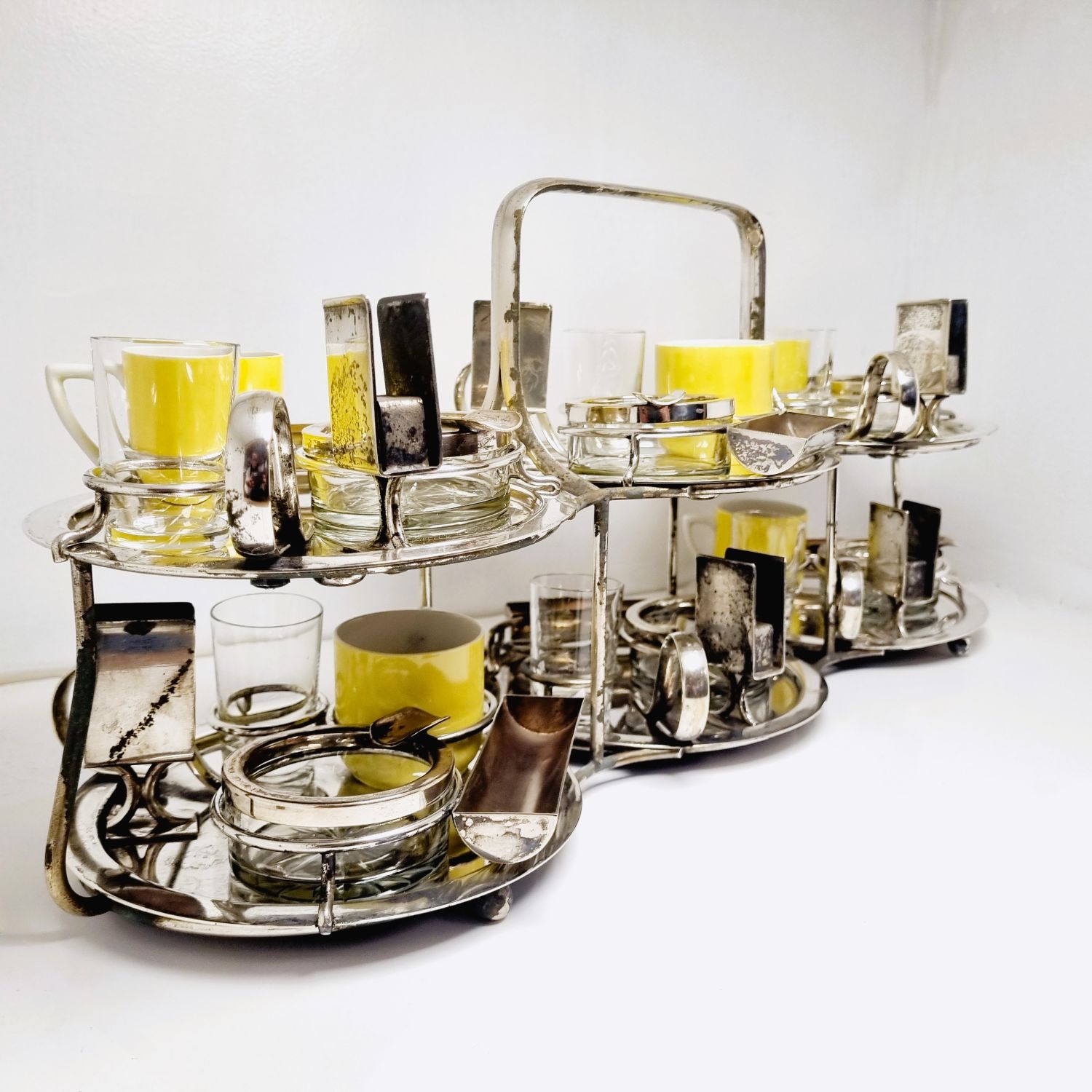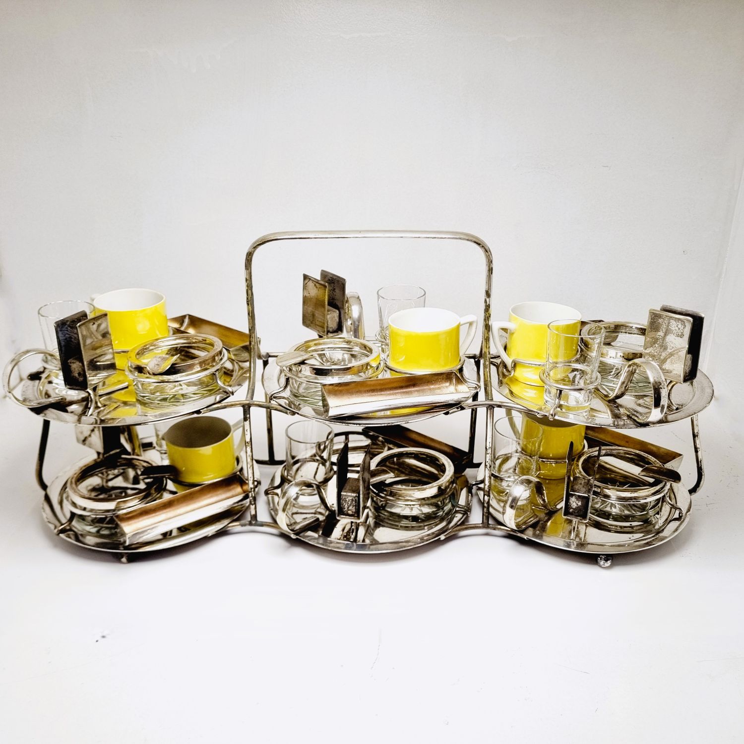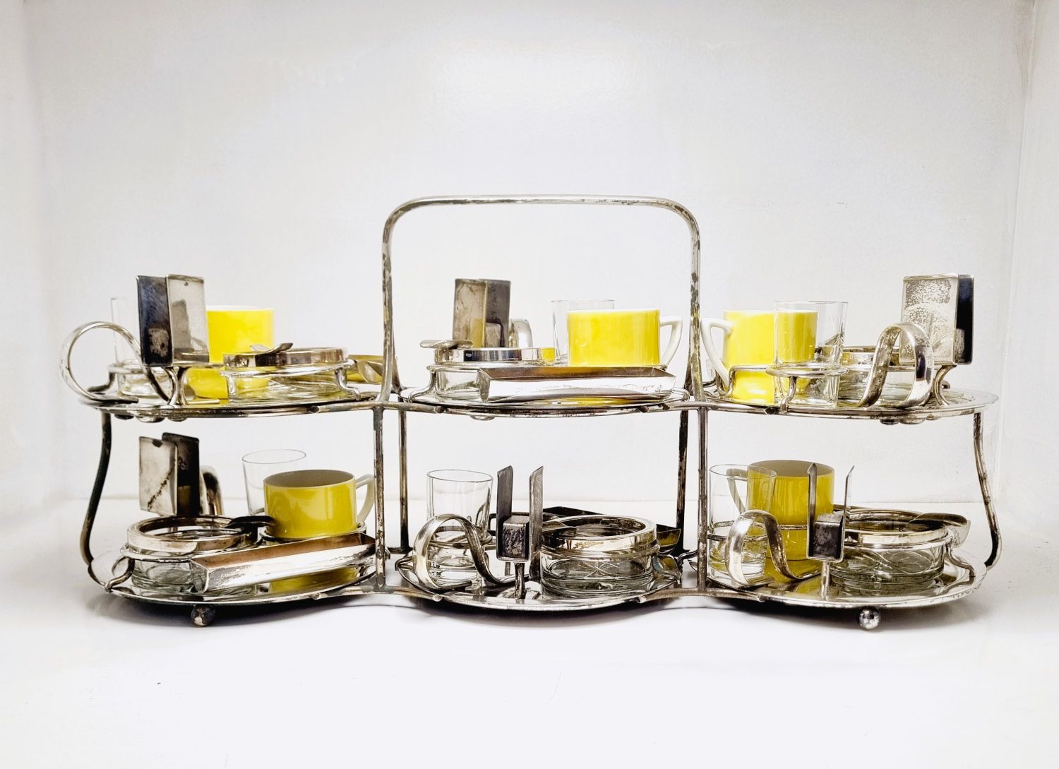 Kávéházi 6 személyes alpakka szett, dohányzásra is alkalmas kiegészítőkkel. Porceláncsészés, üvegbetétes -melyből 1 csésze hiányzik. Érdekes, praktikus kiegészítő egy vintage hangulatú kávézóban, mely a 30-as évek hangulatát idézi. Korának megfelelő állapotú.