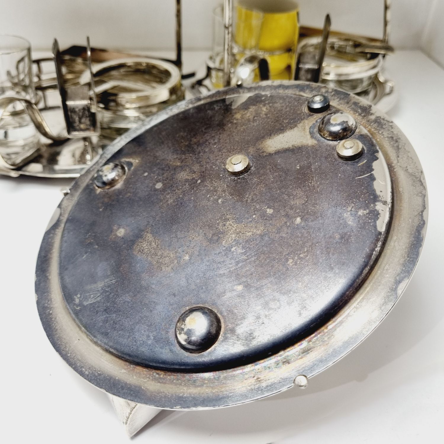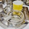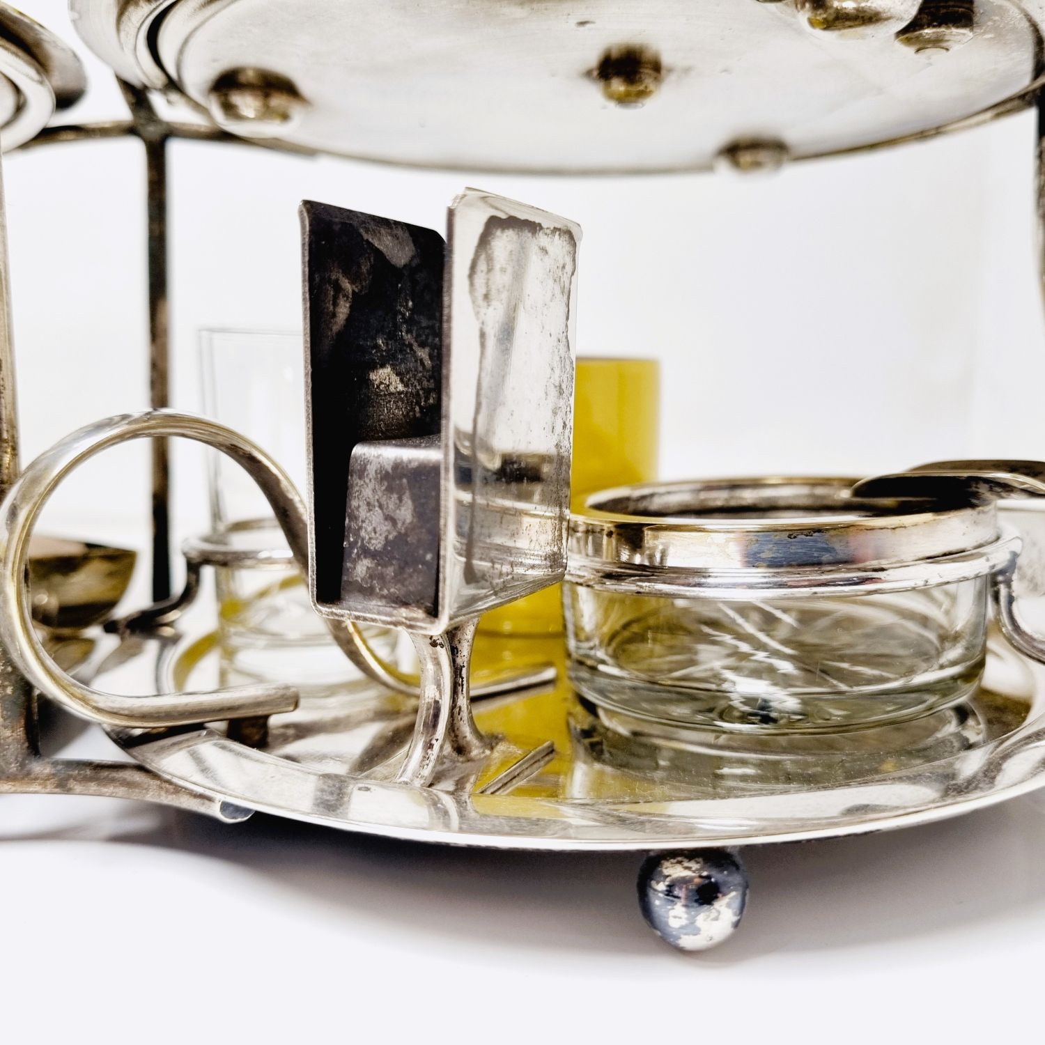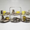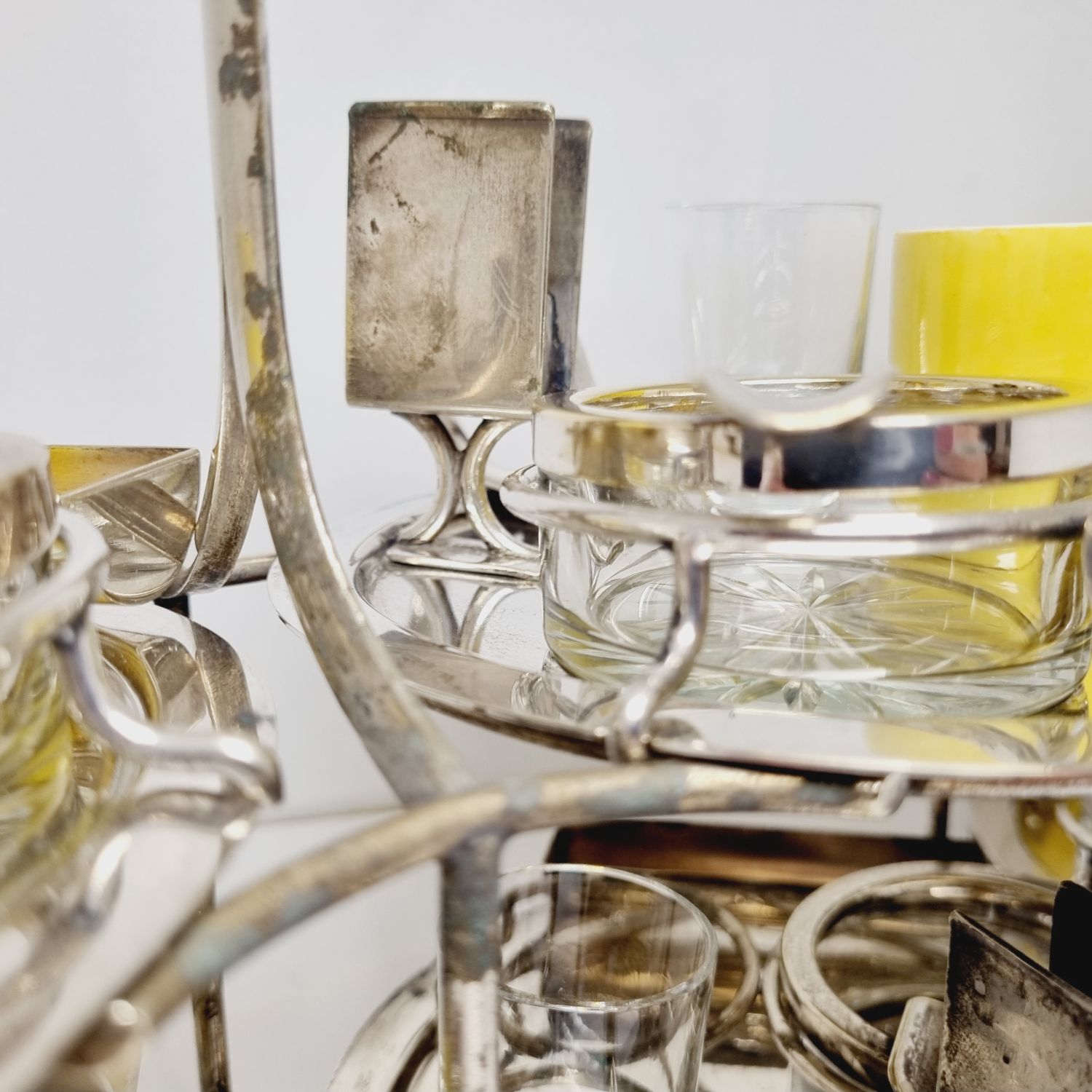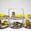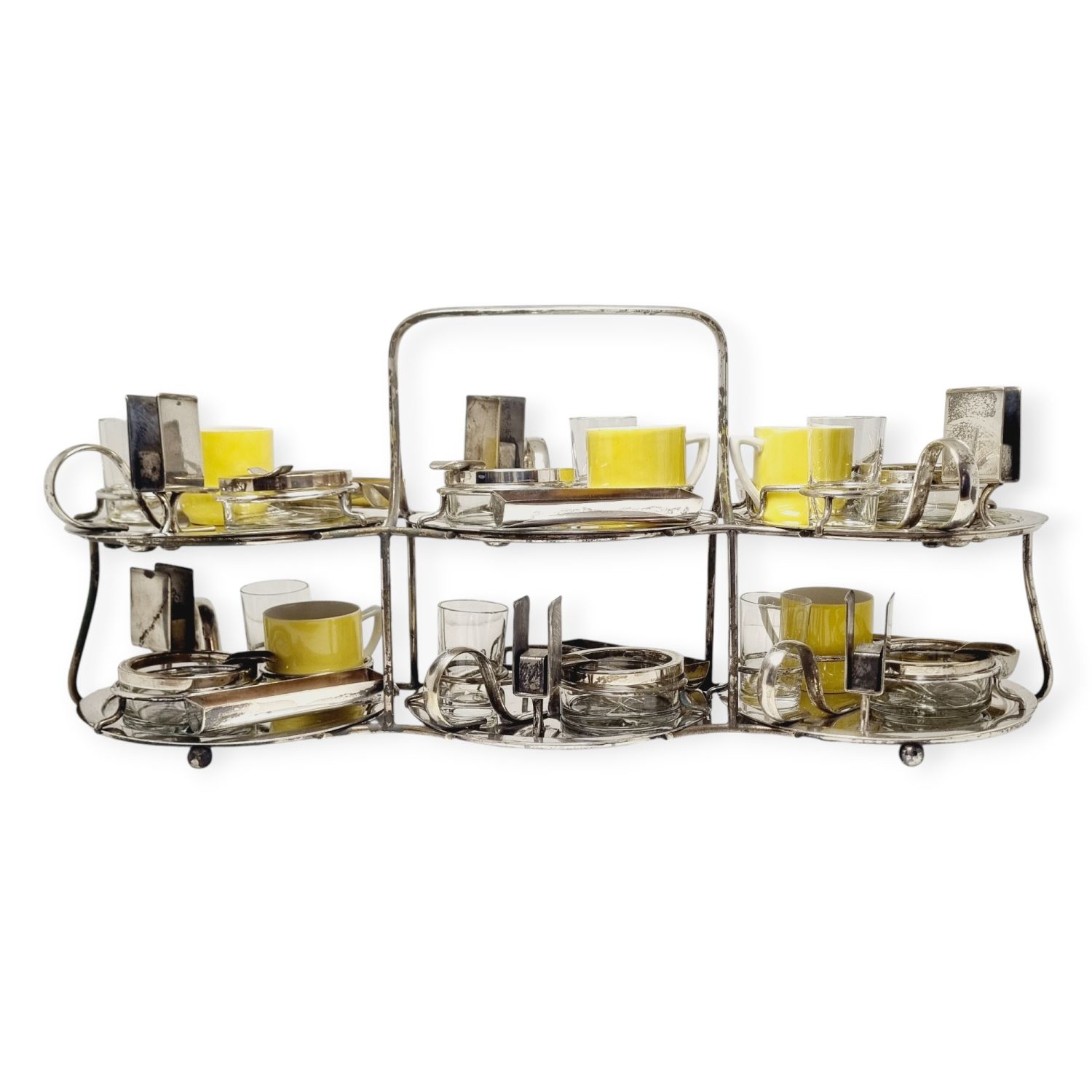 Kávéházi 6 személyes alpakka szett, dohányzásra is alkalmas kiegészítőkkel. Porceláncsészés, üvegbetétes -melyből 1 csésze hiányzik. Érdekes, praktikus kiegészítő egy vintage hangulatú kávézóban, mely a 30-as évek hangulatát idézi. Korának megfelelő állapotú.