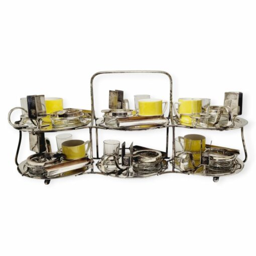 Kávéházi 6 személyes alpakka szett, dohányzásra is alkalmas kiegészítőkkel. Porceláncsészés, üvegbetétes -melyből 1 csésze hiányzik. Érdekes, praktikus kiegészítő egy vintage hangulatú kávézóban, mely a 30-as évek hangulatát idézi. Korának megfelelő állapotú.