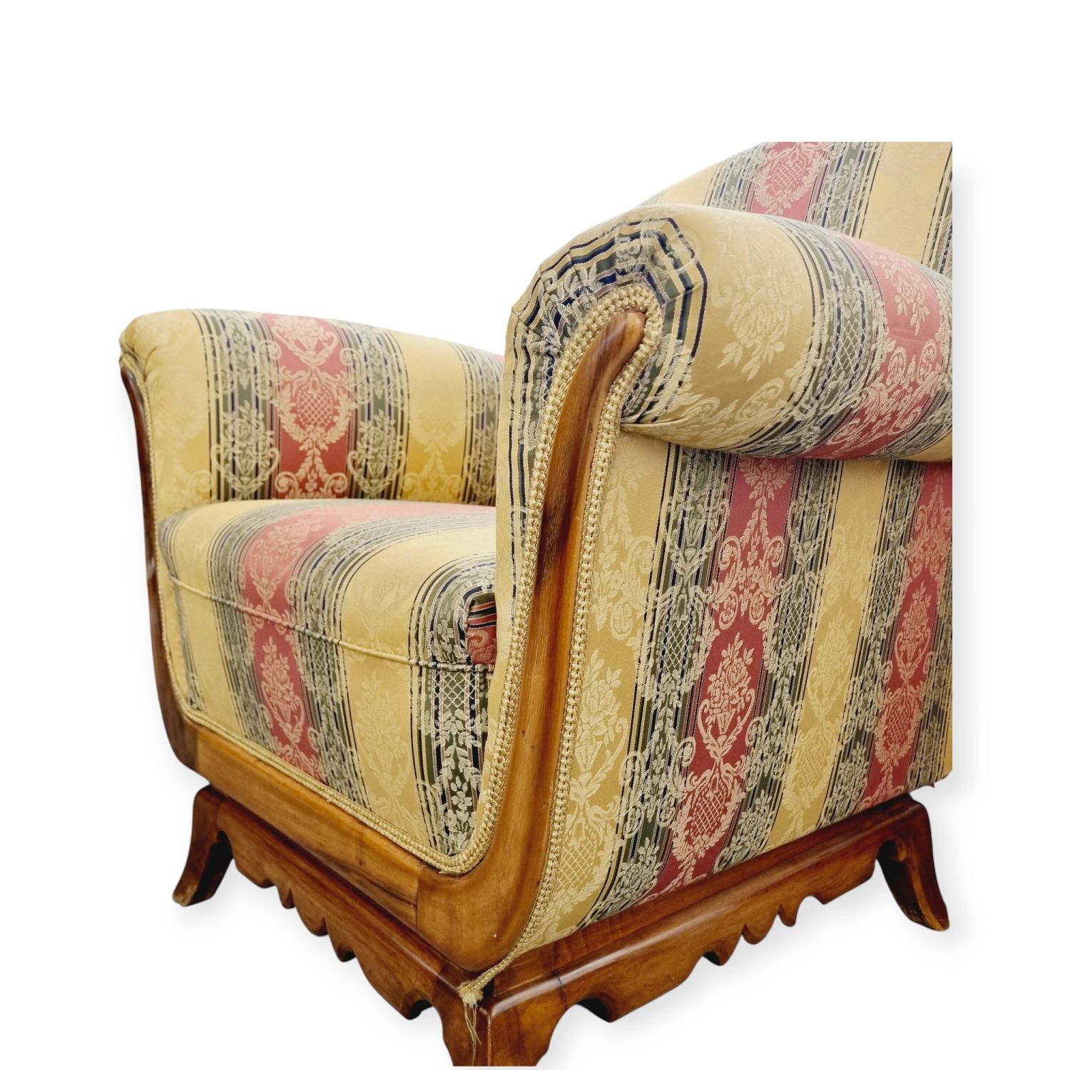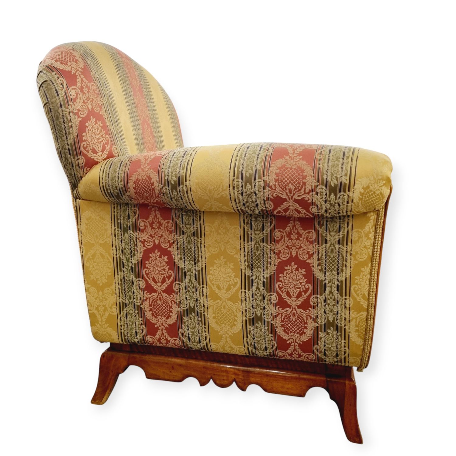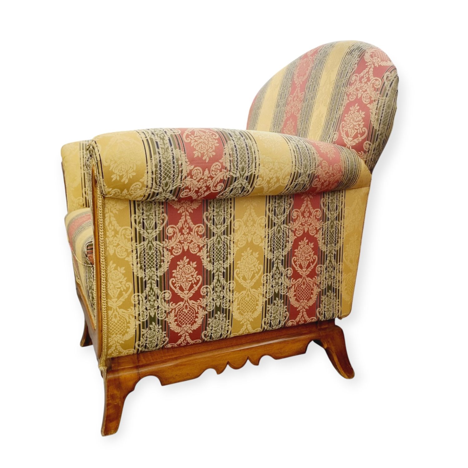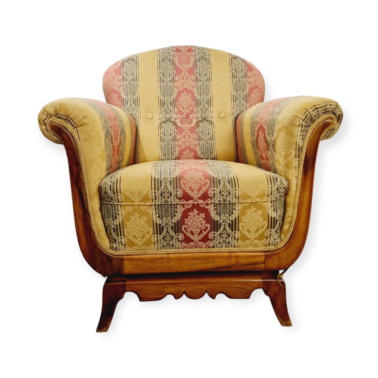 Klasszikus, biedermeier stílusjegyeket hordozó art deco fotel az 1930-as évekből. Nagyon szép, azonnal lakásba tehető állaporban.