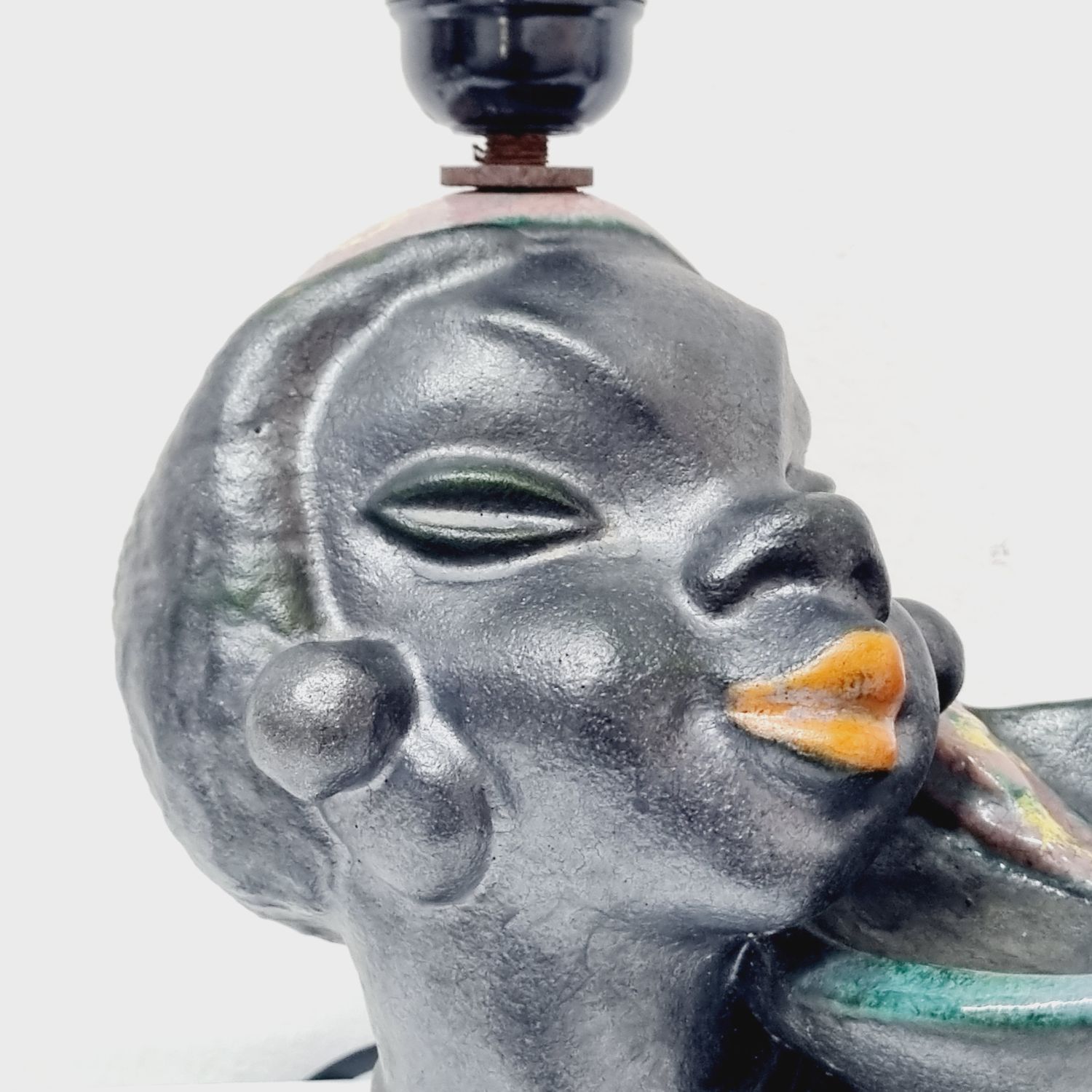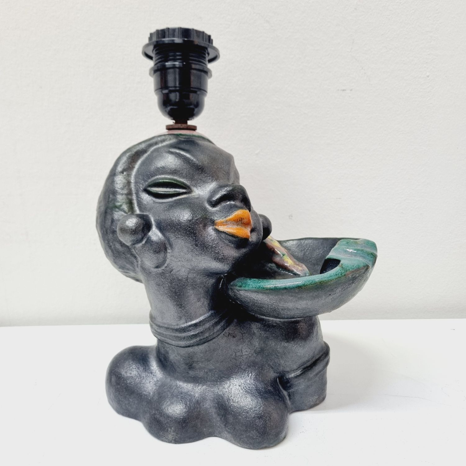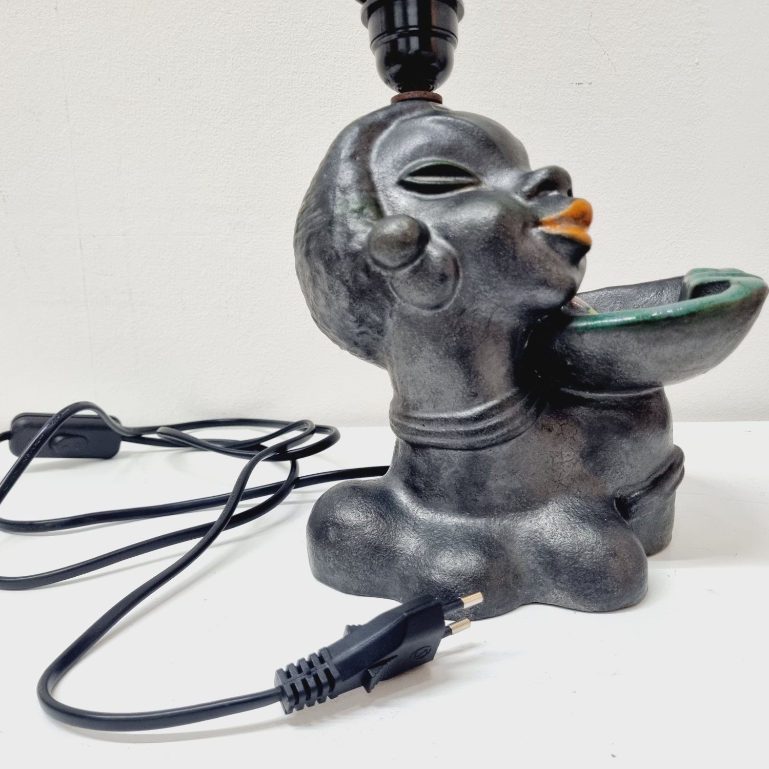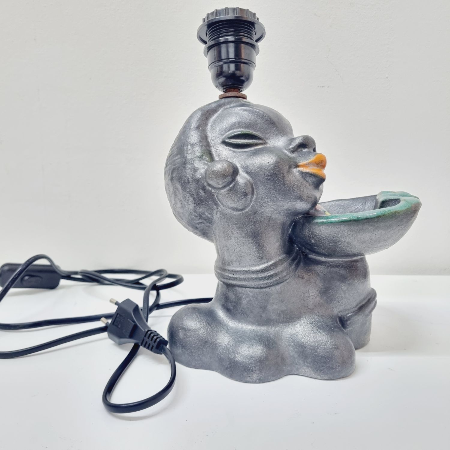 Art deco kerámia lámpa az 1930-as évekből. Stilizált néger női figurát ábrázoló büszt lámpával kombinálva. Hibátlan, elektromosan felújított. Jelzés nélküli, egyedi hangulatú lakberendezési kiegészítő.