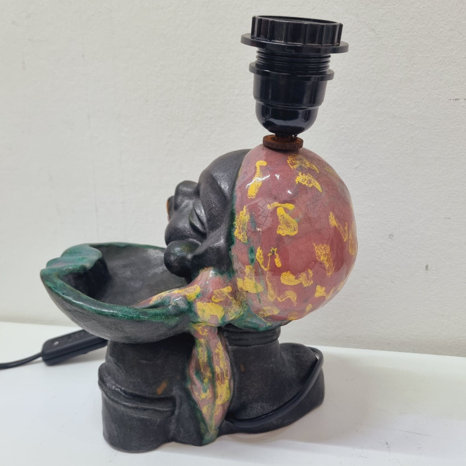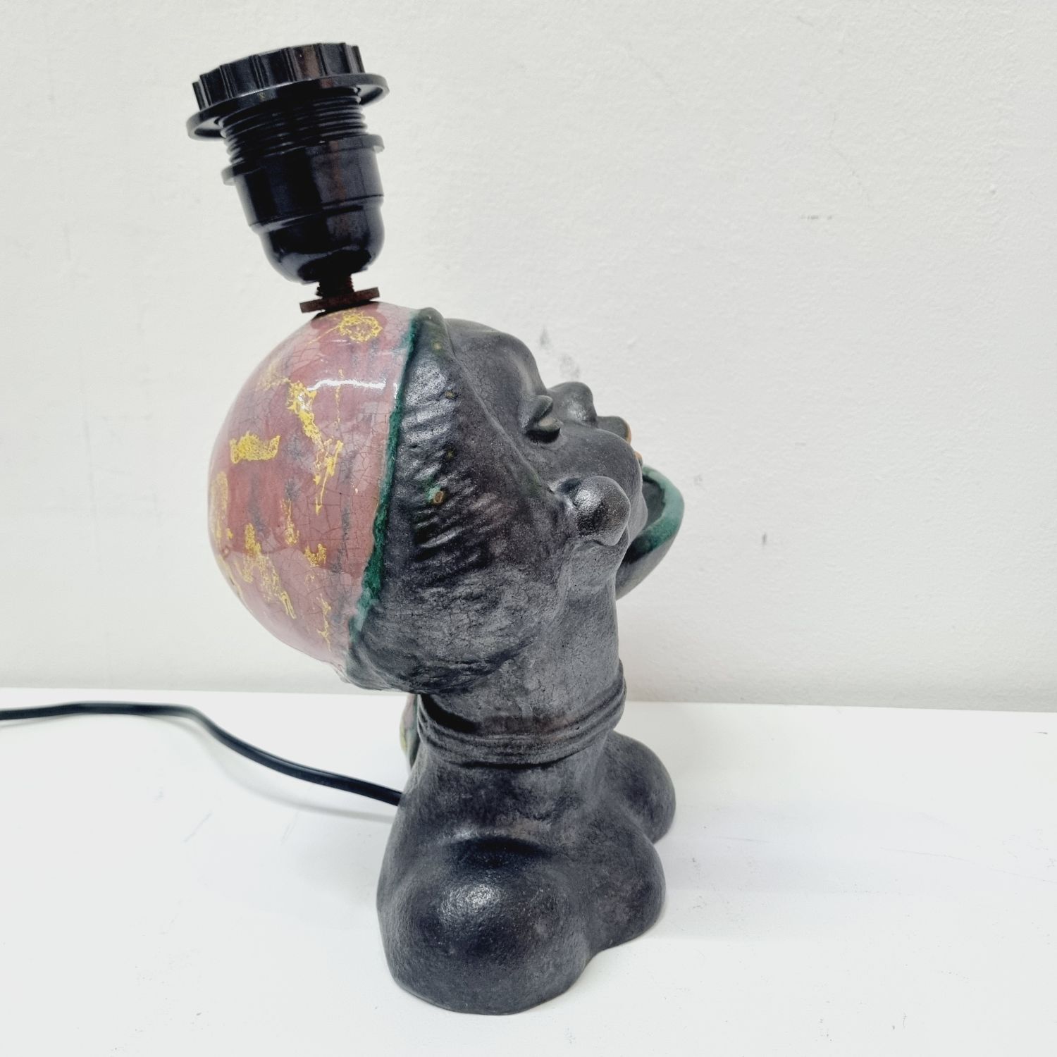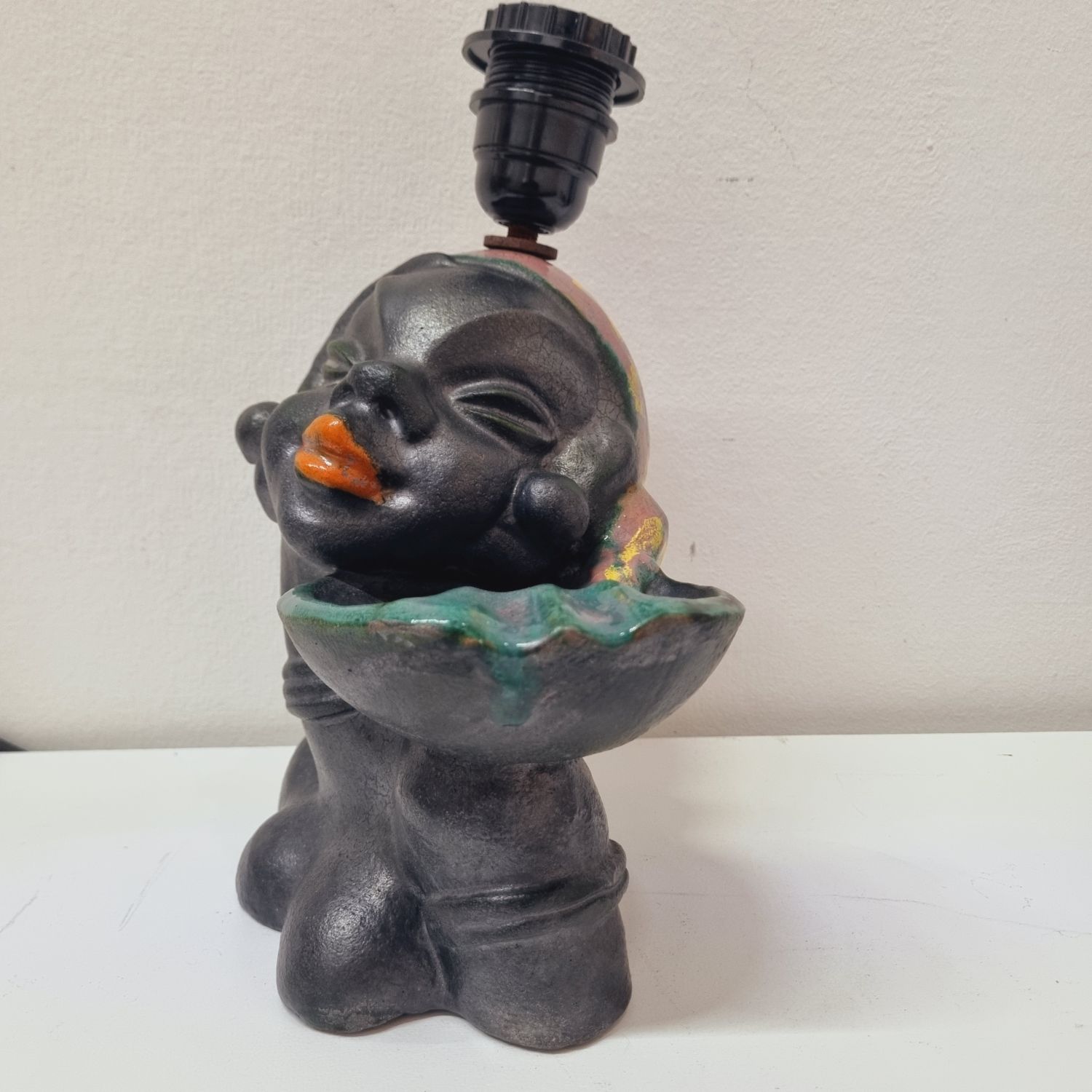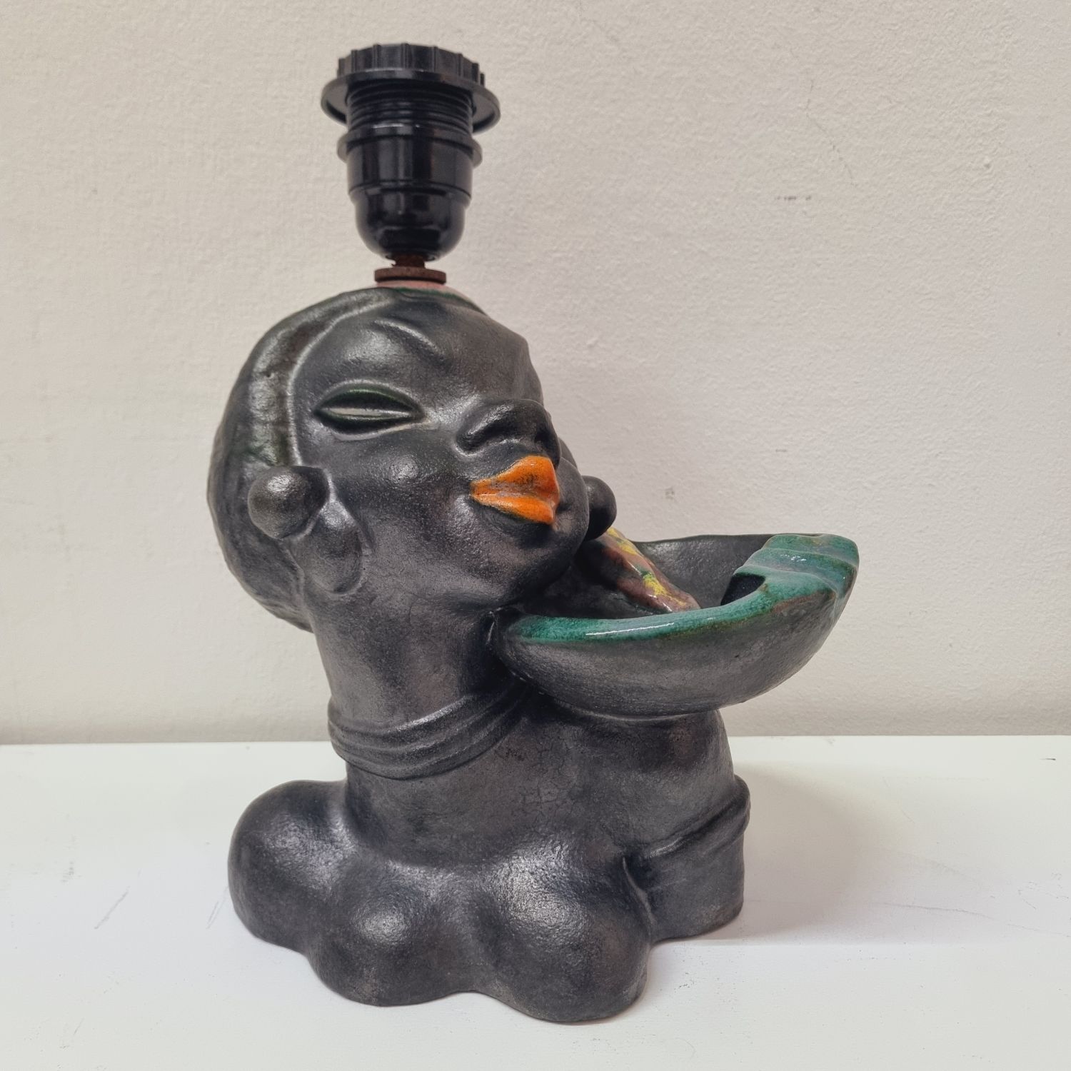 Art deco kerámia lámpa az 1930-as évekből. Stilizált néger női figurát ábrázoló büszt lámpával kombinálva. Hibátlan, elektromosan felújított. Jelzés nélküli, egyedi hangulatú lakberendezési kiegészítő.