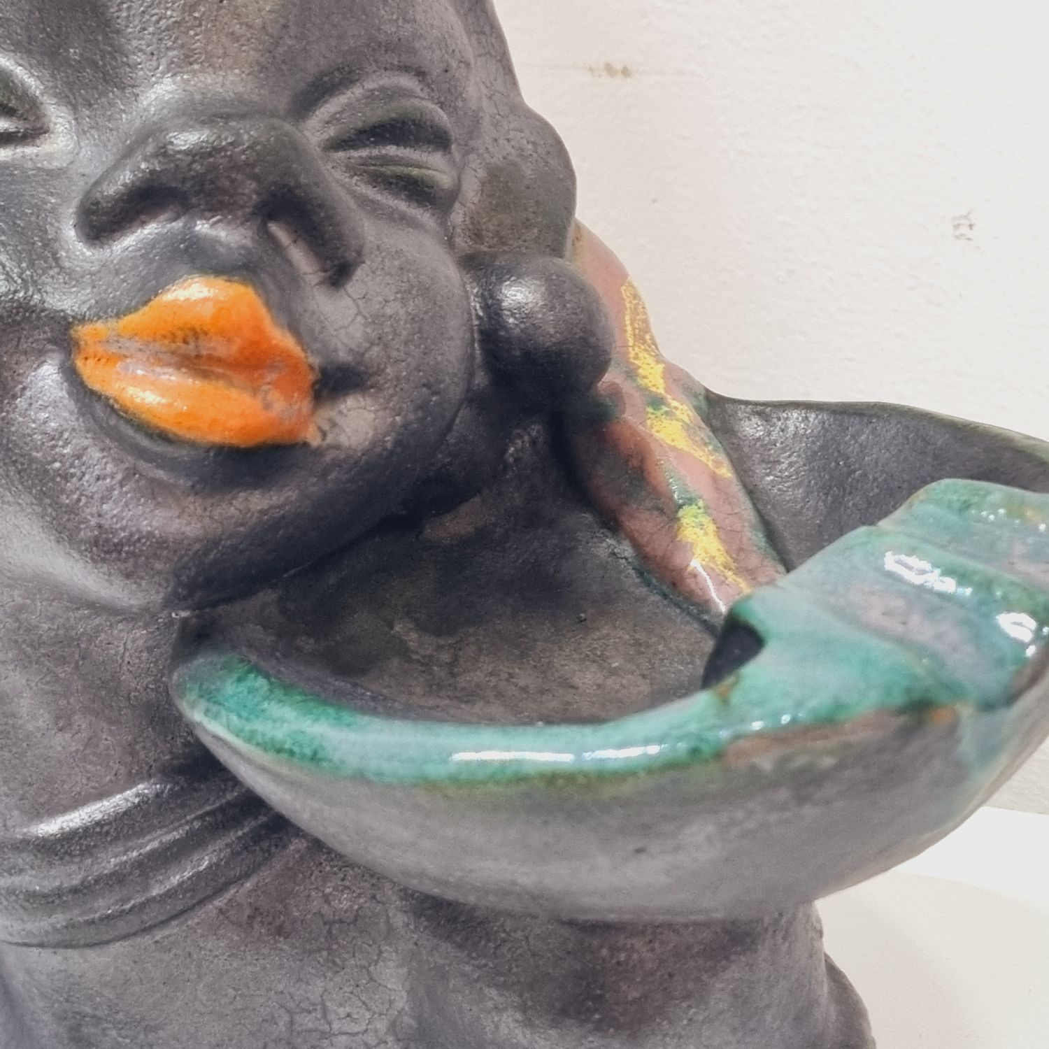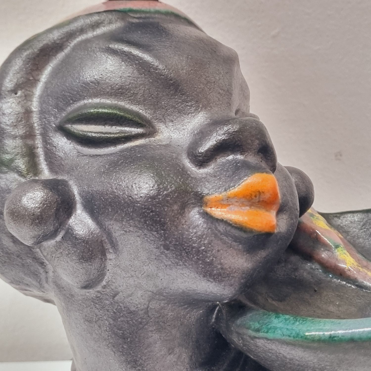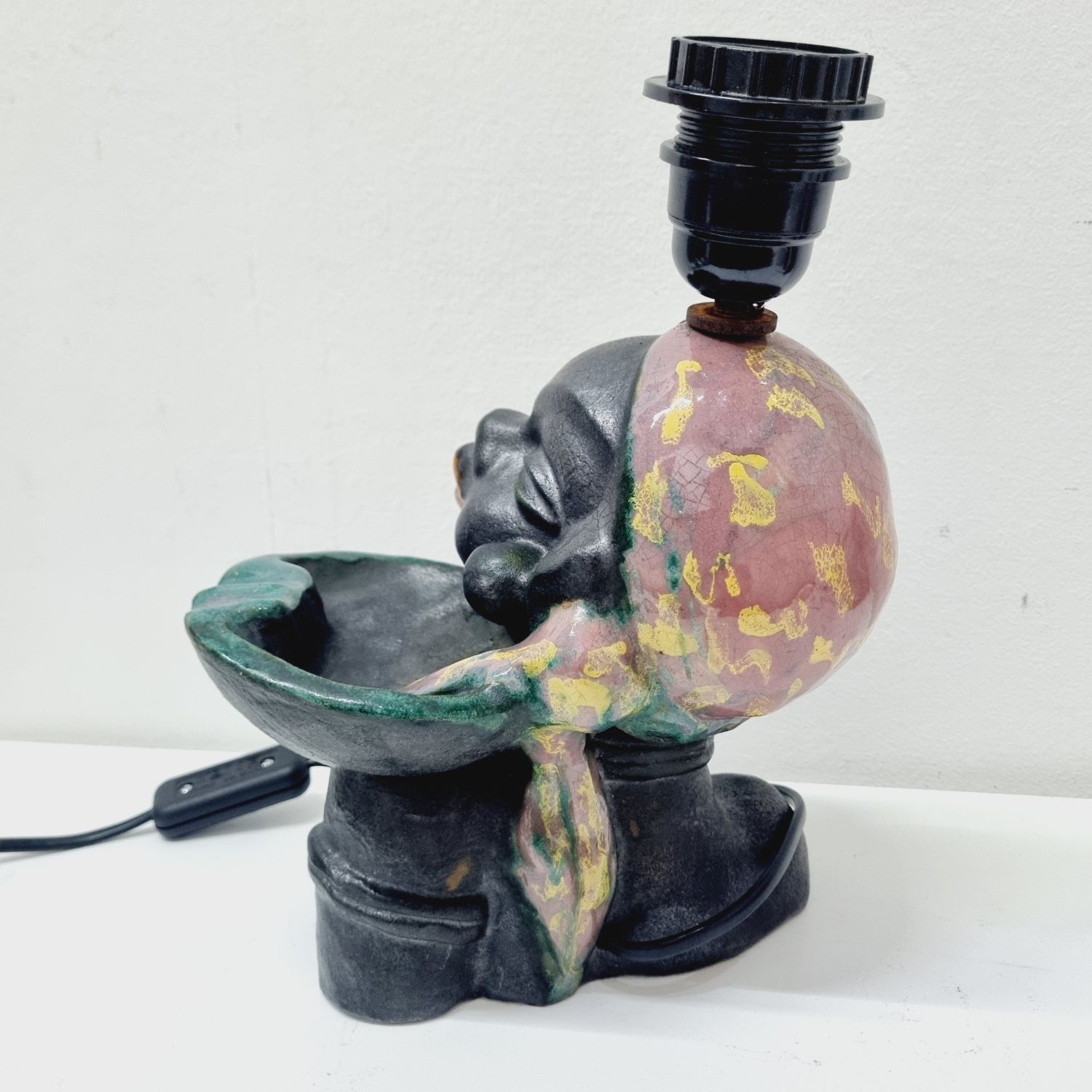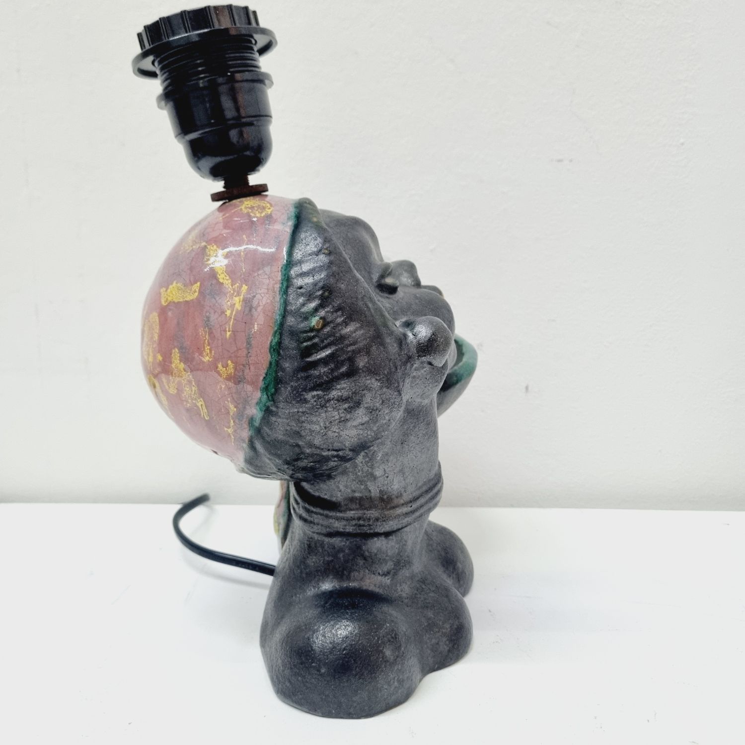 Art deco kerámia lámpa az 1930-as évekből. Stilizált néger női figurát ábrázoló büszt lámpával kombinálva. Hibátlan, elektromosan felújított. Jelzés nélküli, egyedi hangulatú lakberendezési kiegészítő.