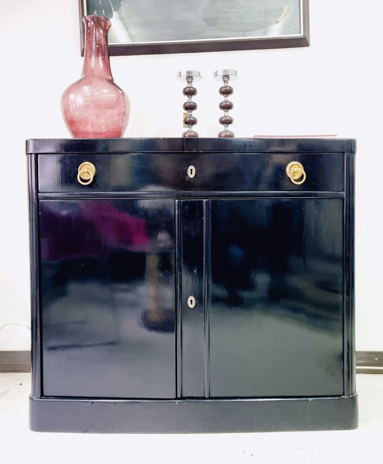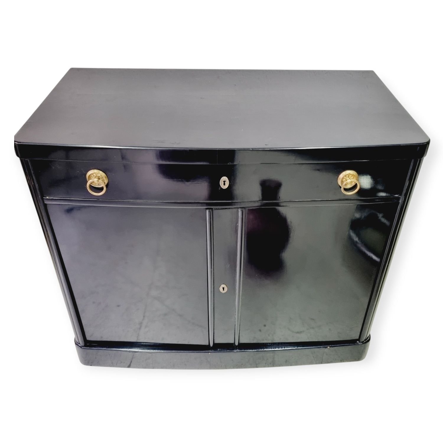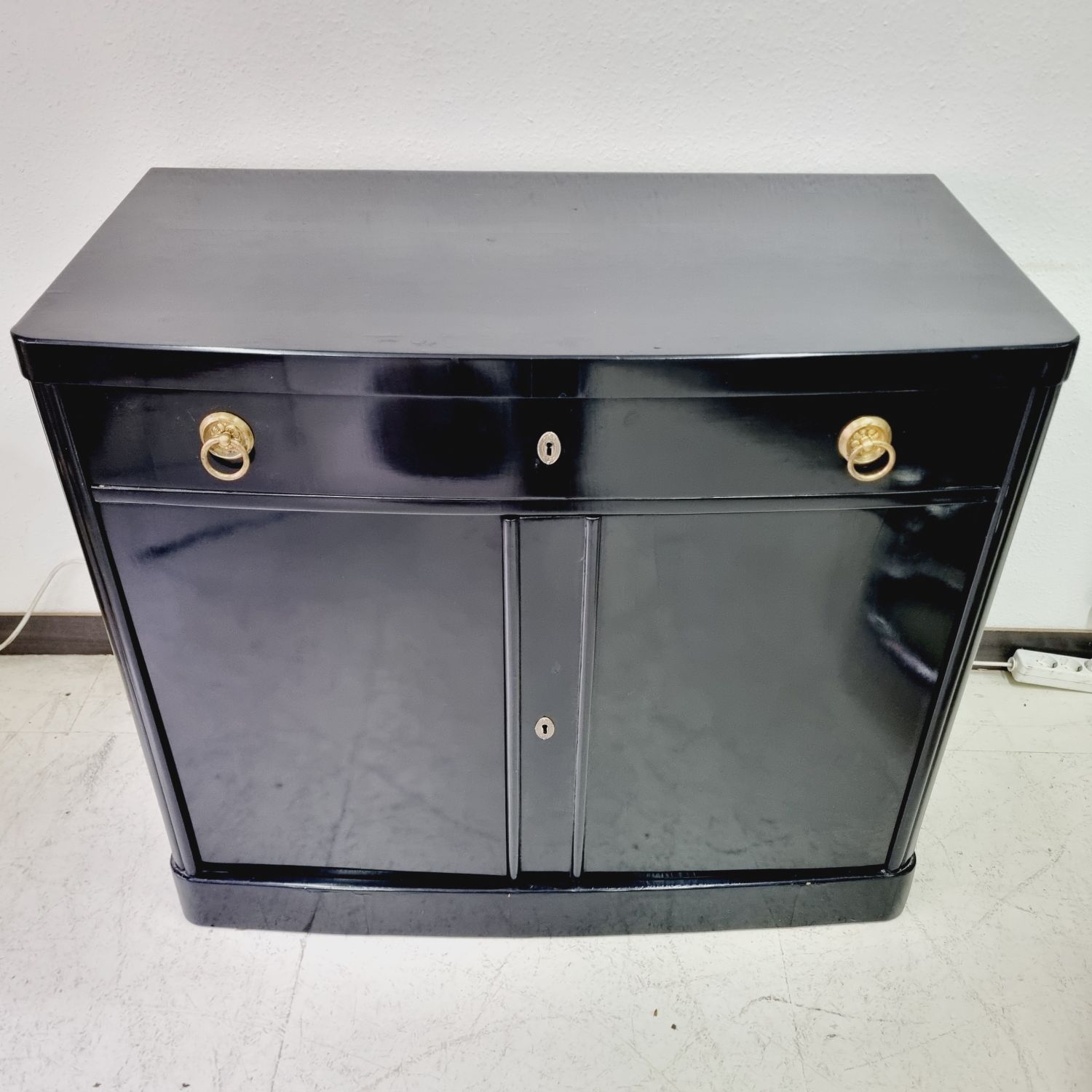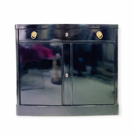 Elegáns, felül osztott fiókos, alul polcos, ebonizált , fekete biedermeier szekrény, eredeti réz verettel. Praktikus, frissen restaurált