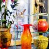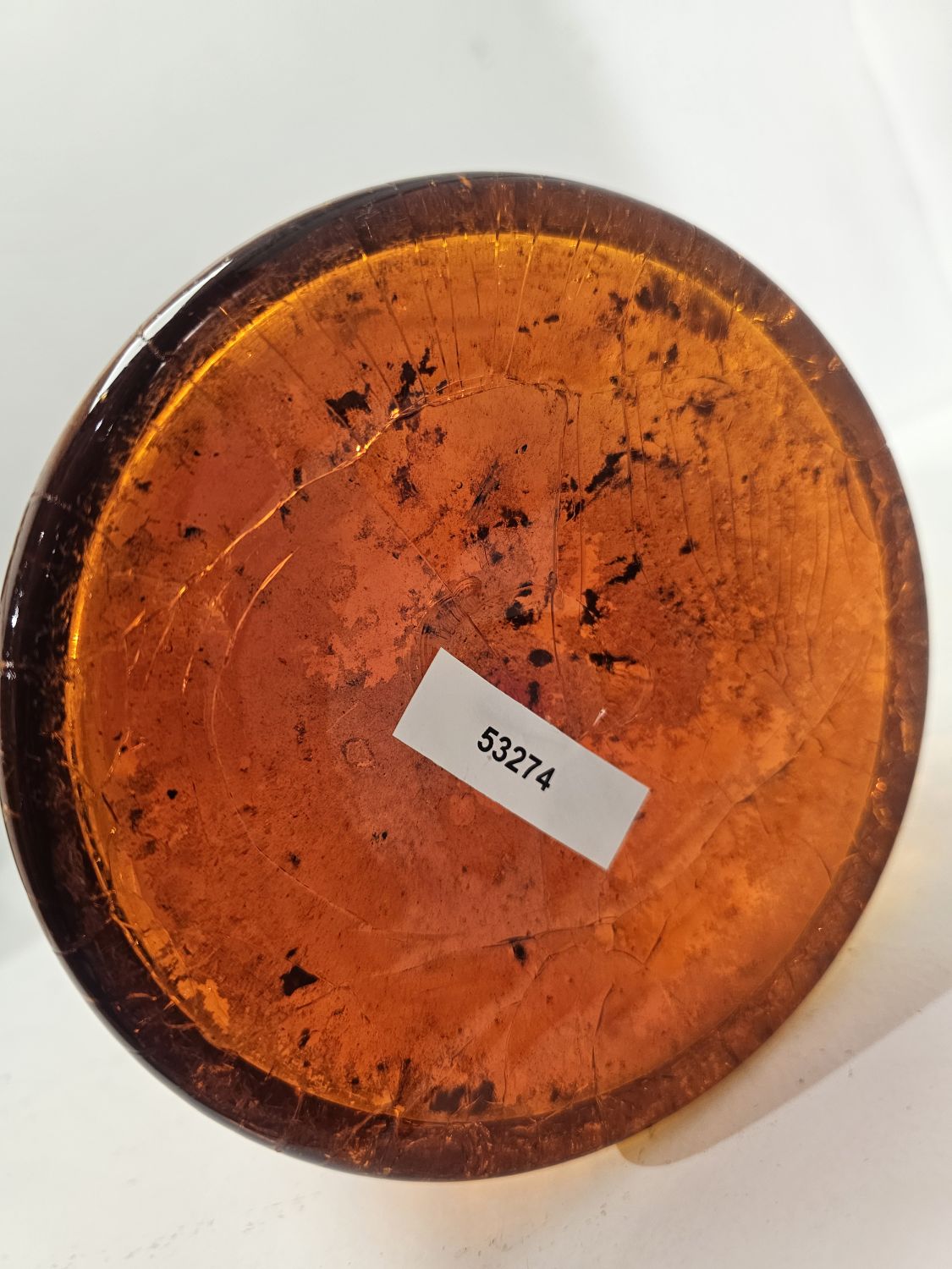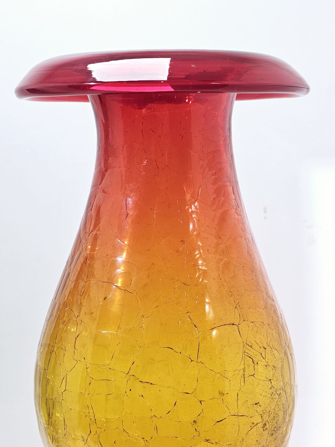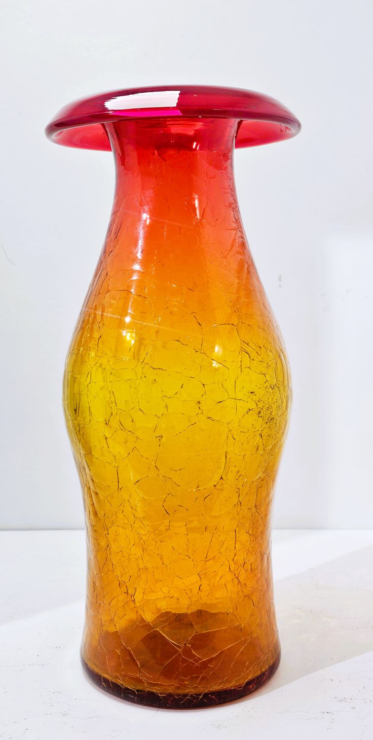 Repesztett üveg váza, tervezői darab. Joel Philip Myerc alkotása. 1966-ban került gyártásra a Blenco MCM üveggyár által. Színátmenetes, un.Mandarinváza. Méretei: 36 x 13 cm