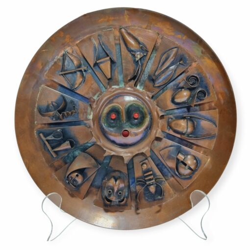 Bolba Henrik: Horoszkóp tál . Vörösréz iparművészeti fali relief az 1970-es évekből.Az ábrázolt motívumok és az arc stilizált jellege egyedi művészi alkotásra utal. Igényesen megtervezett és kidolgozott munka. Korának megfelelő állapotú. Méretei: 30 x 30 x 4 cm. Hátul jelezve.