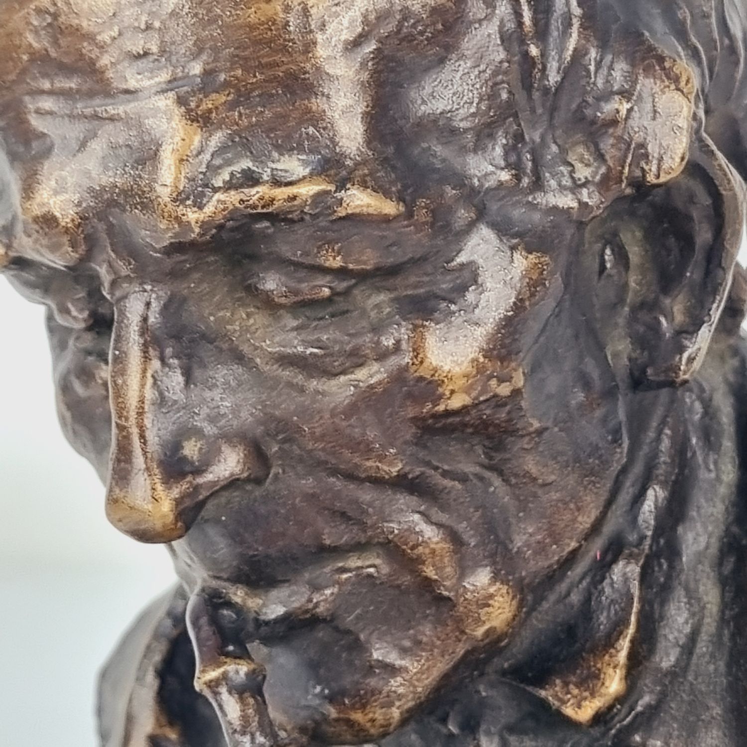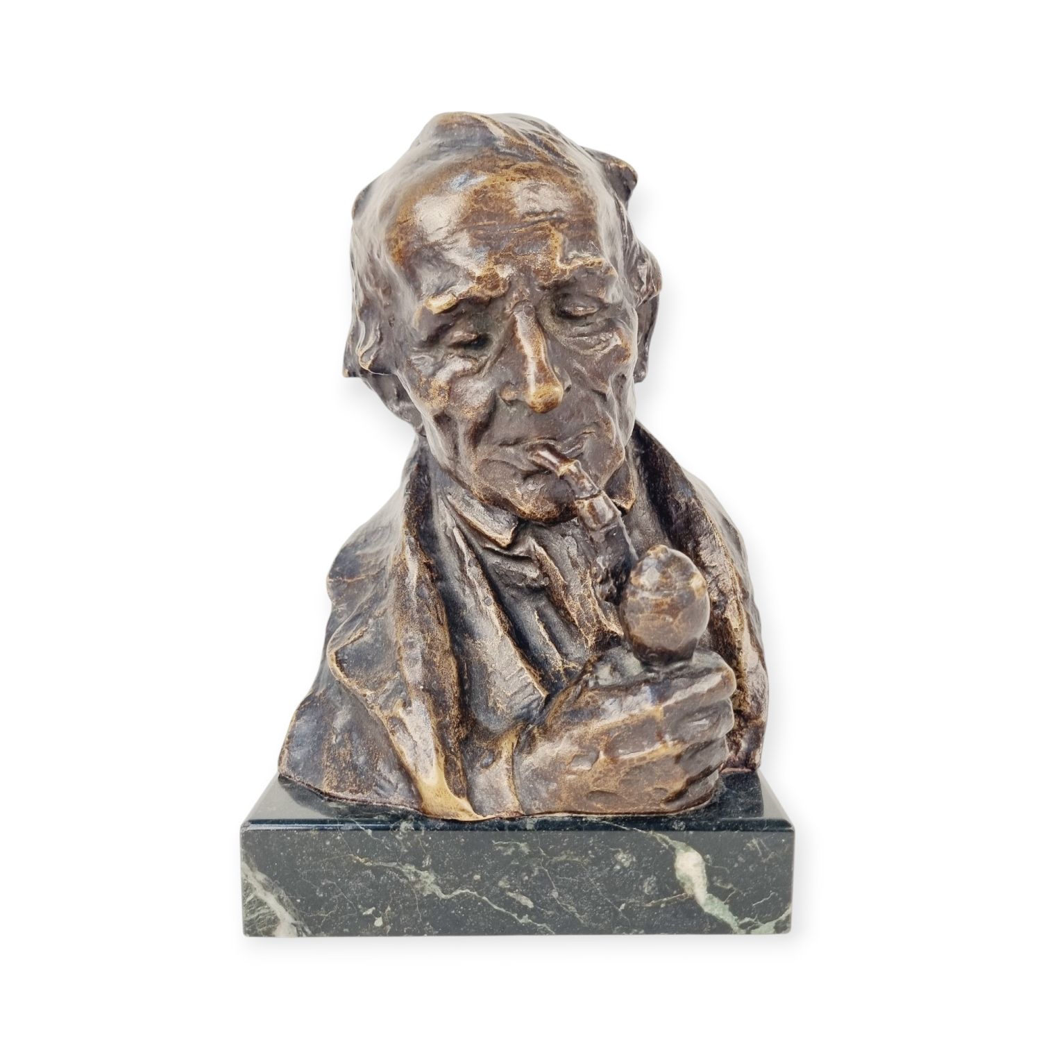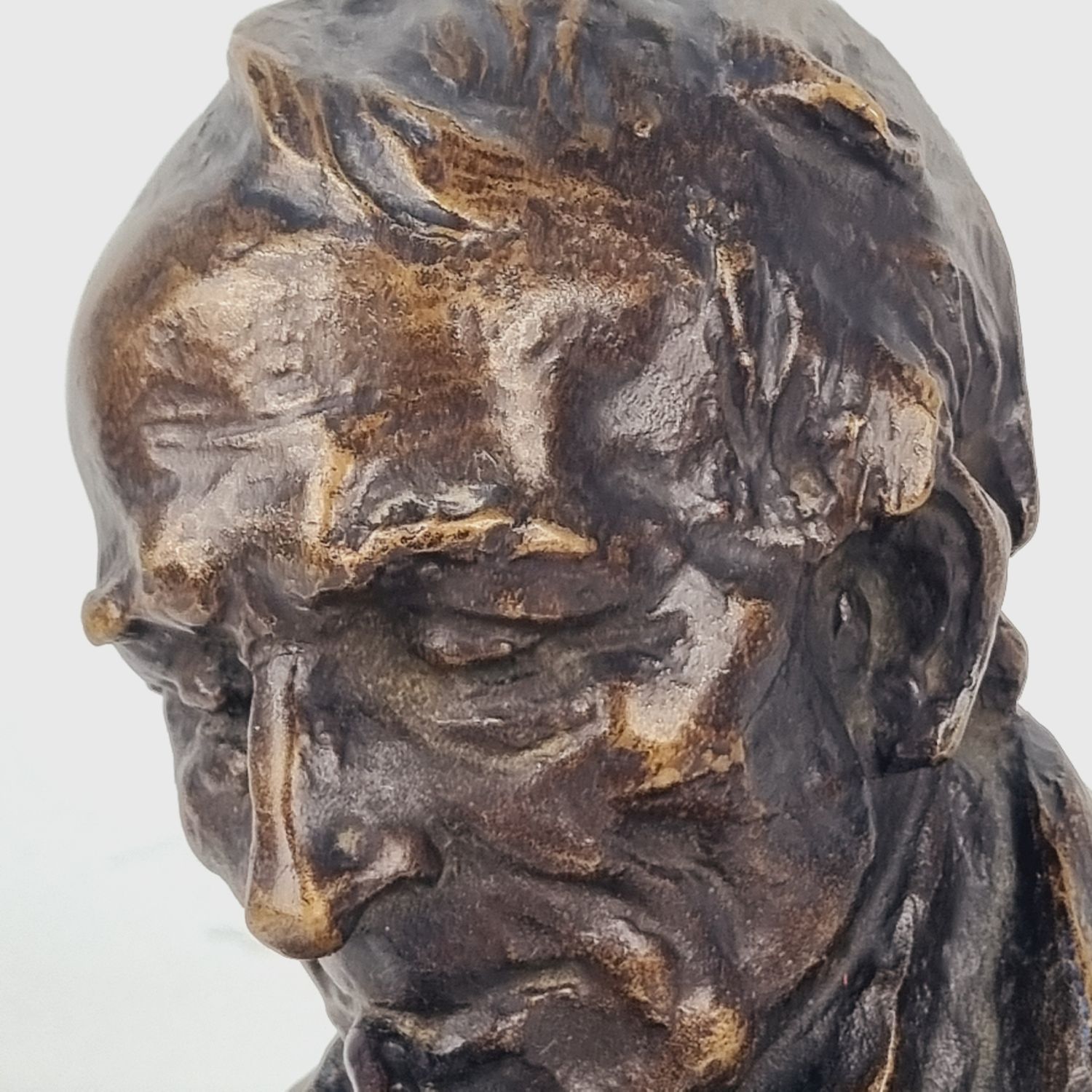 Hans Muller: Férfi mellszobor, bronz büszt az 1920-as évekből. Csodás karakterformálás, szép antik patina jellemzi. Hans Muller /1873-1937/ az egyik legnevesebb német portré mellszobrász és állatszobrász volt. Jelzett. Méretei: 20 x 13 x 13 cm.
