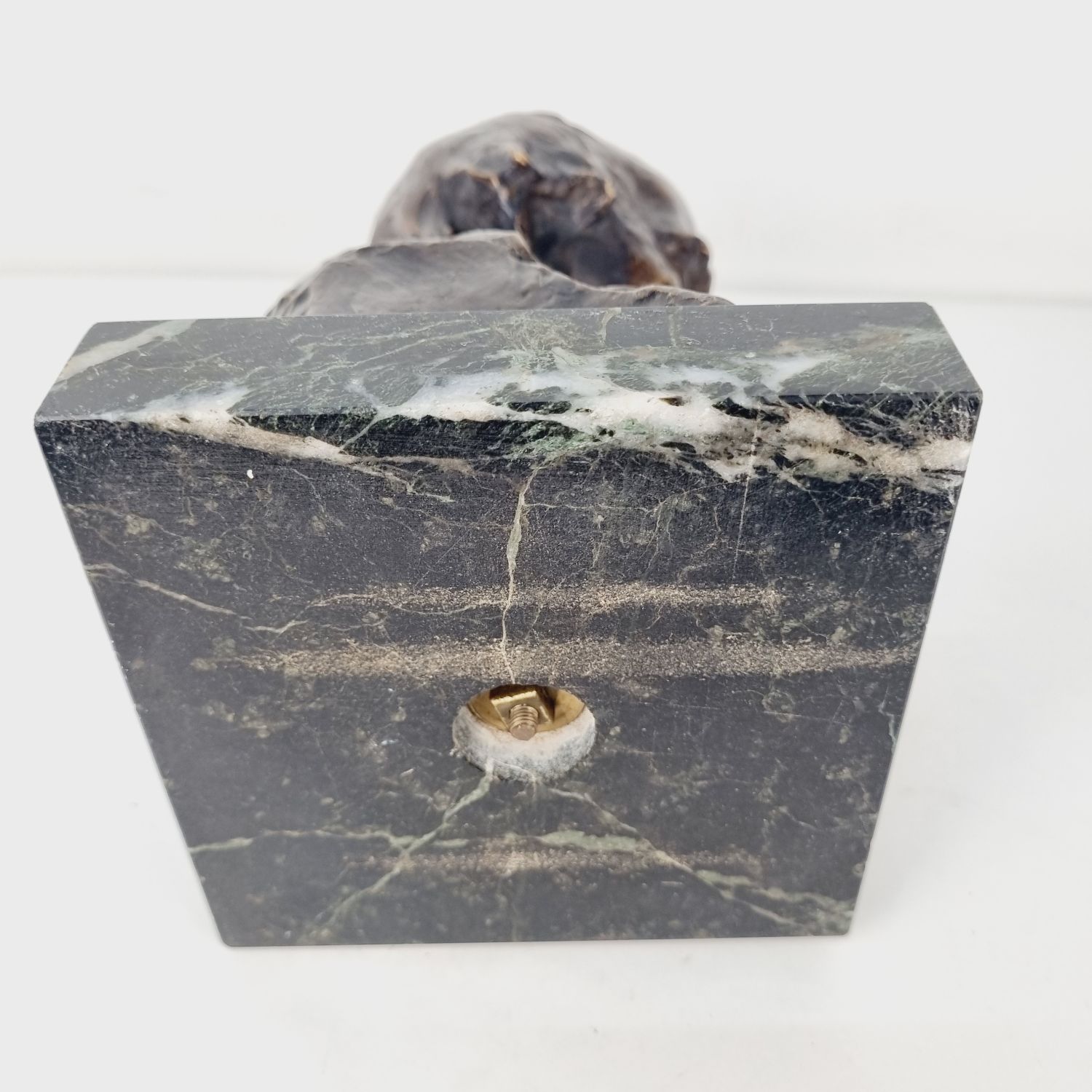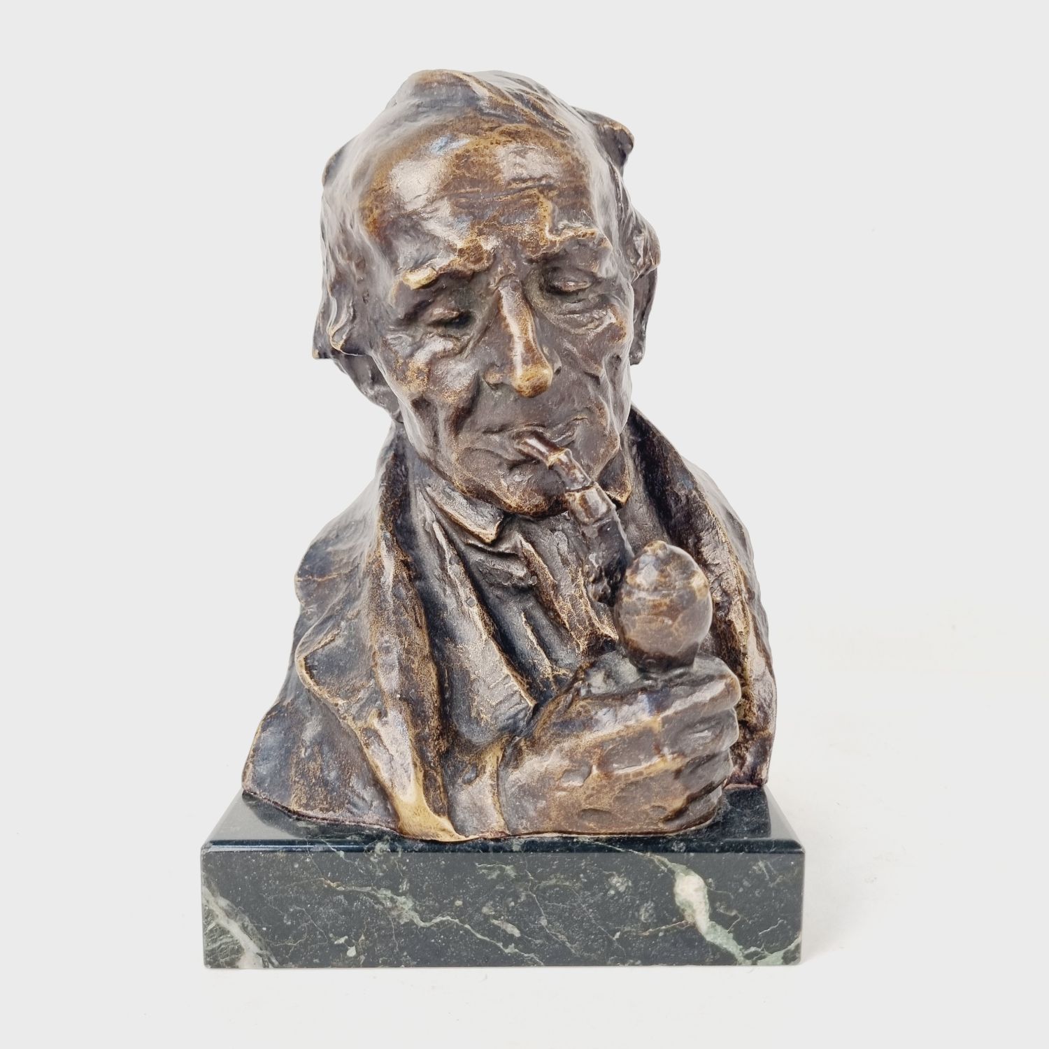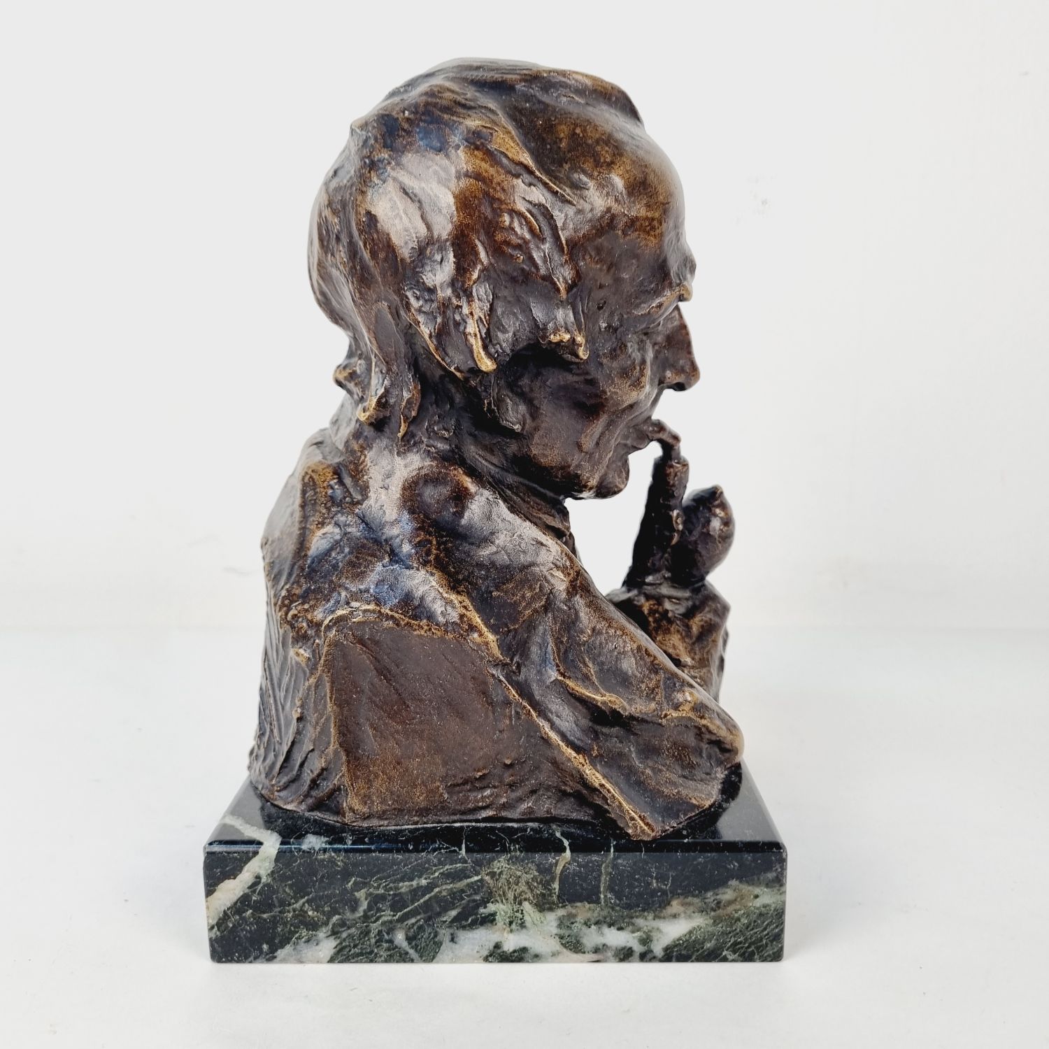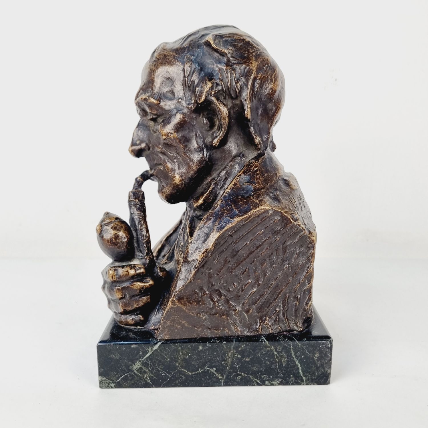 Hans Muller: Férfi mellszobor, bronz büszt az 1920-as évekből. Csodás karakterformálás, szép antik patina jellemzi. Hans Muller /1873-1937/ az egyik legnevesebb német portré mellszobrász és állatszobrász volt. Jelzett. Méretei: 20 x 13 x 13 cm.