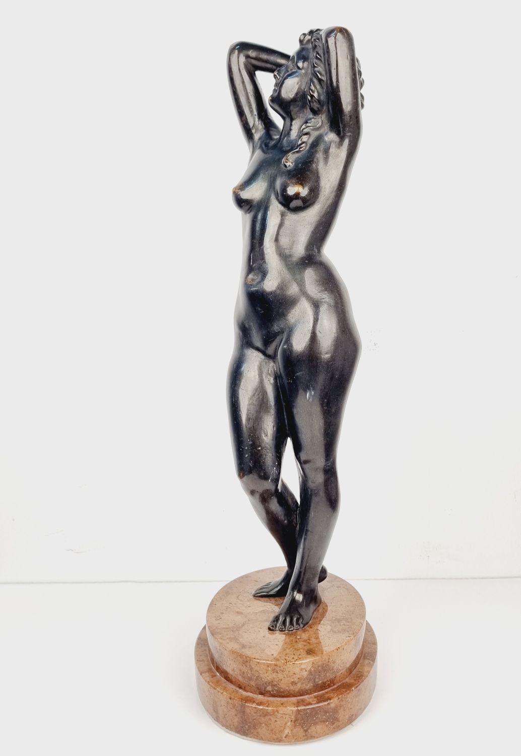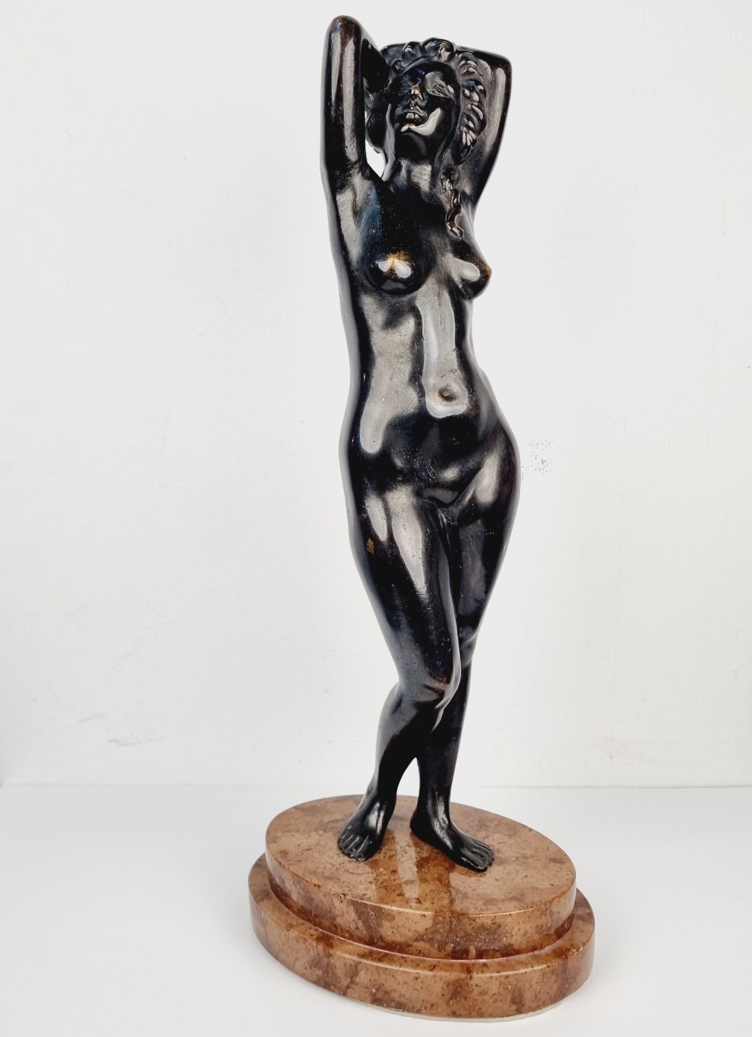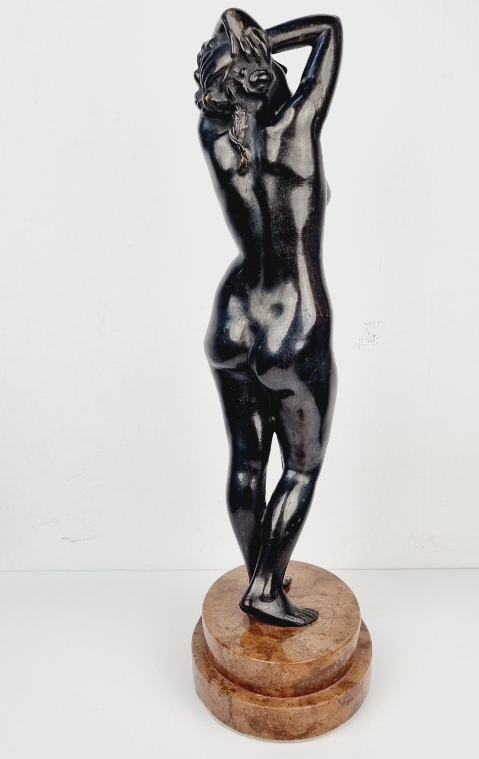 Vénuszt ábrázoló bronz szobor a XX.század elejéről. A szerelem és és szépség római istennőjét ábrázolja, amely a klasszikus női ideált testesíti meg. Korának megfelelő állapotú. Méretei: 40 x 16 x 12 cm.
