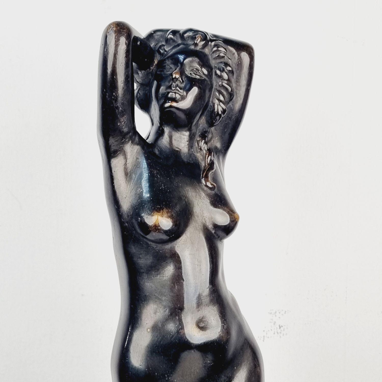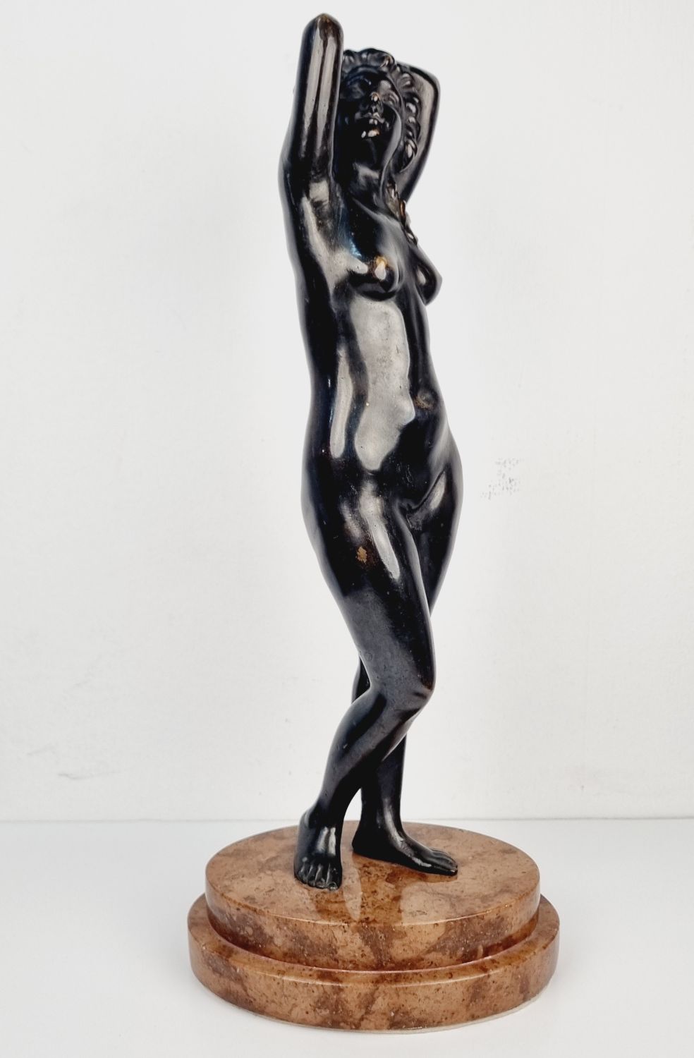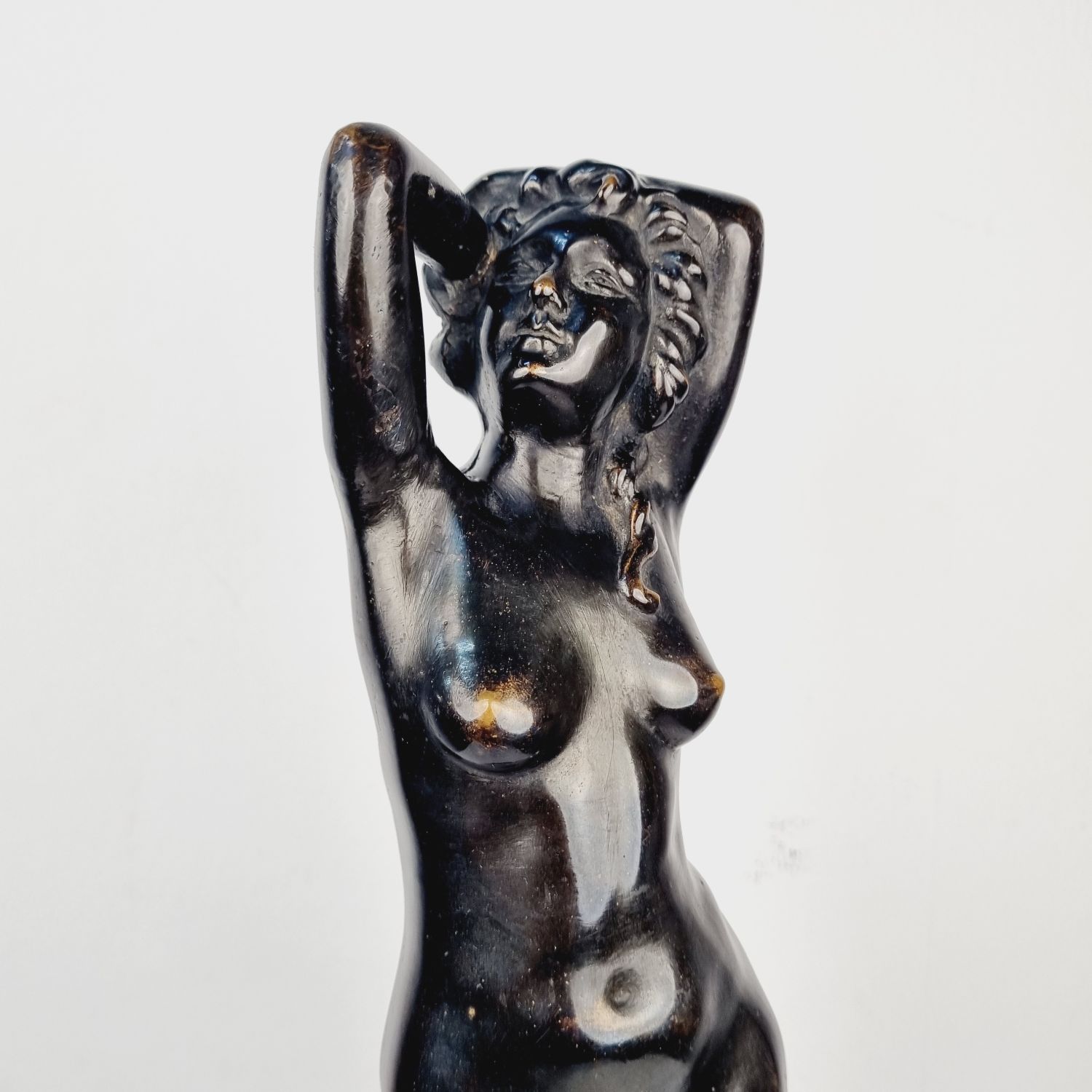 Vénuszt ábrázoló bronz szobor a XX.század elejéről. A szerelem és és szépség római istennőjét ábrázolja, amely a klasszikus női ideált testesíti meg. Korának megfelelő állapotú. Méretei: 40 x 16 x 12 cm.