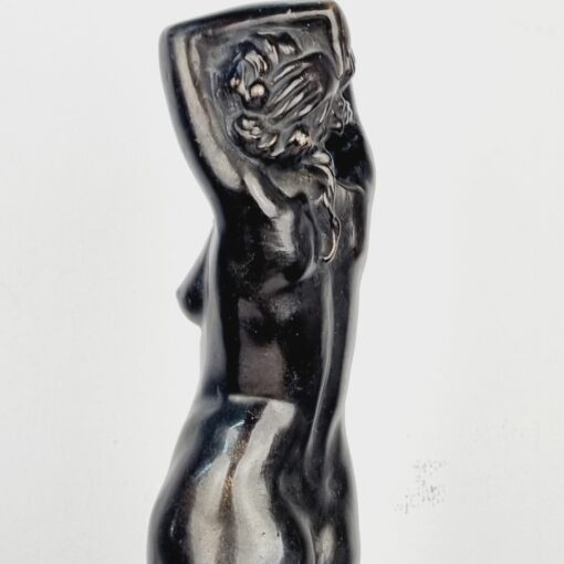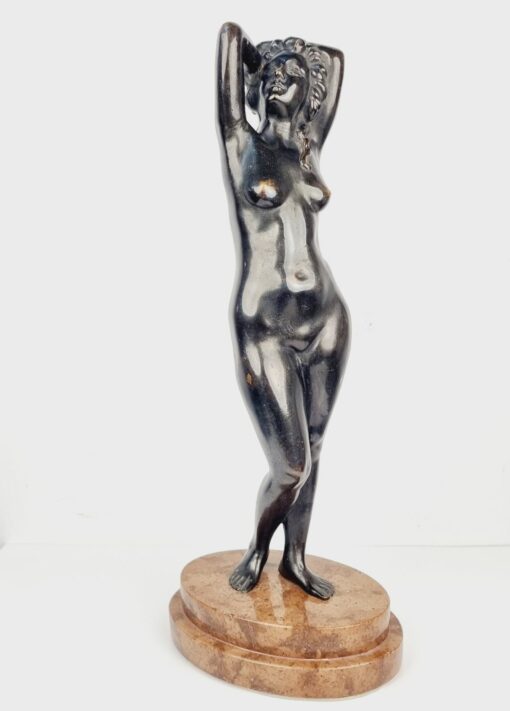 Vénuszt ábrázoló bronz szobor a XX.század elejéről. A szerelem és és szépség római istennőjét ábrázolja, amely a klasszikus női ideált testesíti meg. Korának megfelelő állapotú. Méretei: 40 x 16 x 12 cm.