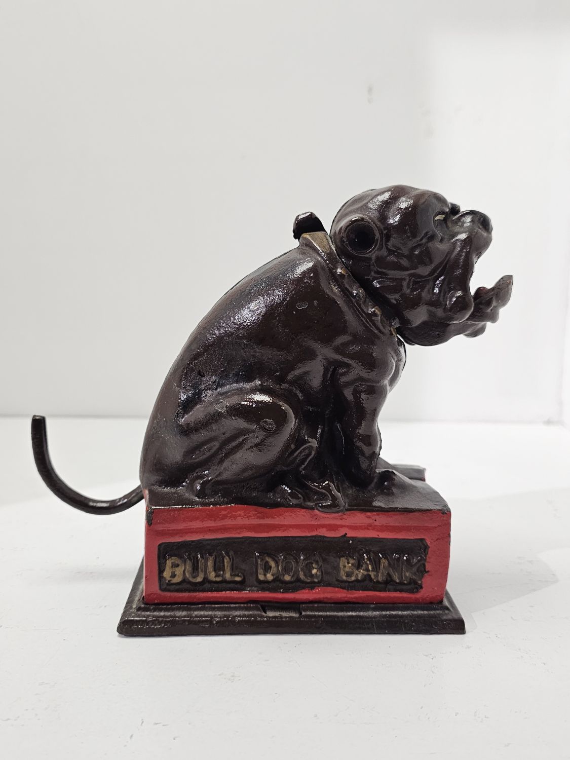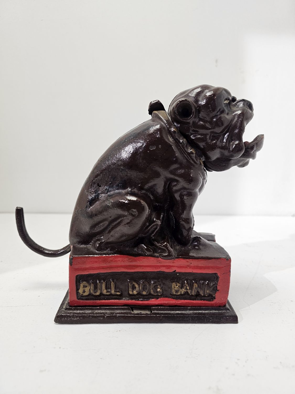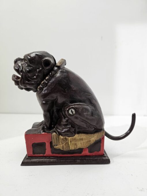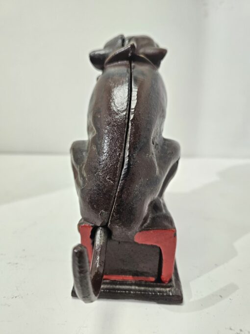Bulldog alakú persely festett öntöttvasból. Kora az 1980-as évekre tehető. Feltehetőleg angol gyártmány. Ezt a tipust J. and E. Stevens Company kezdte el gyártani Cromwellben 1880-ban. Nosztalgikus báj jellemzi. Korának megfelelő állapotú. Méretei: 15 x 18 x 5 cm.