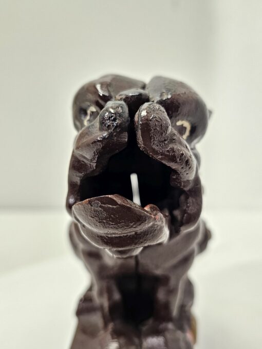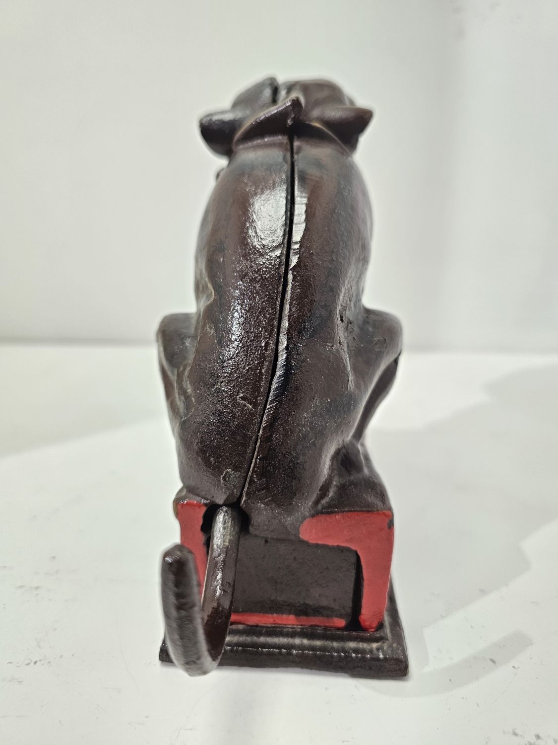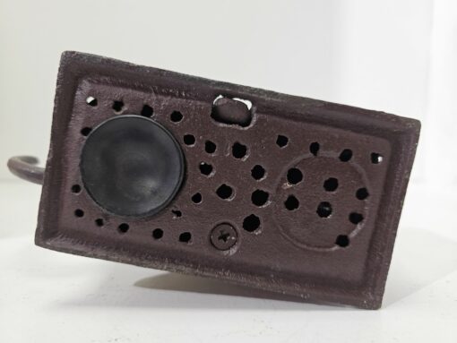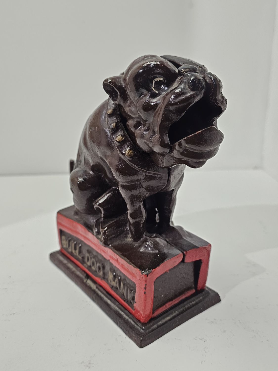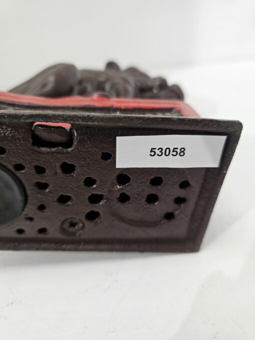 Bulldog alakú persely festett öntöttvasból. Kora az 1980-as évekre tehető. Feltehetőleg angol gyártmány. Ezt a tipust J. and E. Stevens Company kezdte el gyártani Cromwellben 1880-ban. Nosztalgikus báj jellemzi. Korának megfelelő állapotú. Méretei: 15 x 18 x 5 cm.