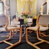 Vintage stílusú , Magnus Olesen által tervezett 5 db-os dán design étkezőszék garnitúra az 1970-es, 80-as évekből. Méretei: 78×53 cm. Állapota a korának megfelelő. Ezek a stílusos székek a skandináv dizájn esszenciáját ragadják meg.