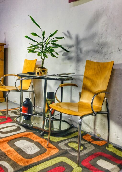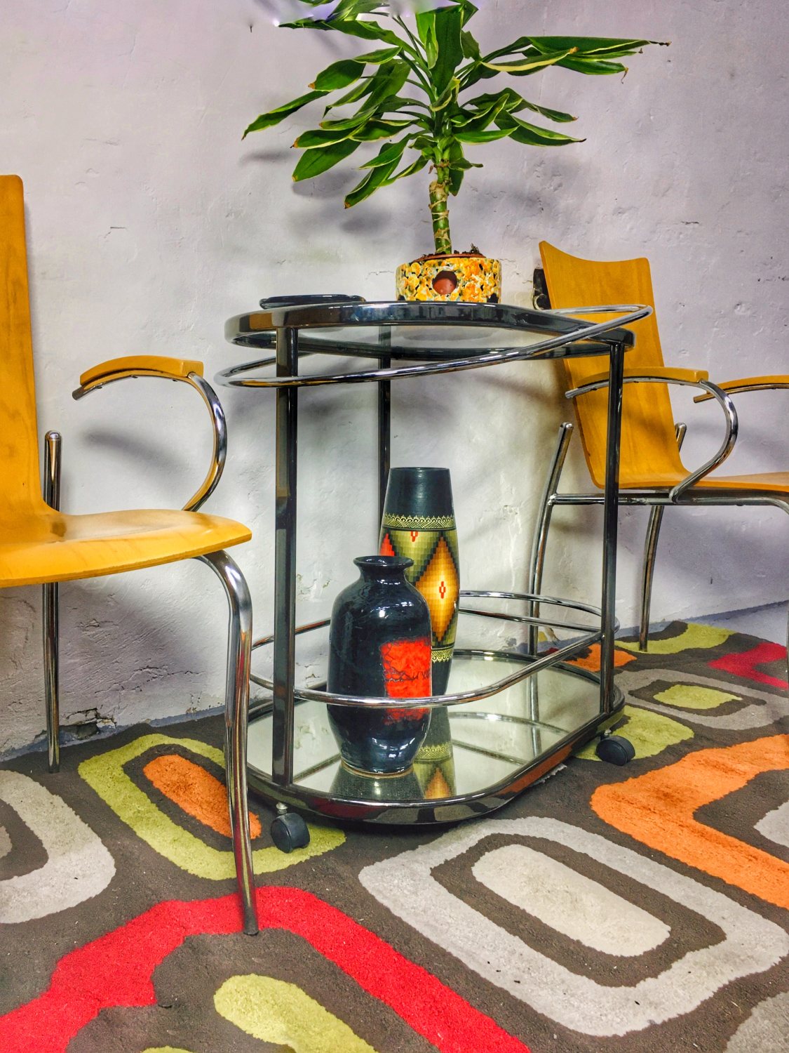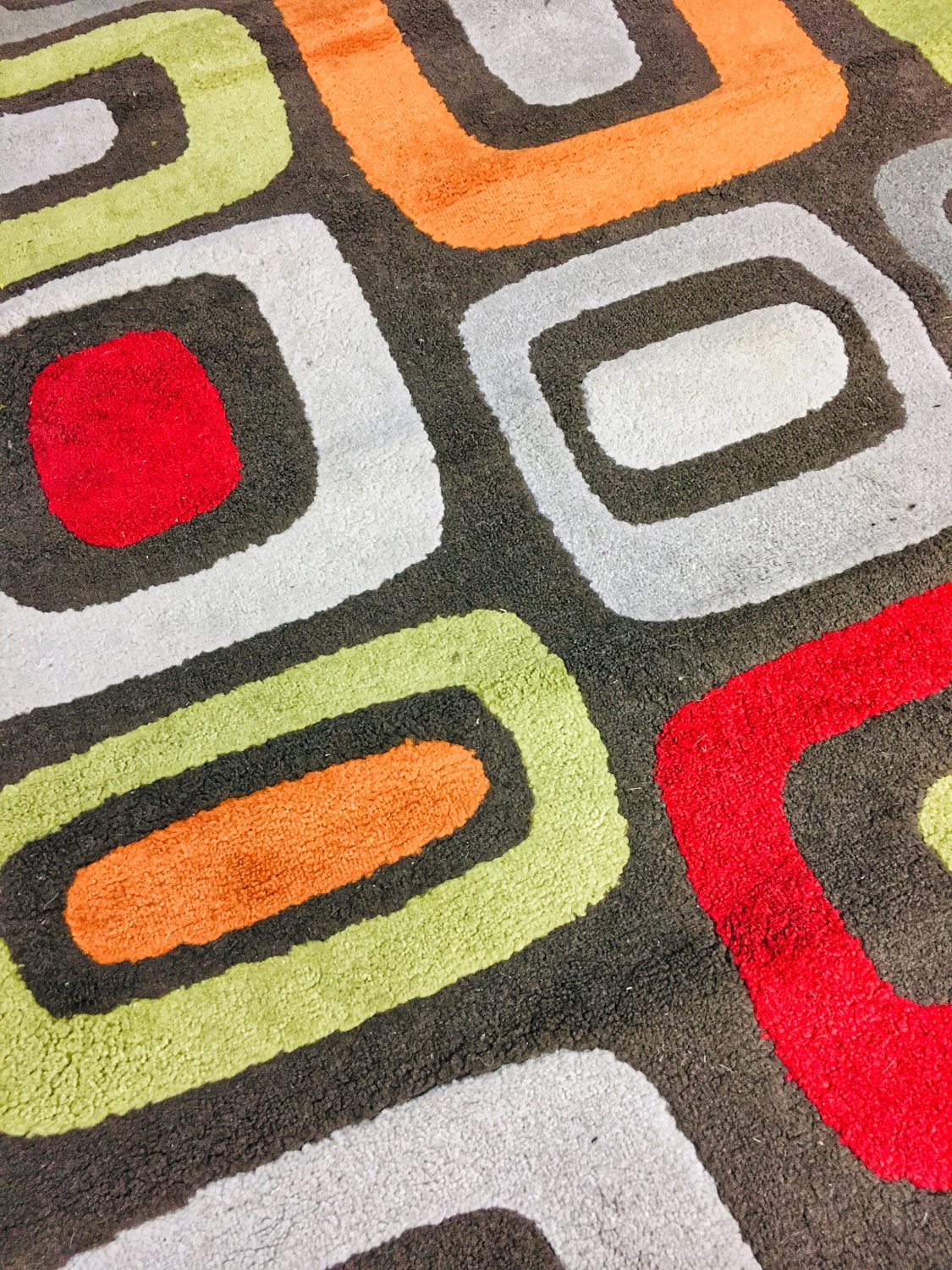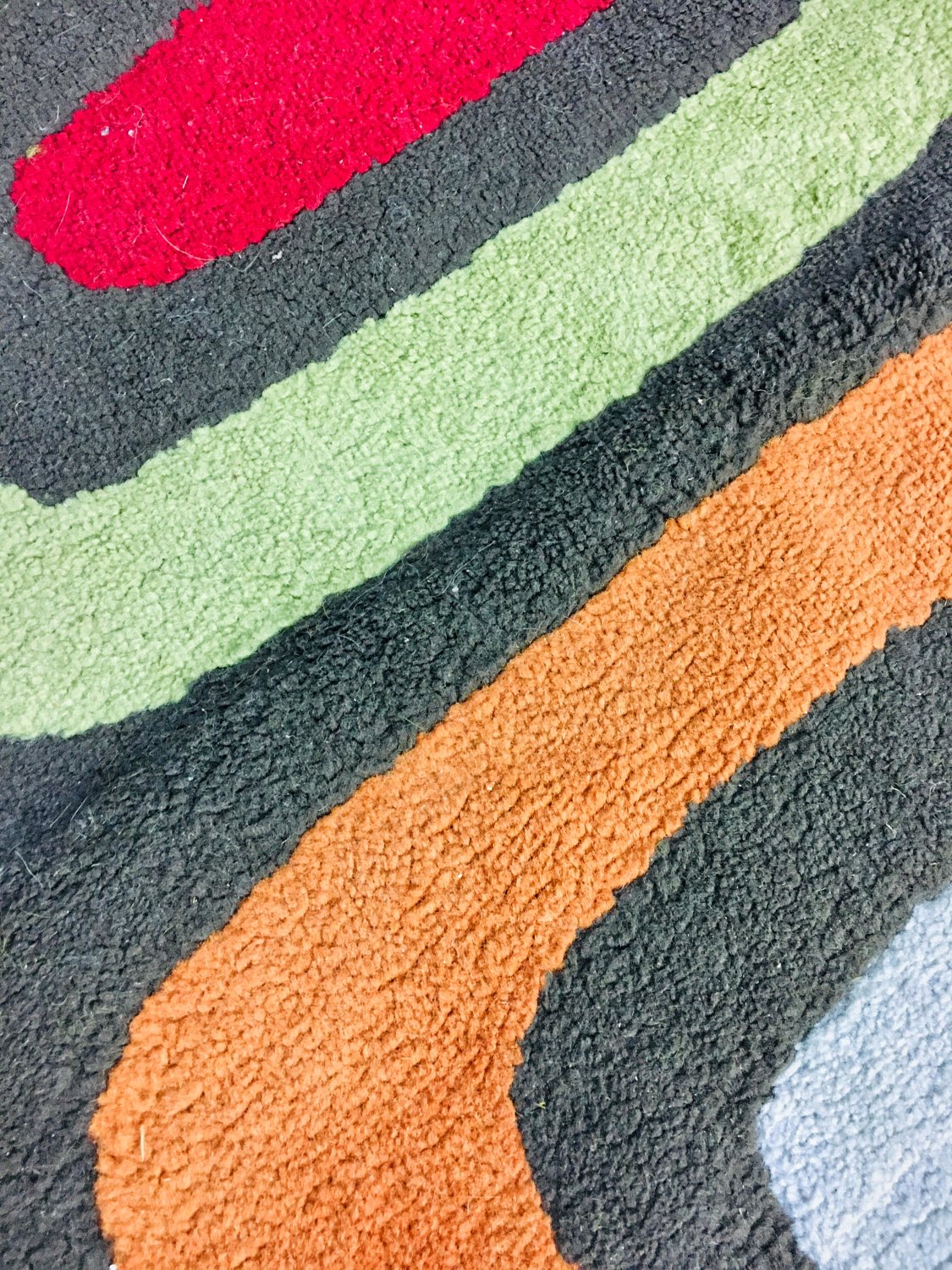 Modern kárpit fekete alapon színes kerekített kockákkal, a 60-70-es évekből. Nagyon dekoratív darab, szép tiszta állapotban, apró folt előfordulhat.