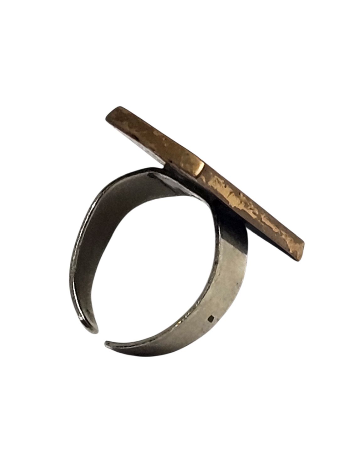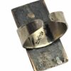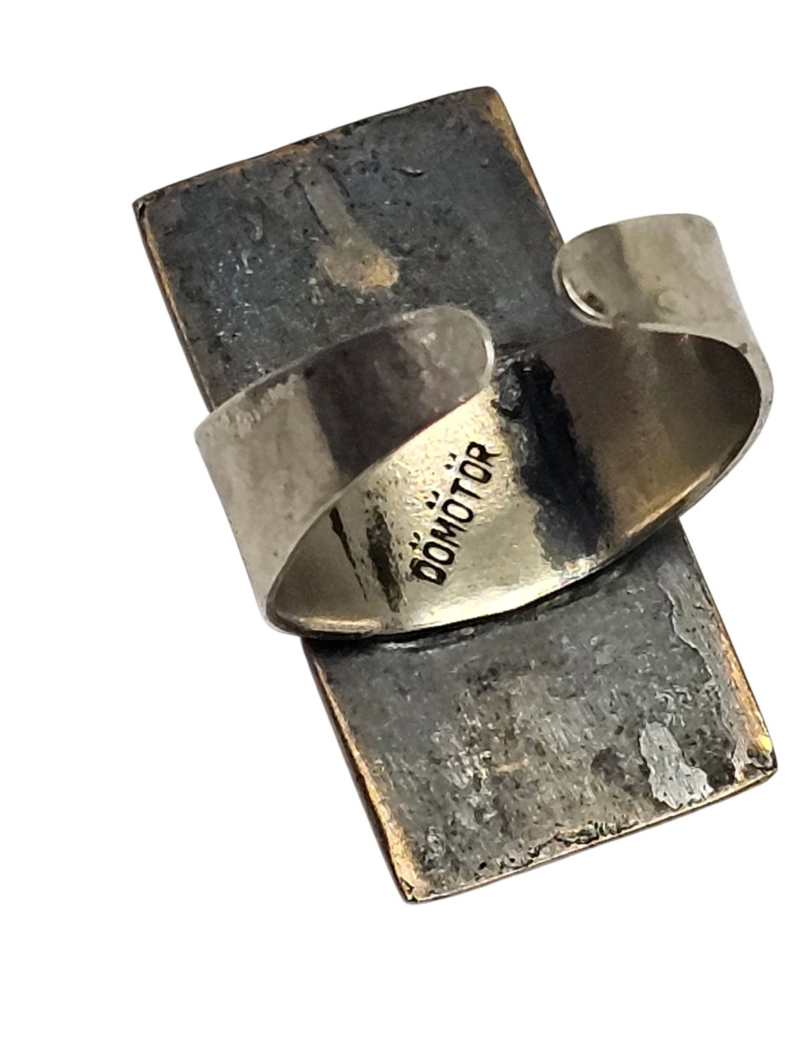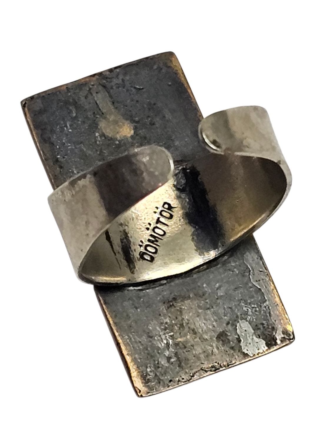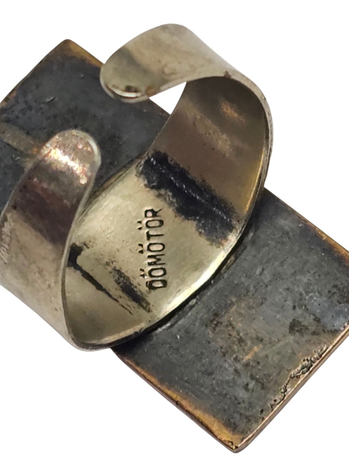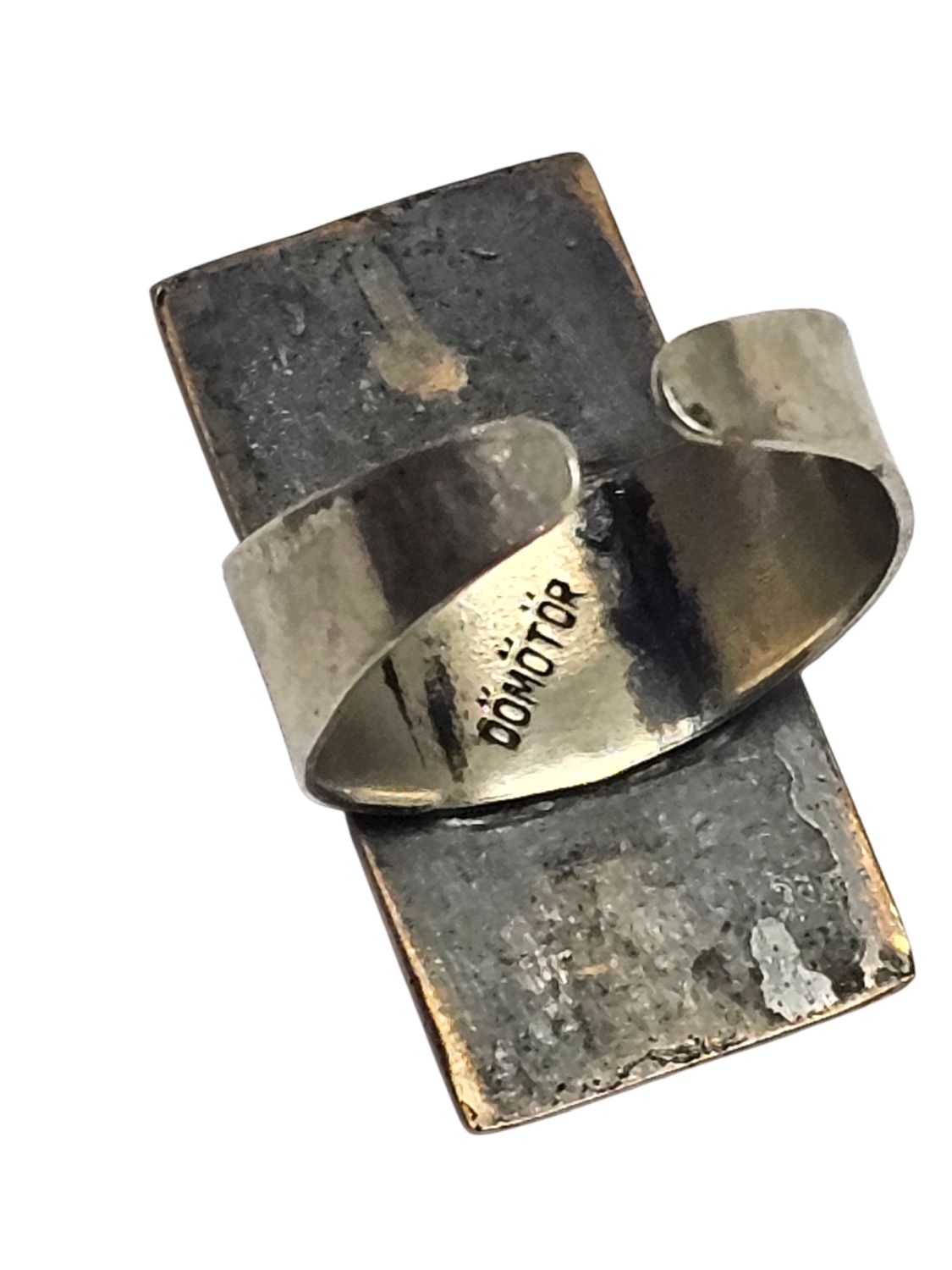 Női gyűrű, Dömötör László iparművész alkotása 1970s évek. Jelzett, egyéni stílusú divatékszer. Anyaga réz, mérete: 2,5 x 1 x 1 cm.