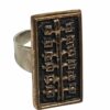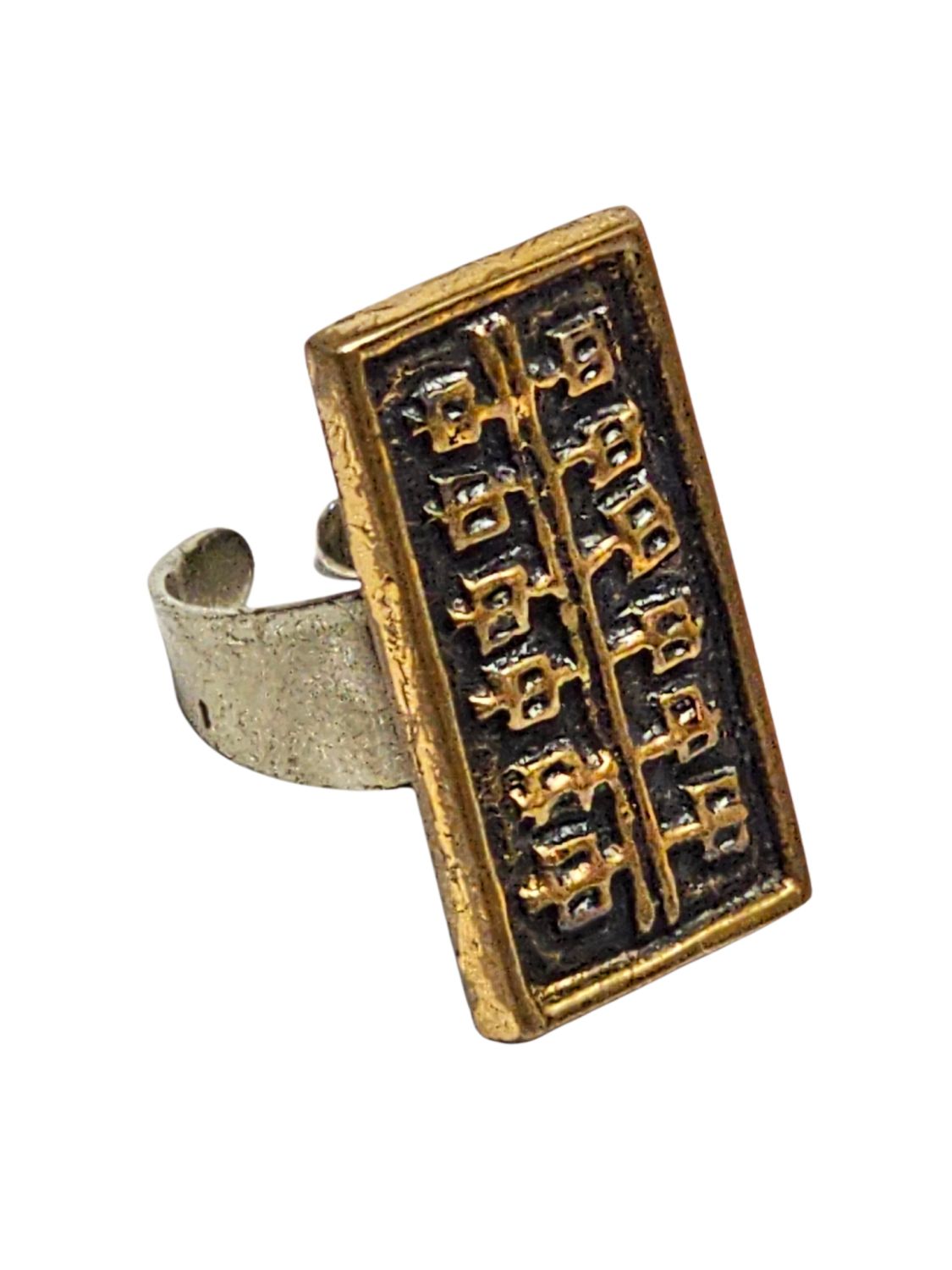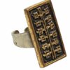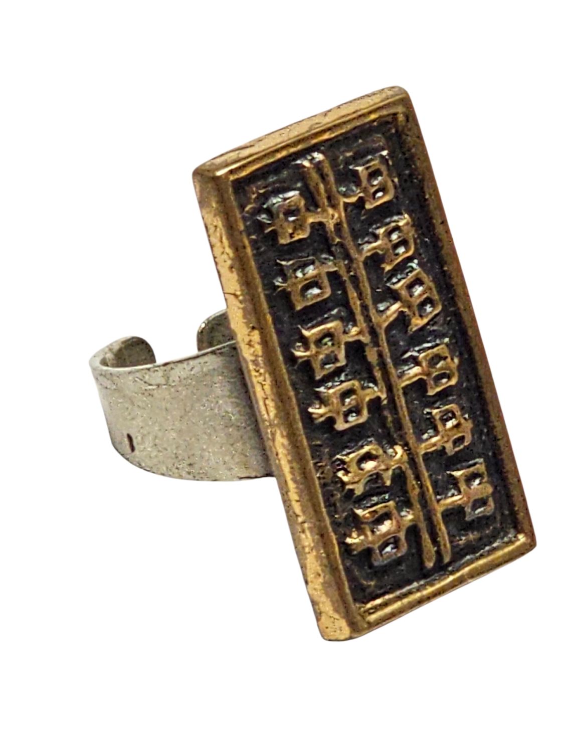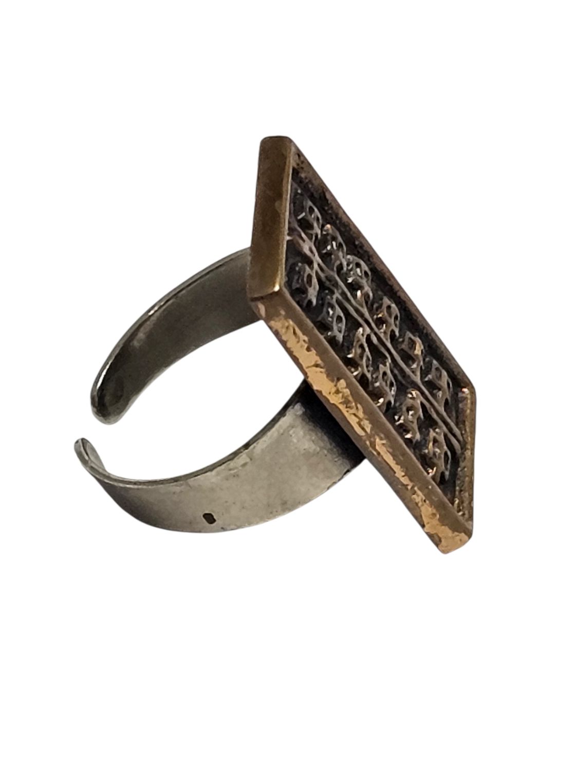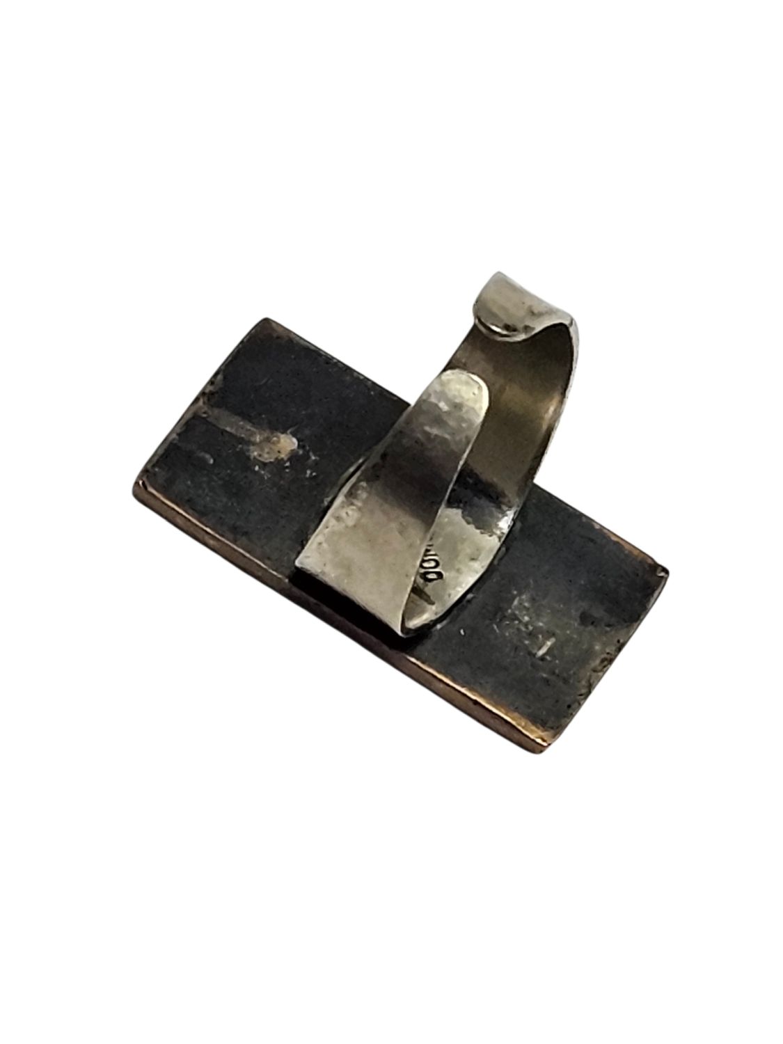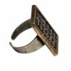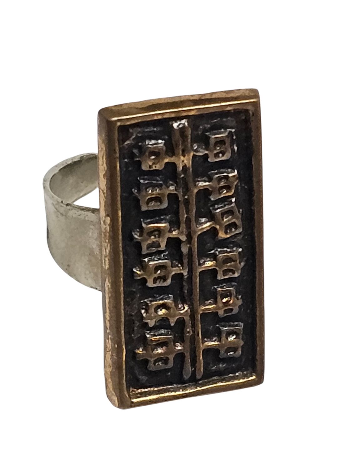 Női gyűrű, Dömötör László iparművész alkotása 1970s évek. Jelzett, egyéni stílusú divatékszer. Anyaga réz, mérete: 2,5 x 1 x 1 cm.
