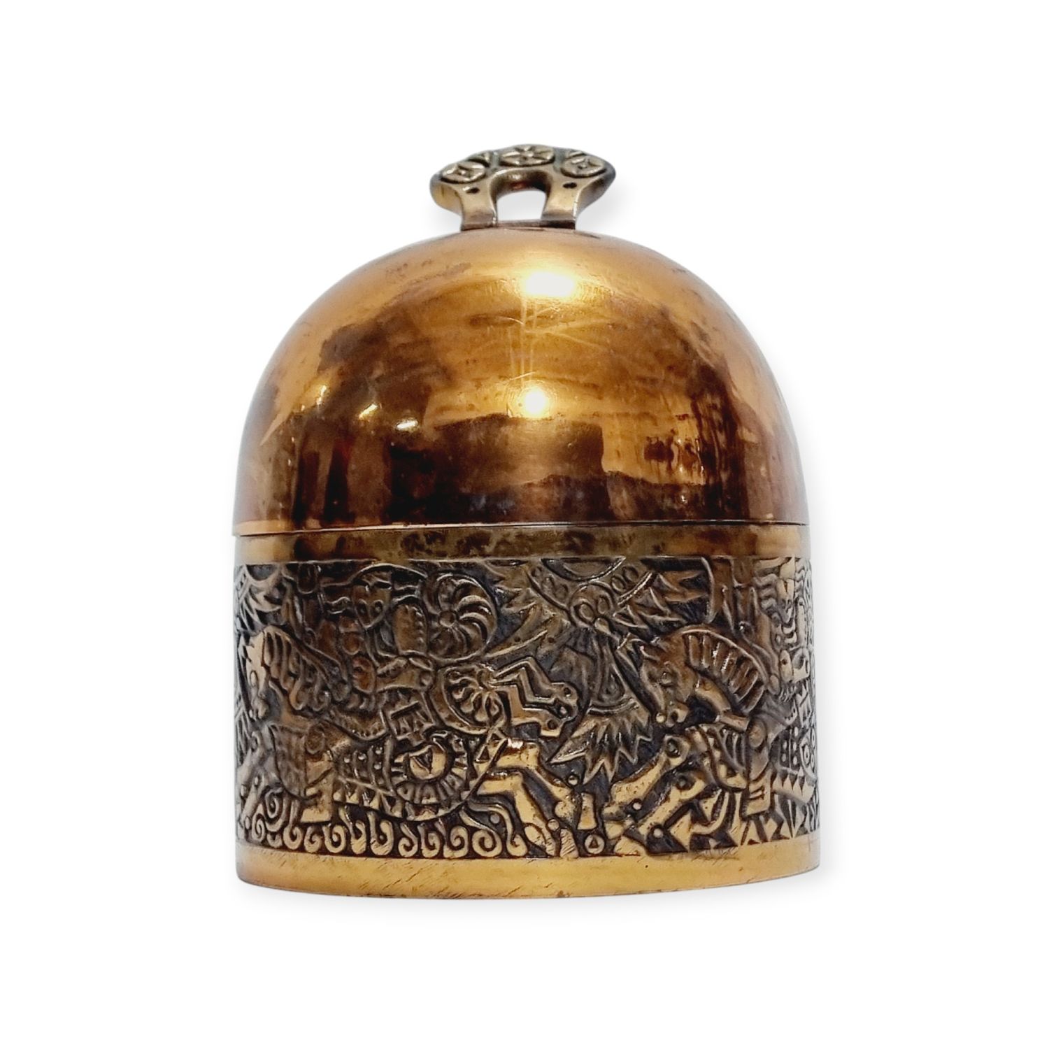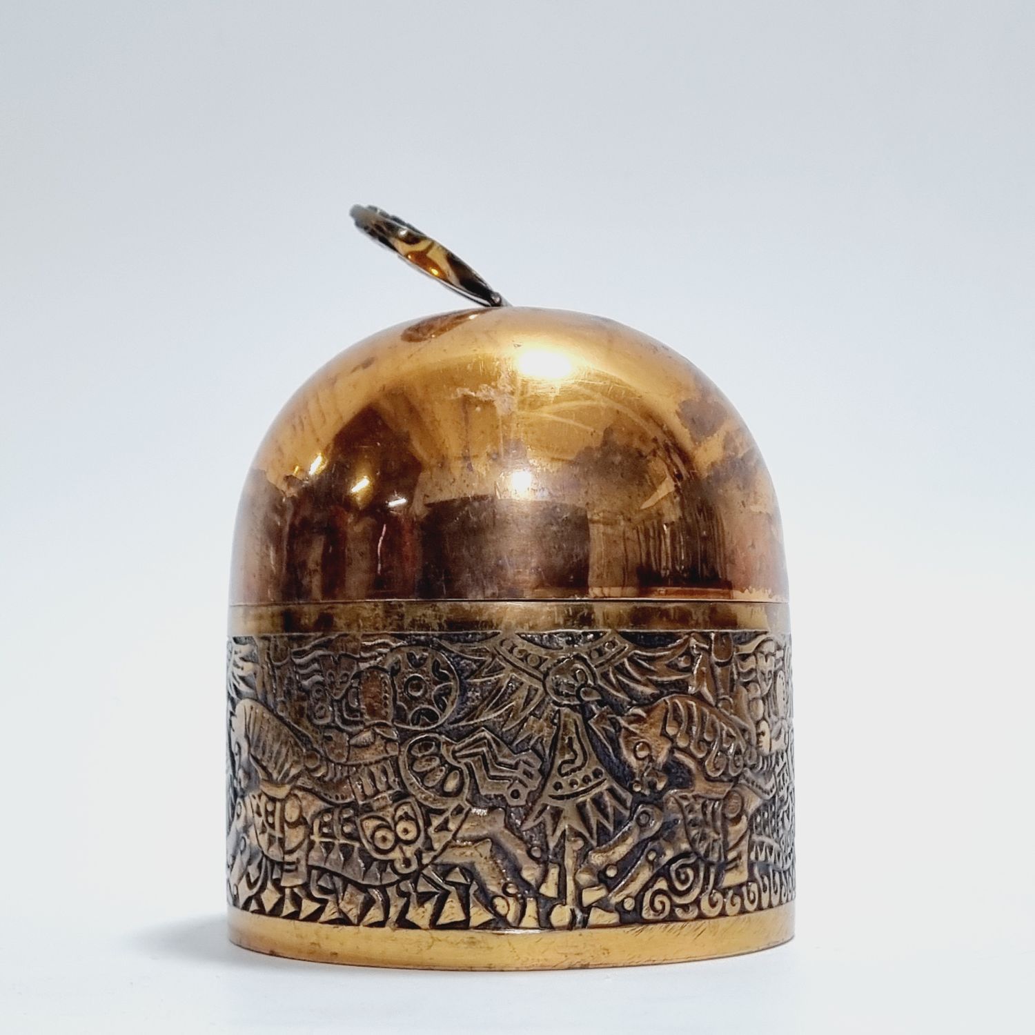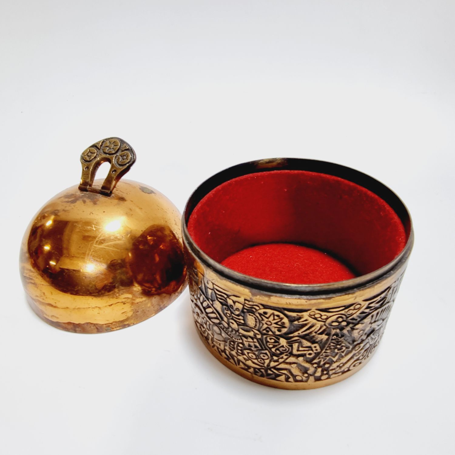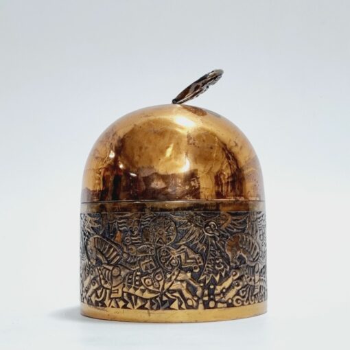 Ékszerdoboz, melynek kupolás teteje és gazdagon díszített oldalai vannak. Egyedi kézműves alkotás az 1960-as évekből, Magyarcsák Mária iparművész munkája. Bájos, elegáns igényes. Korának megfelelő állapotú. Méretei: 18 x 11 x 11 cm.