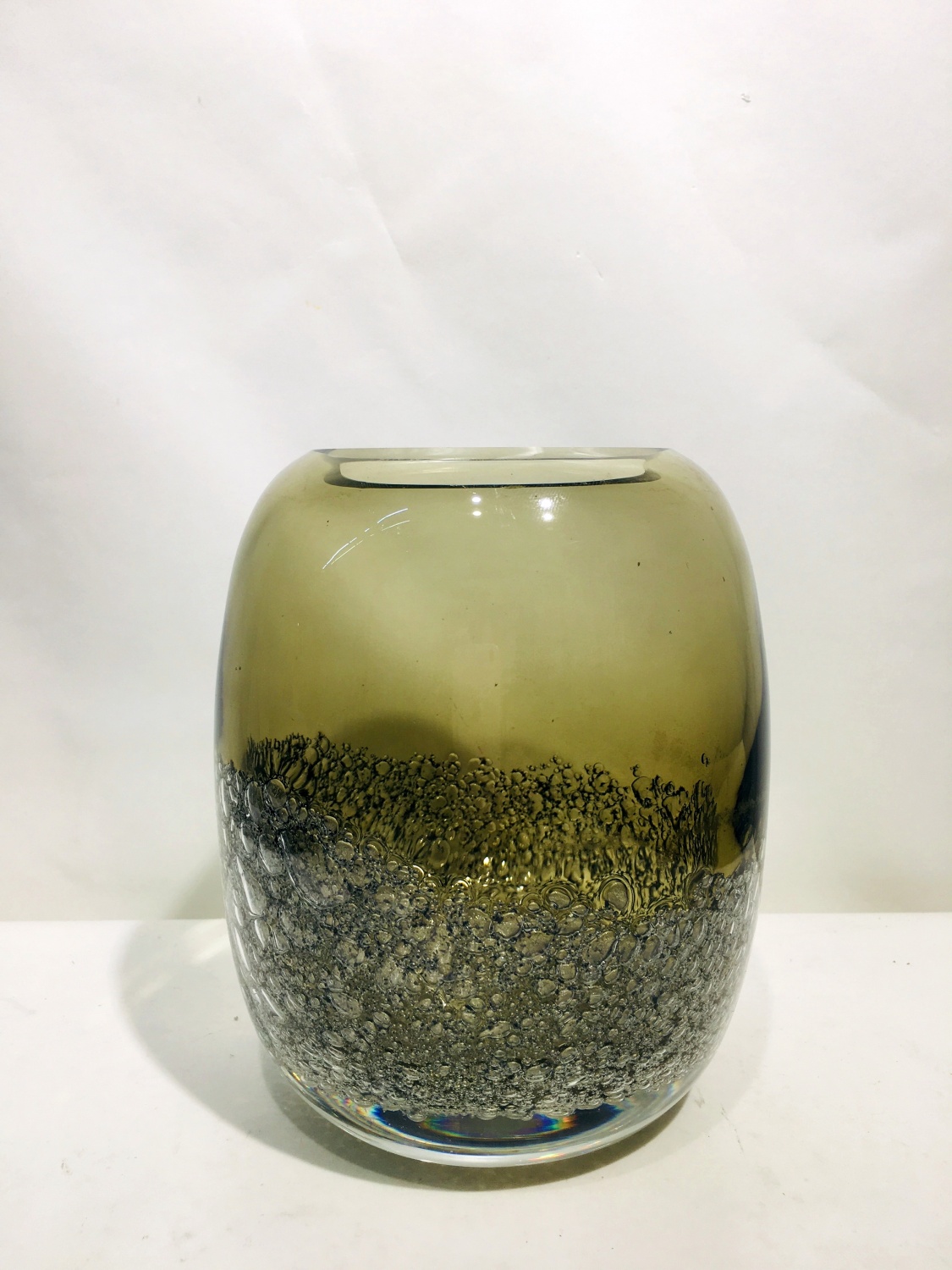 Feltehetőleg Muranoi ezüst lapokkal díszített különleges művészüveg váza az 1960-70-es évekből