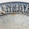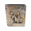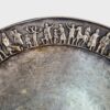 Teván Margit alkotása az 1930-as évekből. Ezüstözött sárgaréz tál, gazdagon díszített domborműves figurális kördekorral. Korának megfelelő állapotban van, kissé kopott. Jelzett. Méretei: 18x18x5 cm