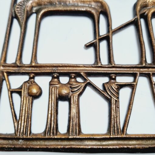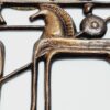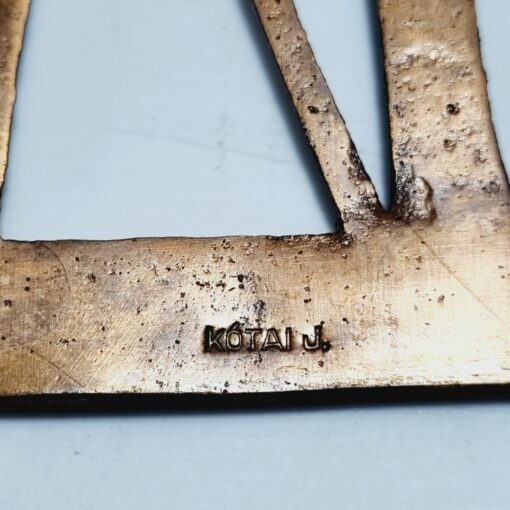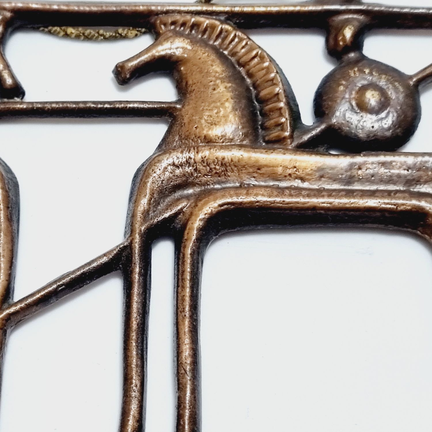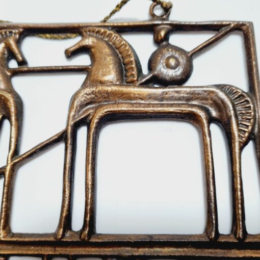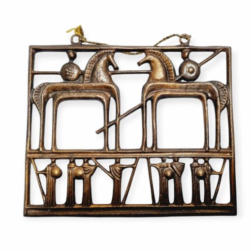 Kótai József: Fali relief, amely bronzból készült iparművészeti alkotás az 1960-as évekből. Két stilizált ló harcosokkal. Dekoratív, egyedi alkotás amely az ókor hangulatát idézi. Korának megfelelő állapotú. Méretei: 13 x 16 x 1 cm.