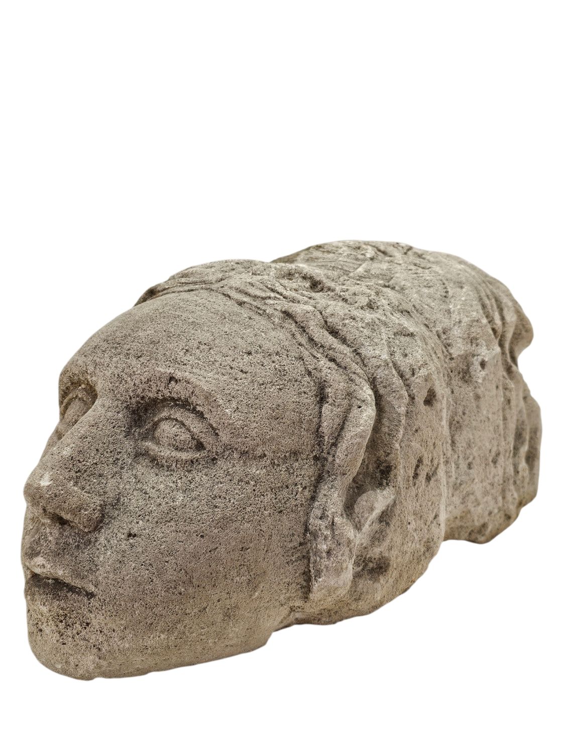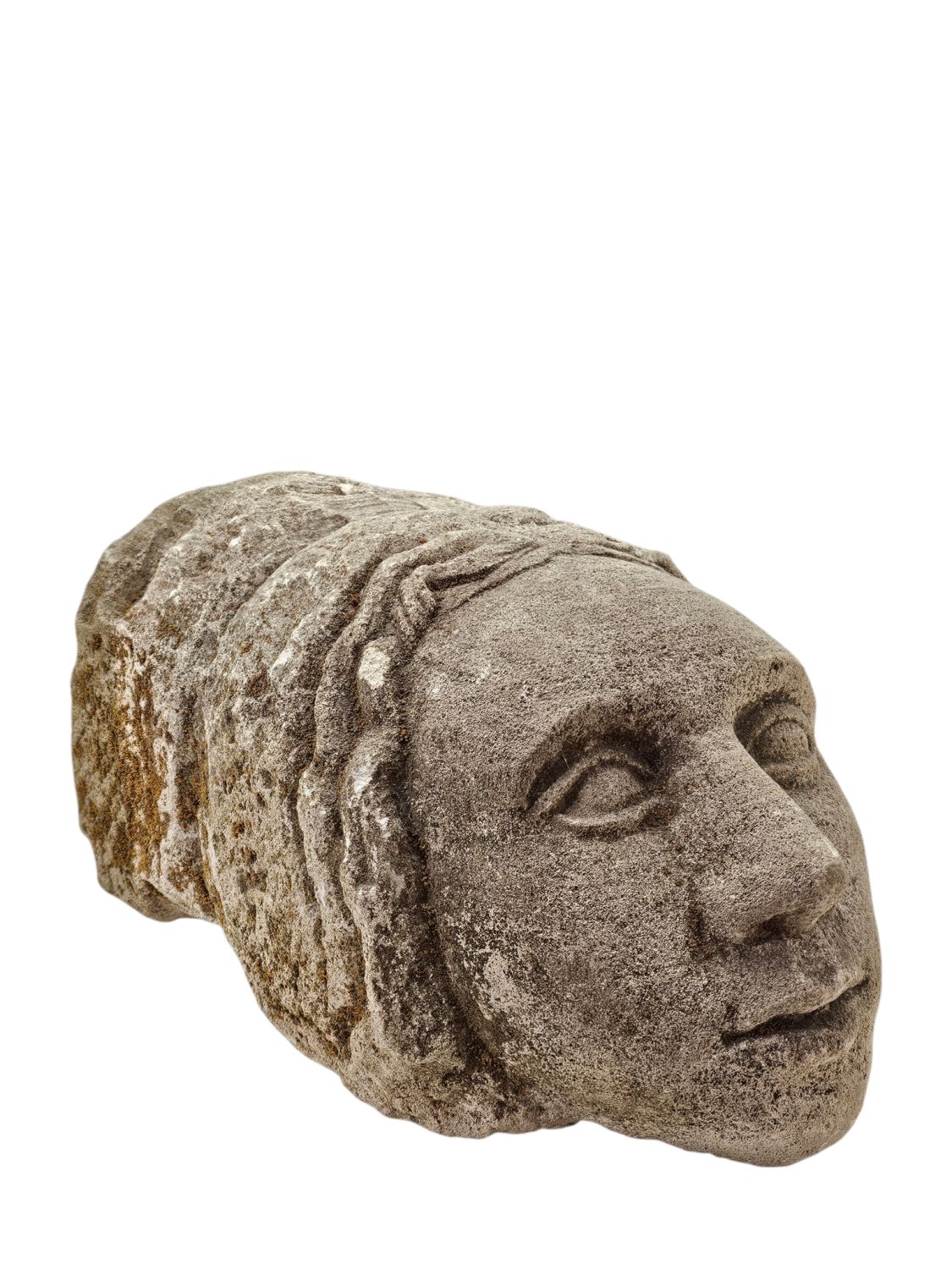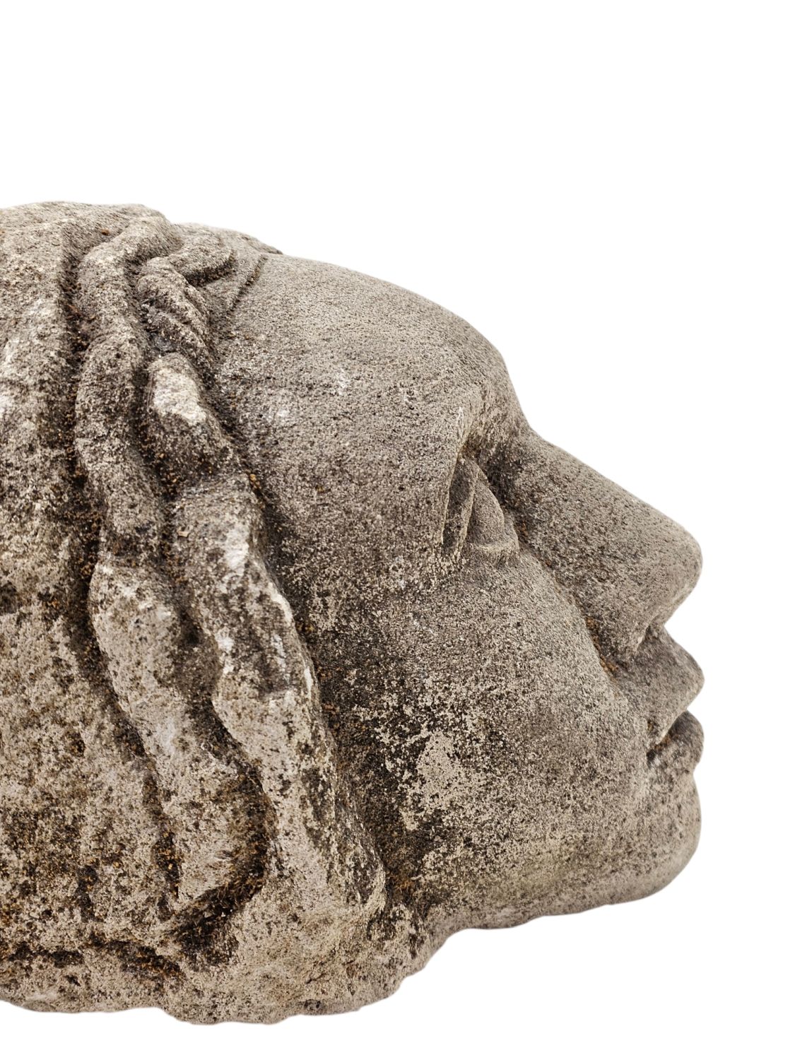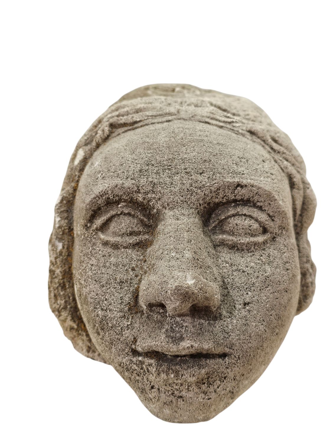 Ókori görög vagy etruszk homokkő fej, Leucothea istennőt ábrázolva. Másolat, általában a hellenisztikus korra datálható az eredetije. Jó állapotú. Izgalmas díszítőelem. Méretei: 19 x 41 x 18 cm.