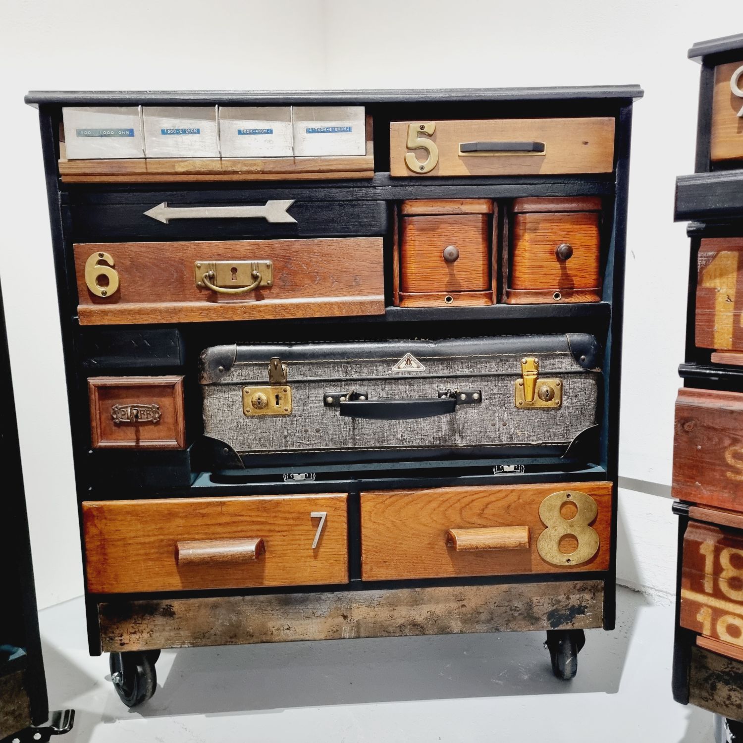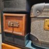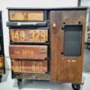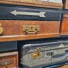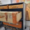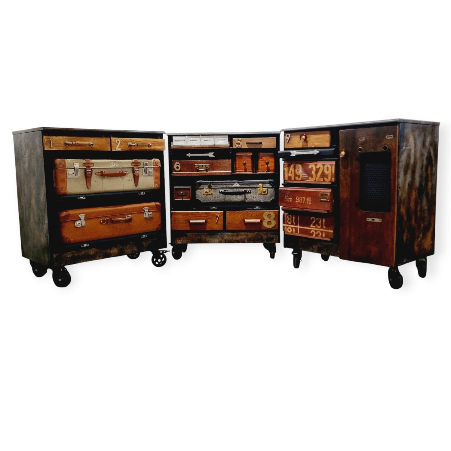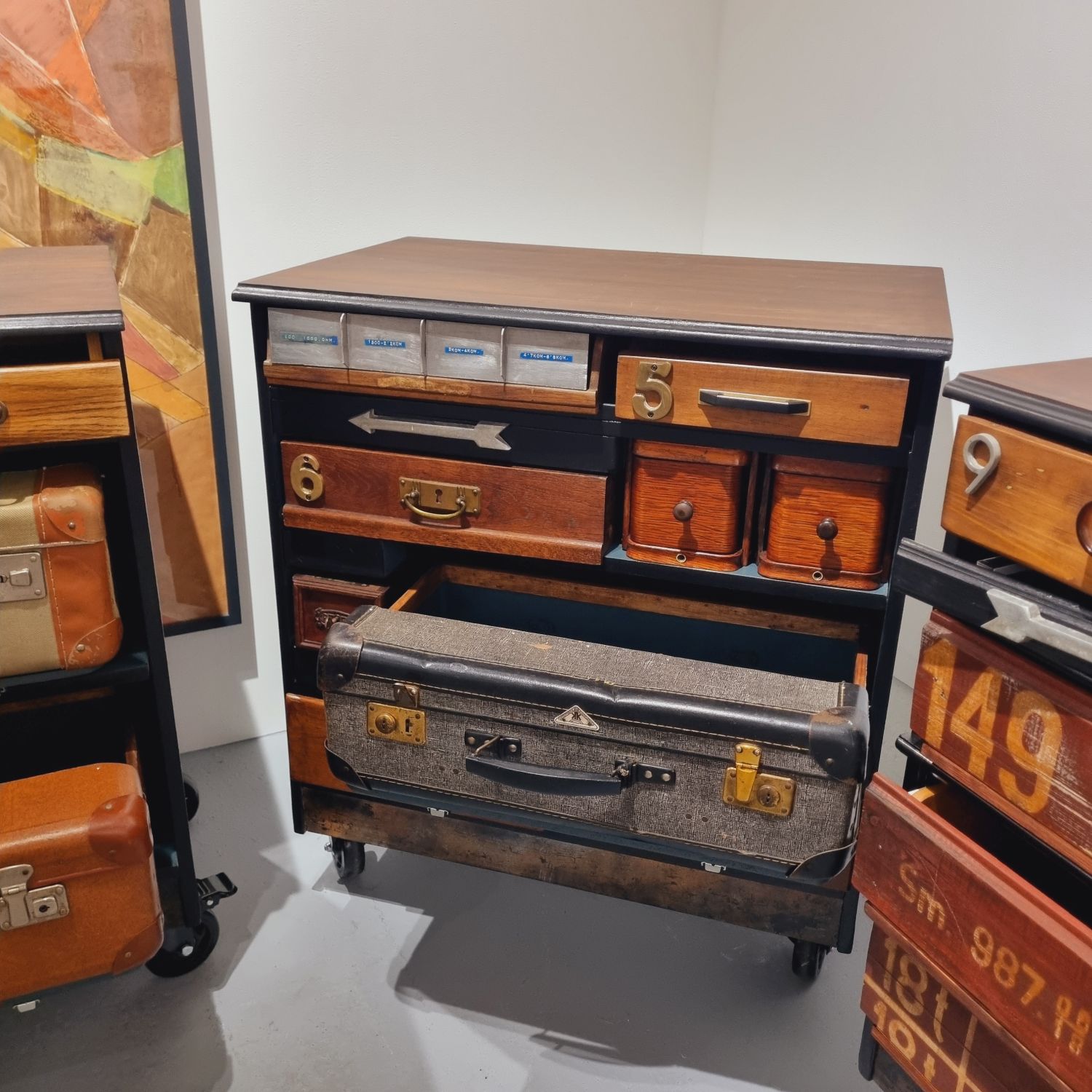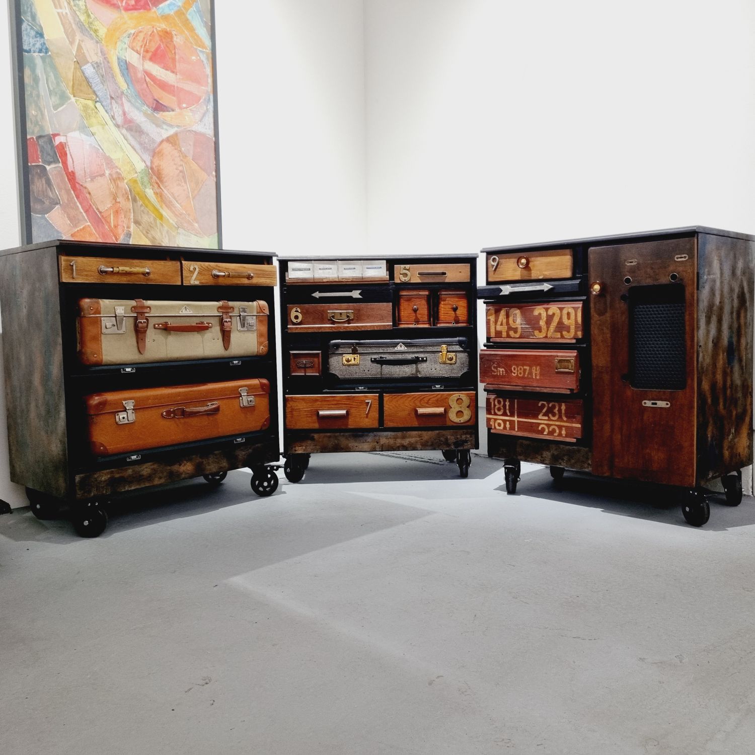 Újragondolt bőrönd szekrény, amely 3 db-ból áll, alkotó elemei az 1930-as években készültek. A bútor több különböző méretű és stílusú bőröndöt tartalmaz melyek fiókként funkcionálnak. Ipari stílusú, melyet a fém váz és a kerekek is erősítenek. Méretei : 75 x 88 x 48 cm.
