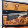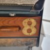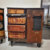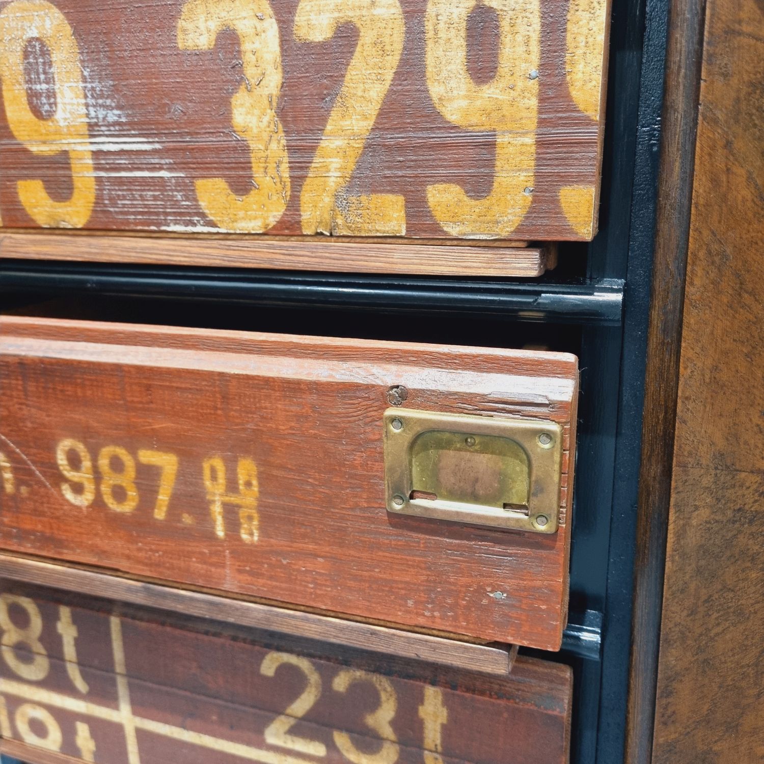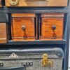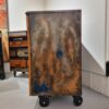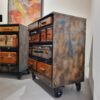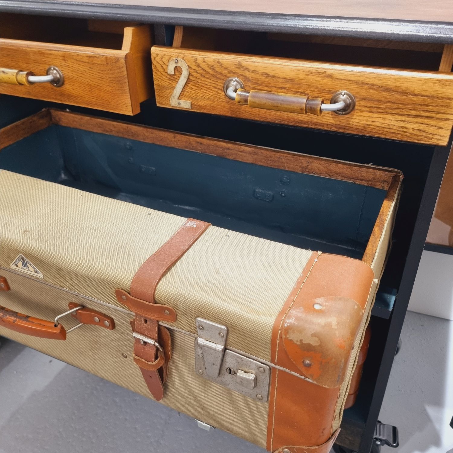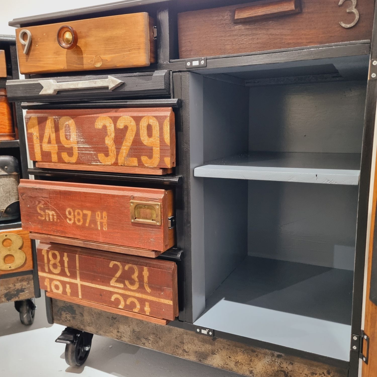 Újragondolt bőrönd szekrény, amely 3 db-ból áll, alkotó elemei az 1930-as években készültek. A bútor több különböző méretű és stílusú bőröndöt tartalmaz melyek fiókként funkcionálnak. Ipari stílusú, melyet a fém váz és a kerekek is erősítenek. Méretei : 75 x 88 x 48 cm.