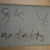 Vegyestechnika, vászon, 64 x 29 cm (kerettel: 83 x 47 cm). Jelezve hátul: “Gy.K. 1968 No doubts”