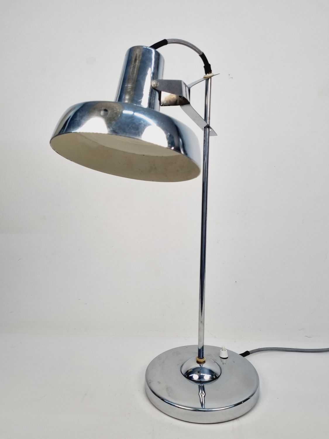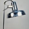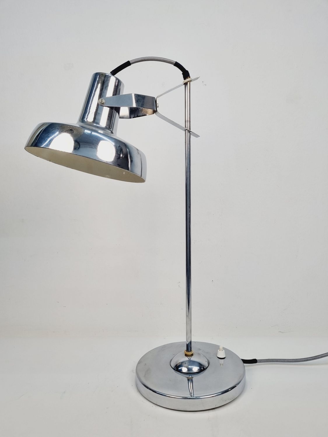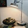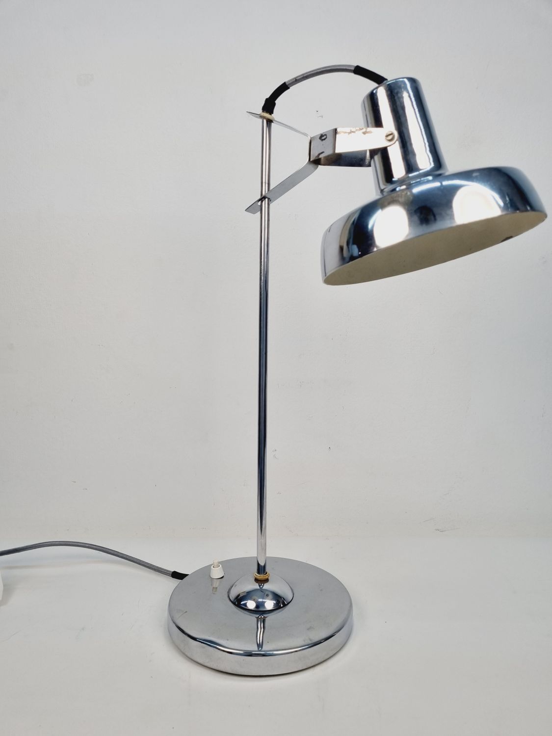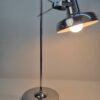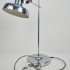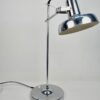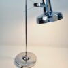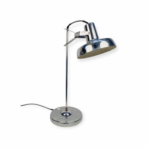 Modern, letisztult formavilágú, Heller Sándor által tervezett, állítható asztali lámpa az 1970-es évekből. Megkímélt állapotban, a lámpatesten enyhén kopott a krómozás.