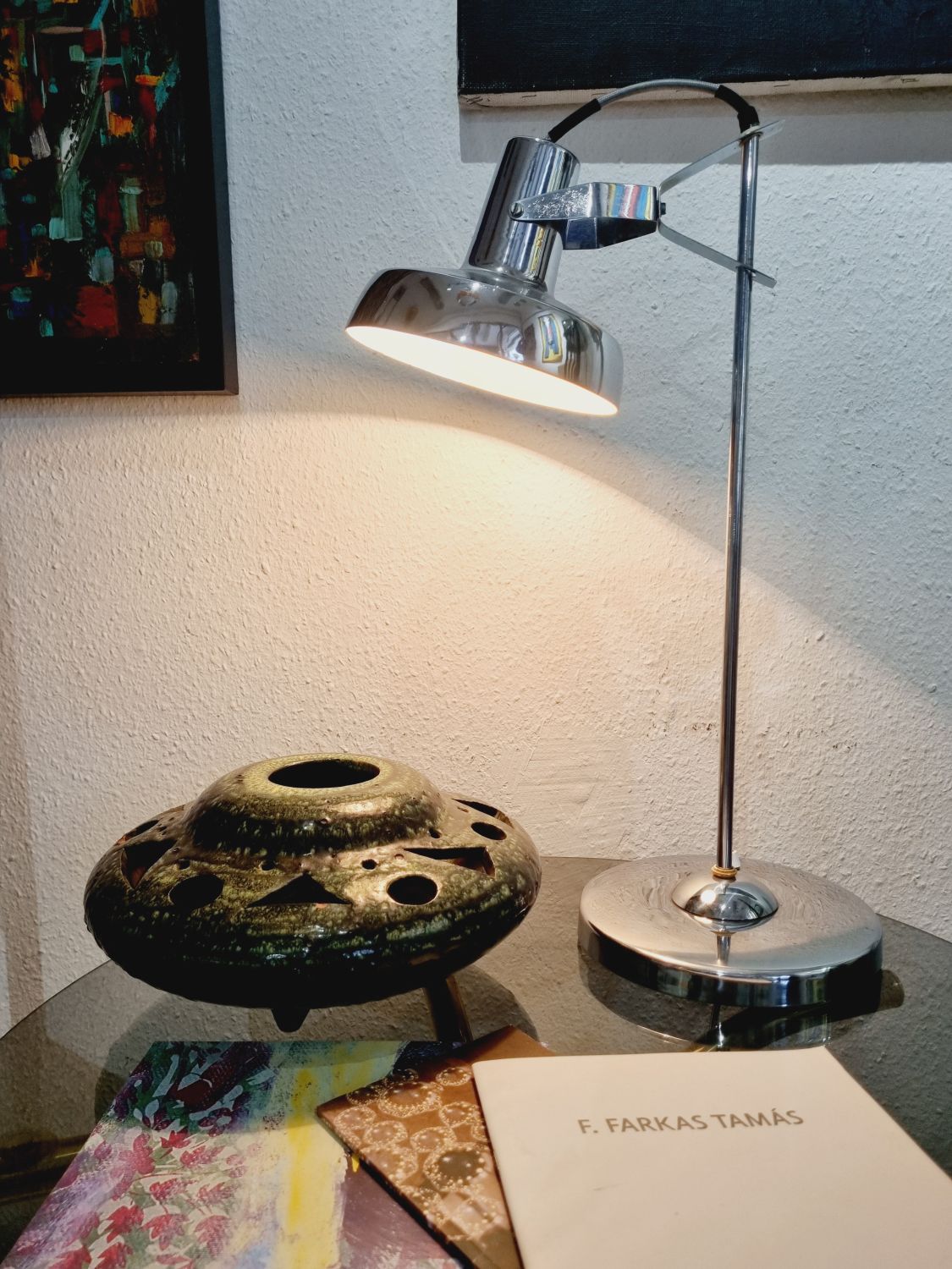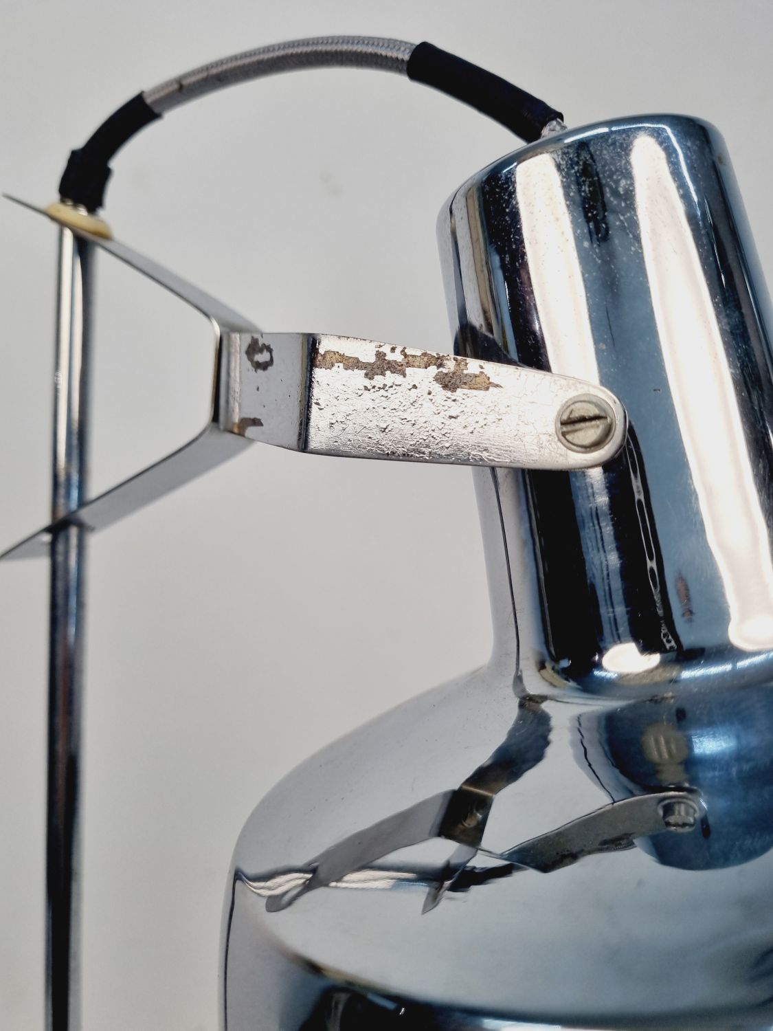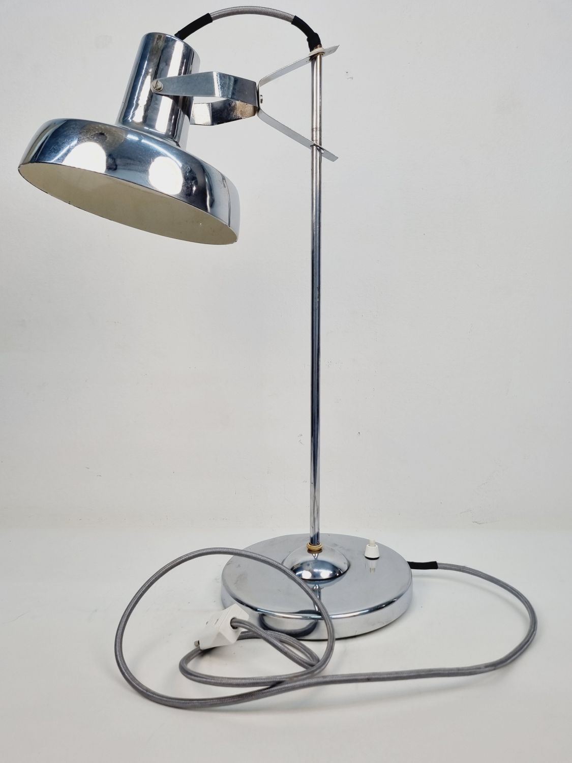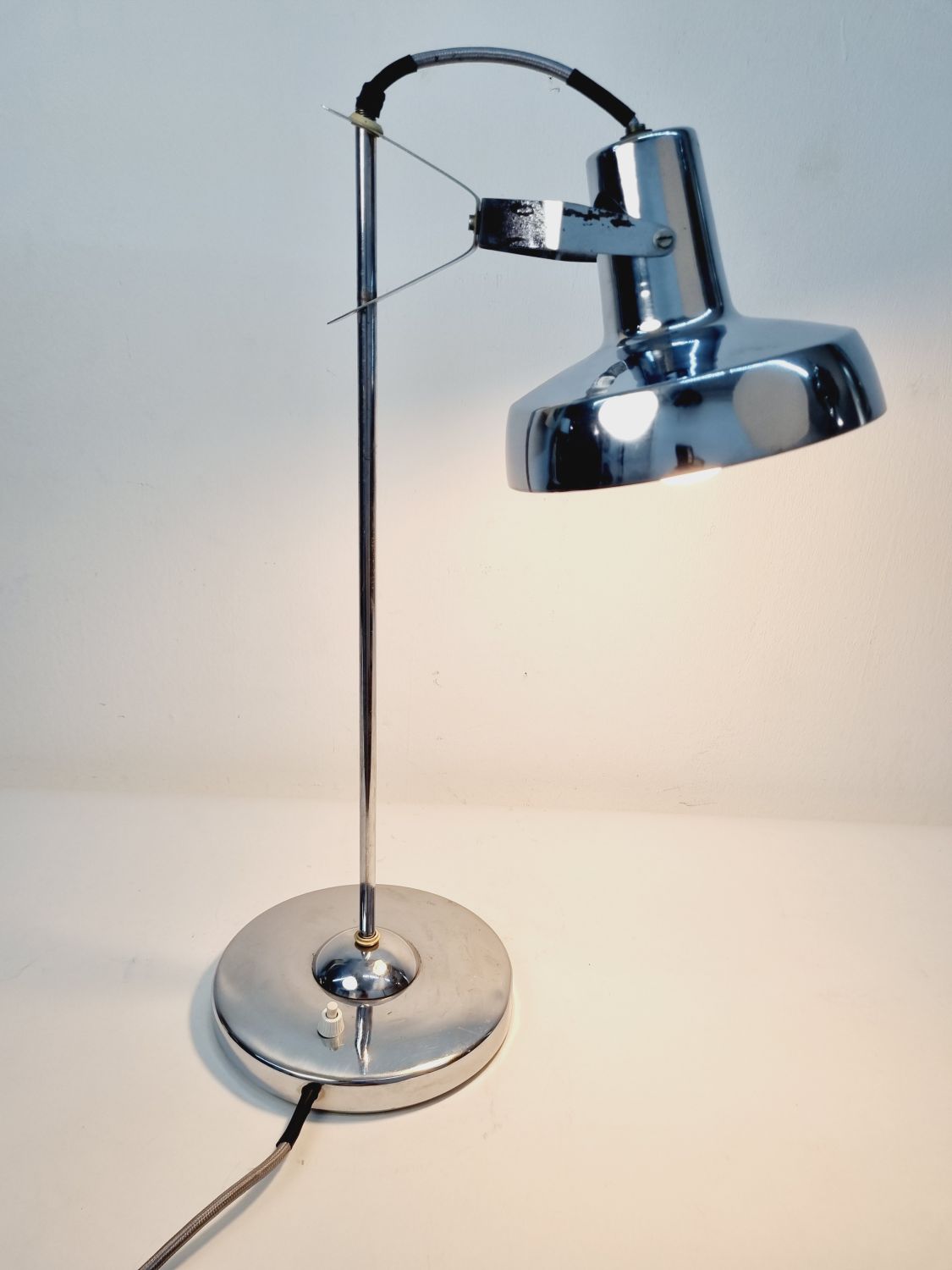 Modern, letisztult formavilágú, Heller Sándor által tervezett, állítható asztali lámpa az 1970-es évekből. Megkímélt állapotban, a lámpatesten enyhén kopott a krómozás.