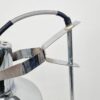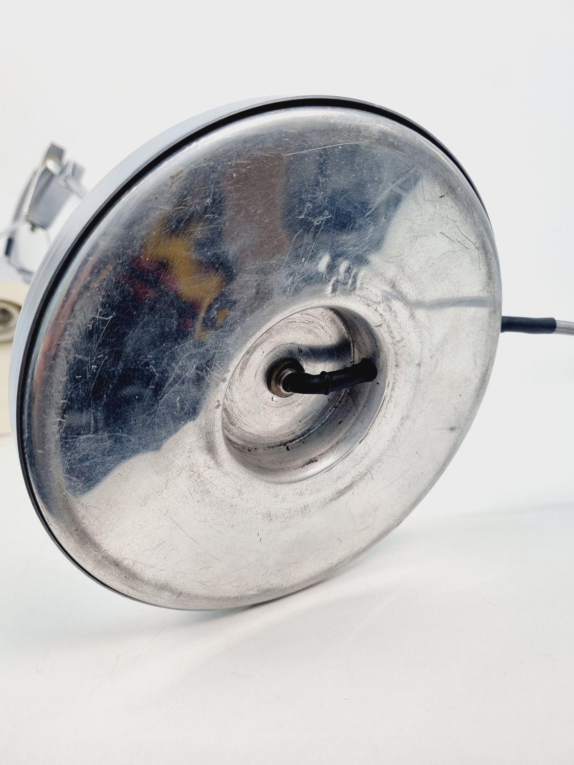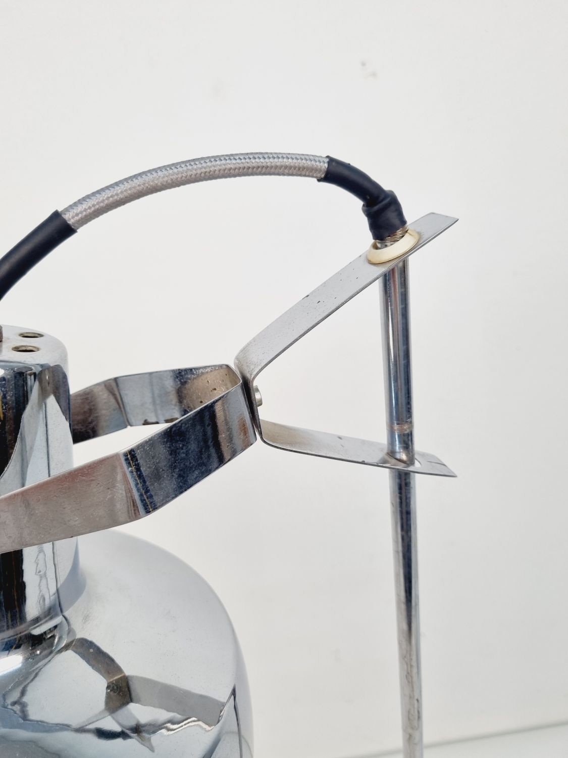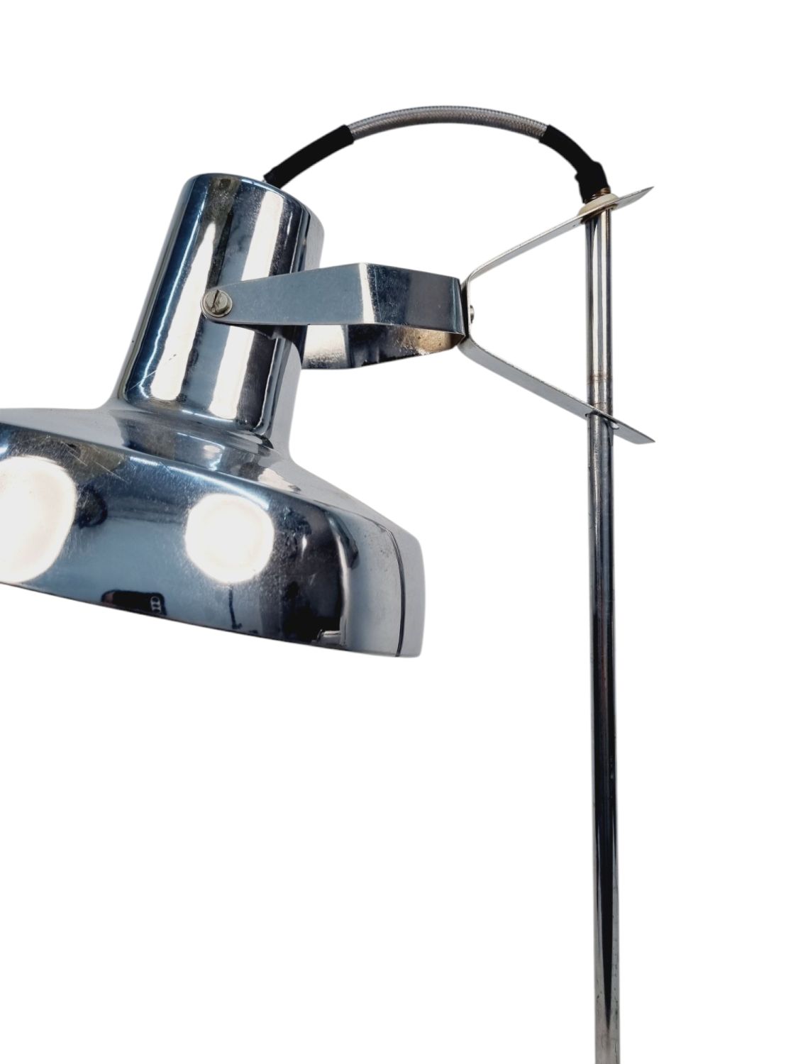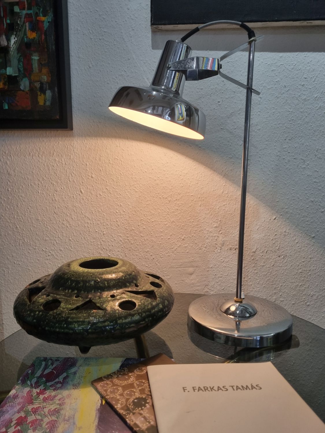 Modern, letisztult formavilágú, Heller Sándor által tervezett, állítható asztali lámpa az 1970-es évekből. Megkímélt állapotban, a lámpatesten enyhén kopott a krómozás.