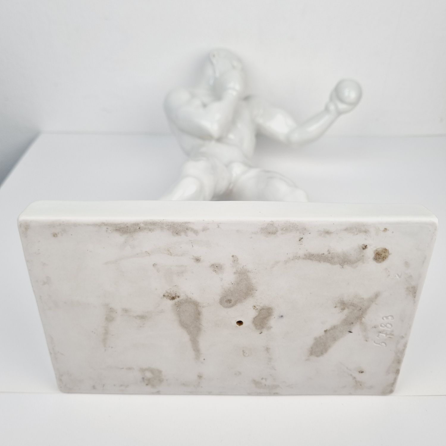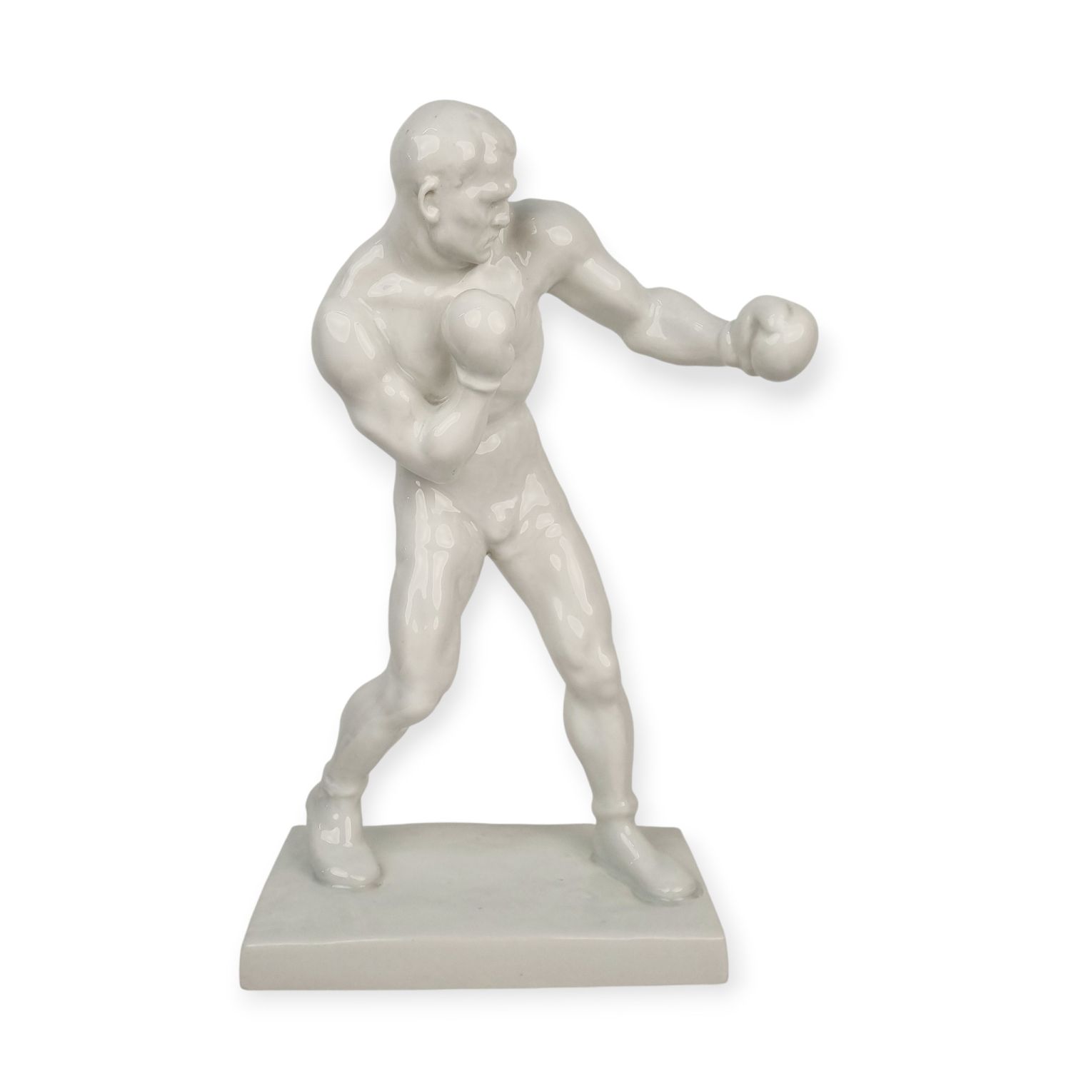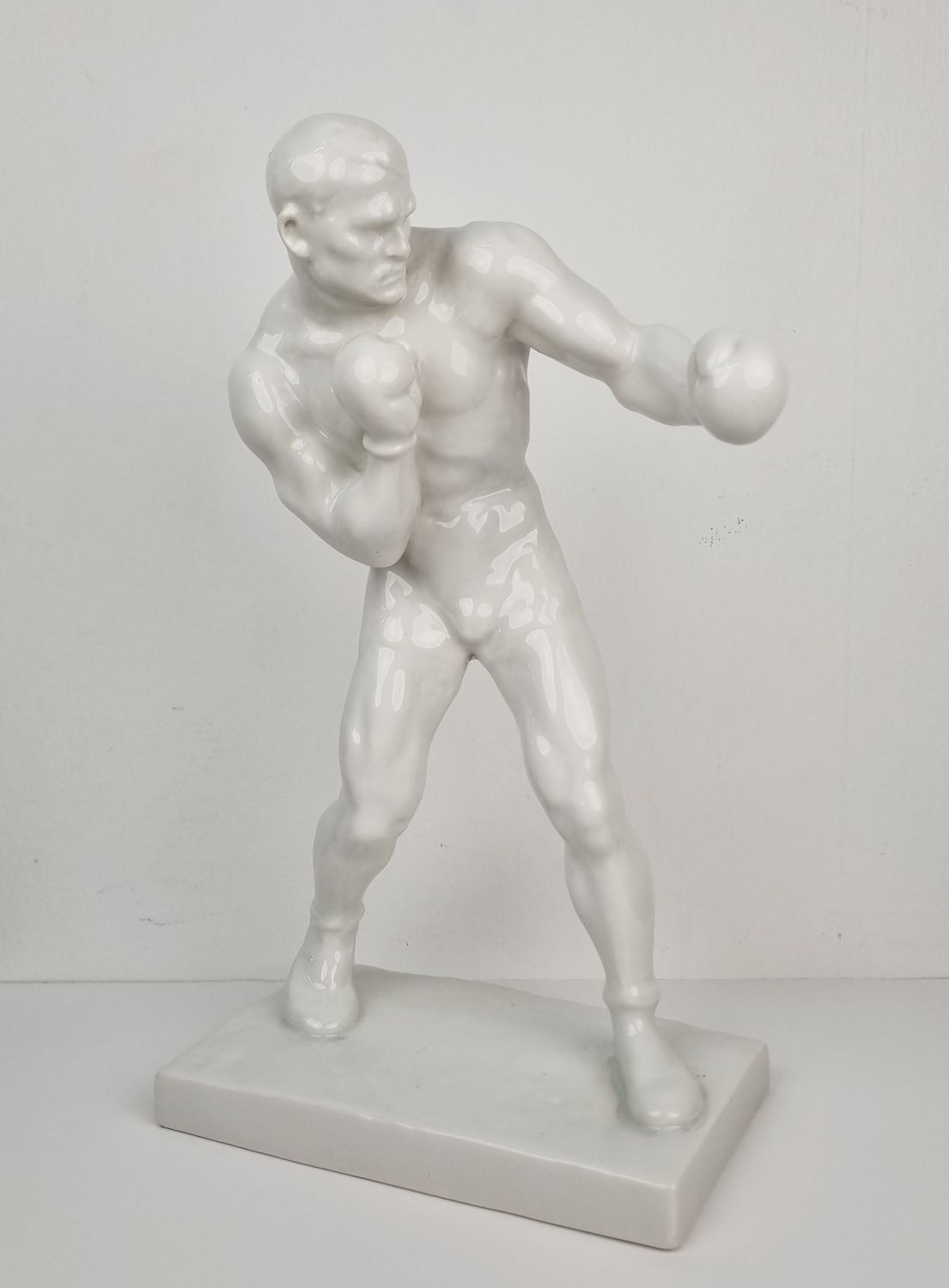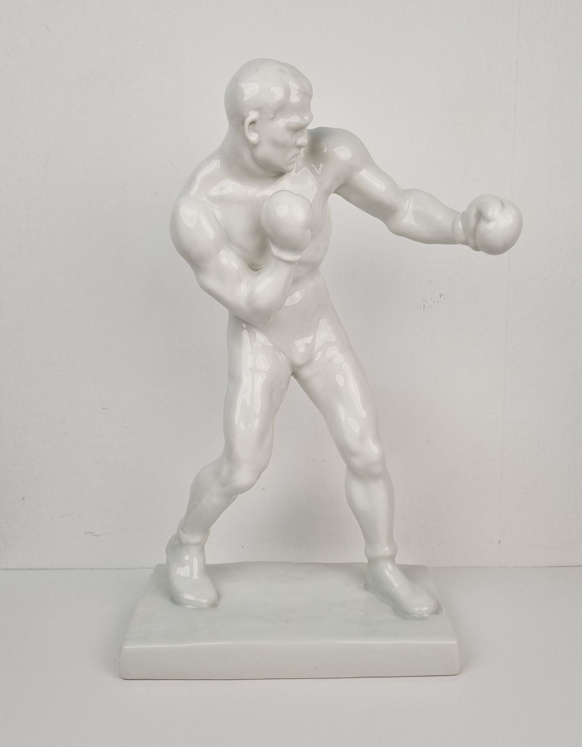 Ökölvívót ábrázoló herendi porcelán figura az 1950-es évekből. Alapmázas, formaszámmal ellátott alkotás. Kocsis Antal világhírű ökölvívó tiszteletére készült, akit a magyar kormány jelentős kitüntetésben részesített. Korának megfelelő állapotú. Méretei: 30 x 20 x 11 cm.