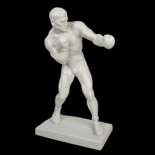Ökölvívót ábrázoló herendi porcelán figura az 1950-es évekből. Alapmázas, formaszámmal ellátott alkotás. Kocsis Antal világhírű ökölvívó tiszteletére készült, akit a magyar kormány jelentős kitüntetésben részesített. Korának megfelelő állapotú. Méretei: 30 x 20 x 11 cm.