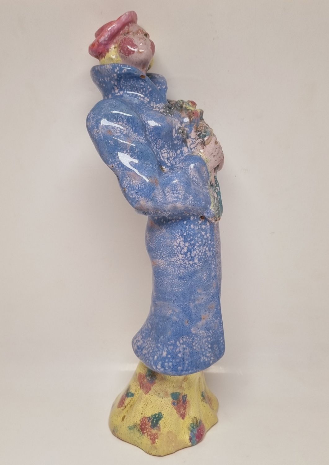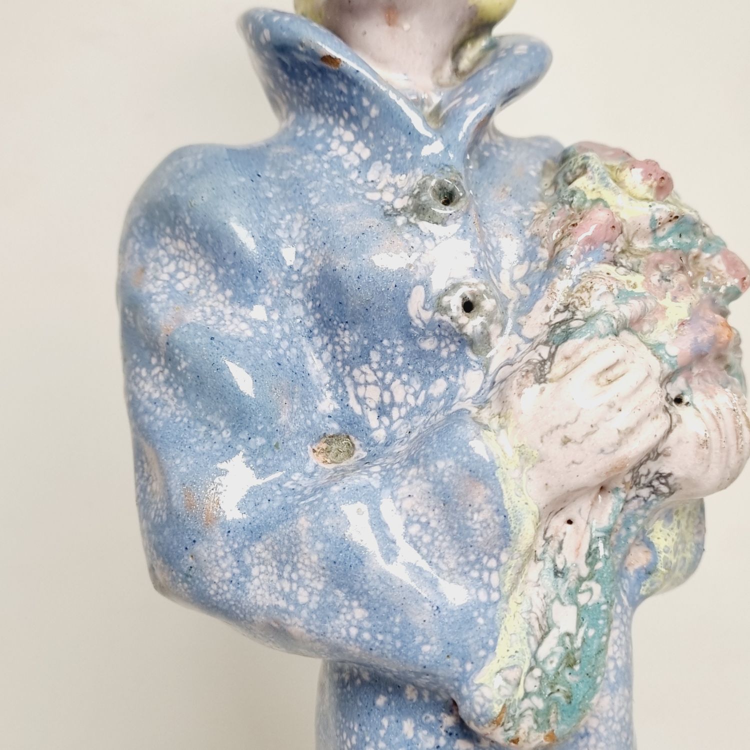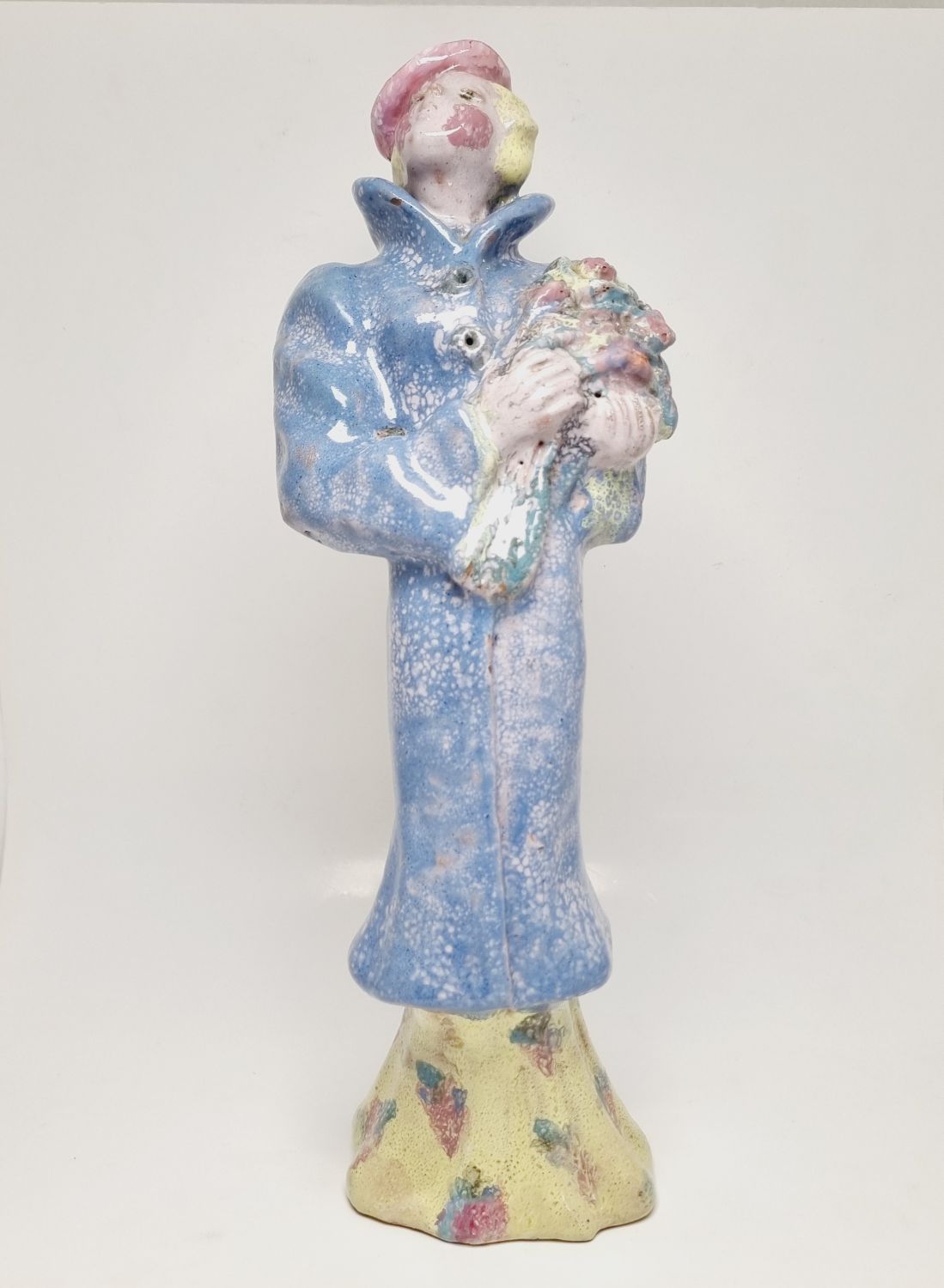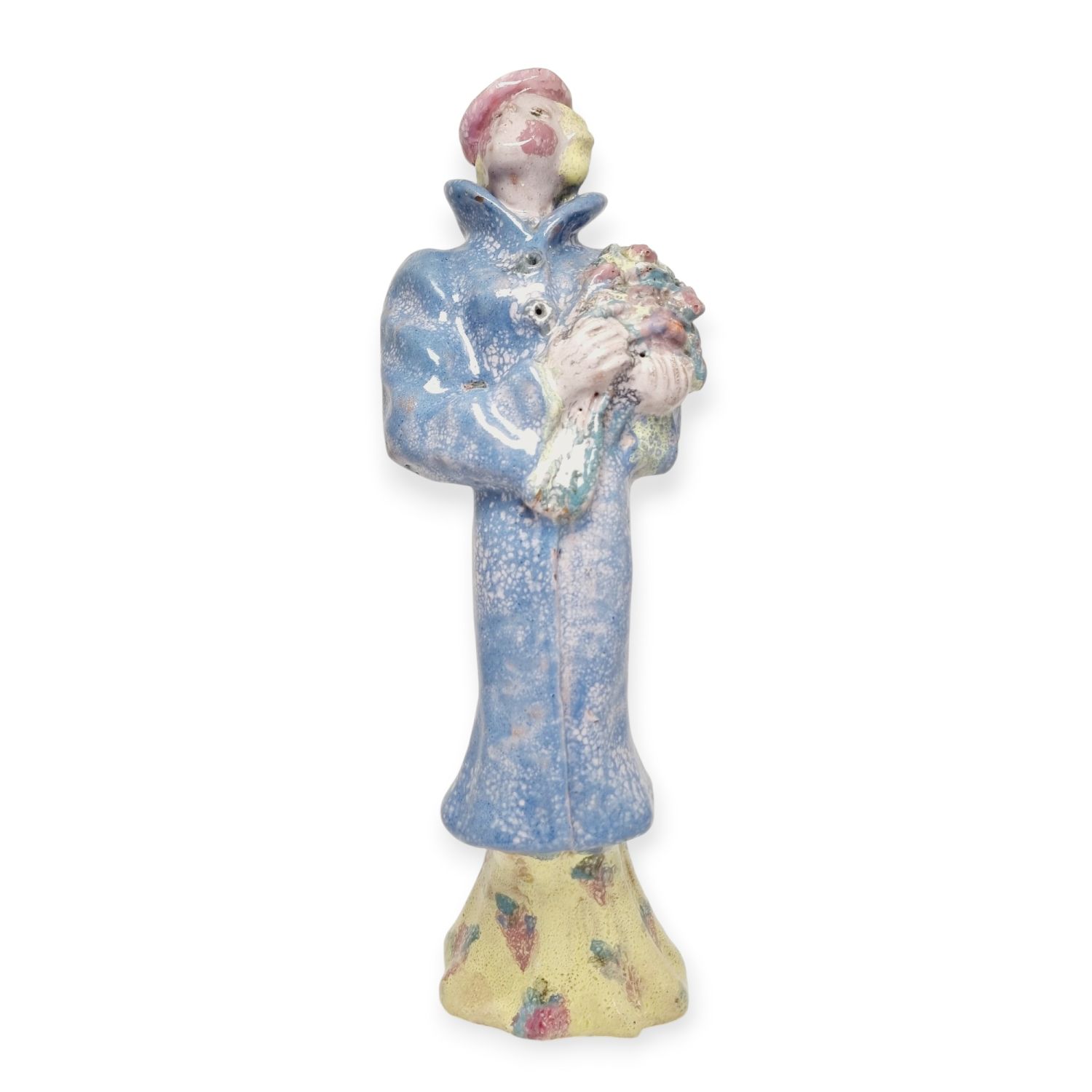 Hölgy virágcsokorral c. kerámia, amely az 1940-es években készült.Jelzés nélküli. Elegáns, finom színvilágú késői art deco stílusú alkotás. Korának megfelelő állapotú. Méretei: 26x9x6cm