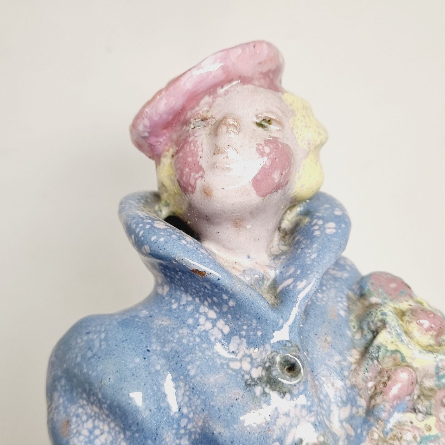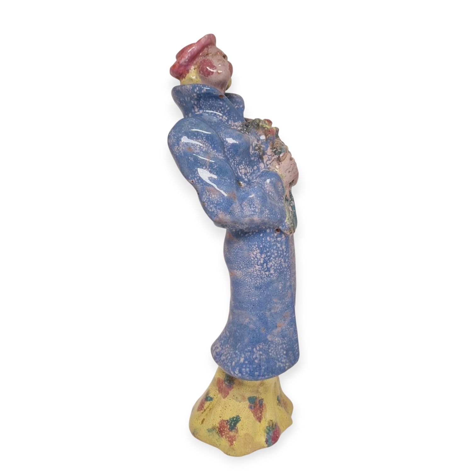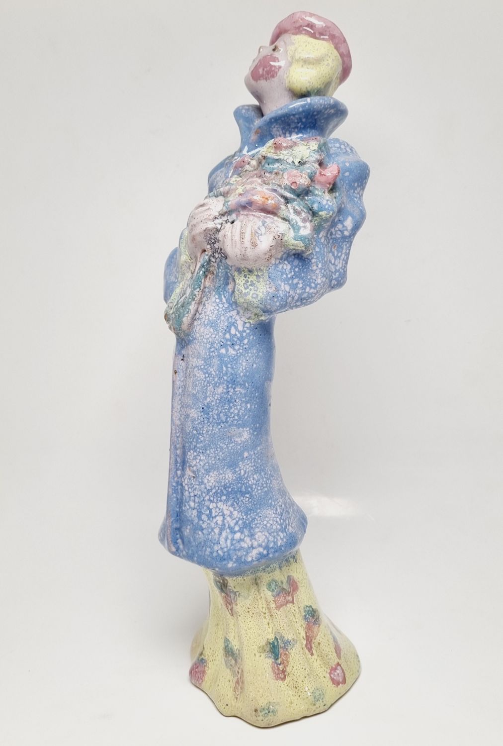 Hölgy virágcsokorral c. kerámia, amely az 1940-es években készült.Jelzés nélküli. Elegáns, finom színvilágú késői art deco stílusú alkotás. Korának megfelelő állapotú. Méretei: 26x9x6cm