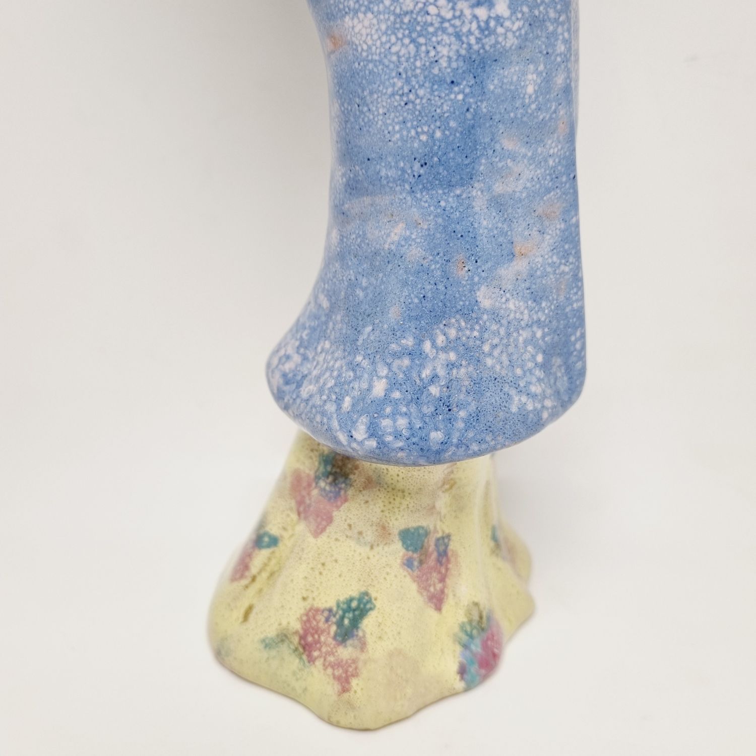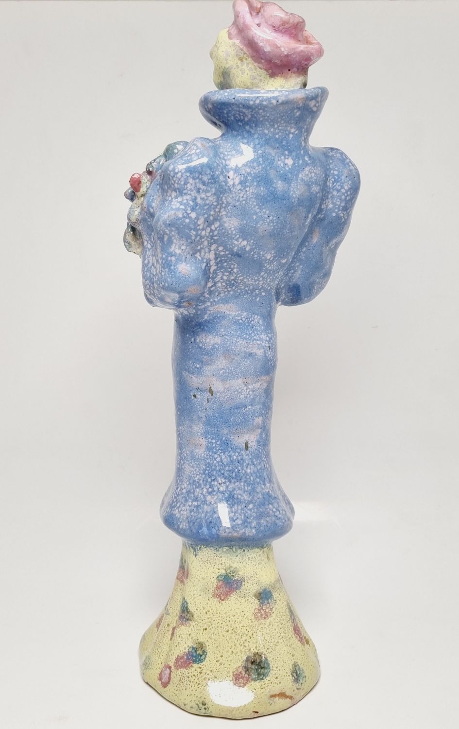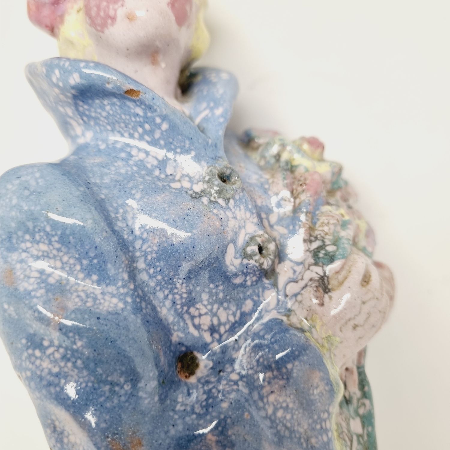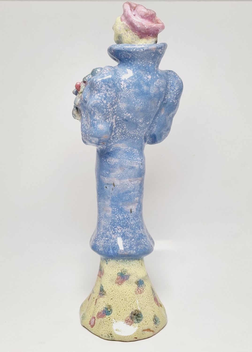 Hölgy virágcsokorral c. kerámia, amely az 1940-es években készült.Jelzés nélküli. Elegáns, finom színvilágú késői art deco stílusú alkotás. Korának megfelelő állapotú. Méretei: 26x9x6cm