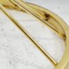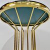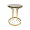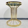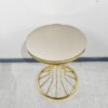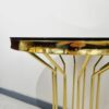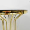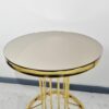 Exkluzív kör alakú arany színű lerakó asztal üveg lappal. Származási hely: Olaszország kb. az l980-as évek körül. Minimalista stílusú atmoszférában elegáns kiegészítő bútordarab. Méretei: 50 x 44 x 44 cm.