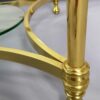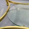 Vintage Hollywood Regency arany színű réz dohányzóasztal, kerek, füstüveg lappal, elegáns, dekoratív bútor modern és klasszikus enteriőrbe egyaránt beilleszthető.