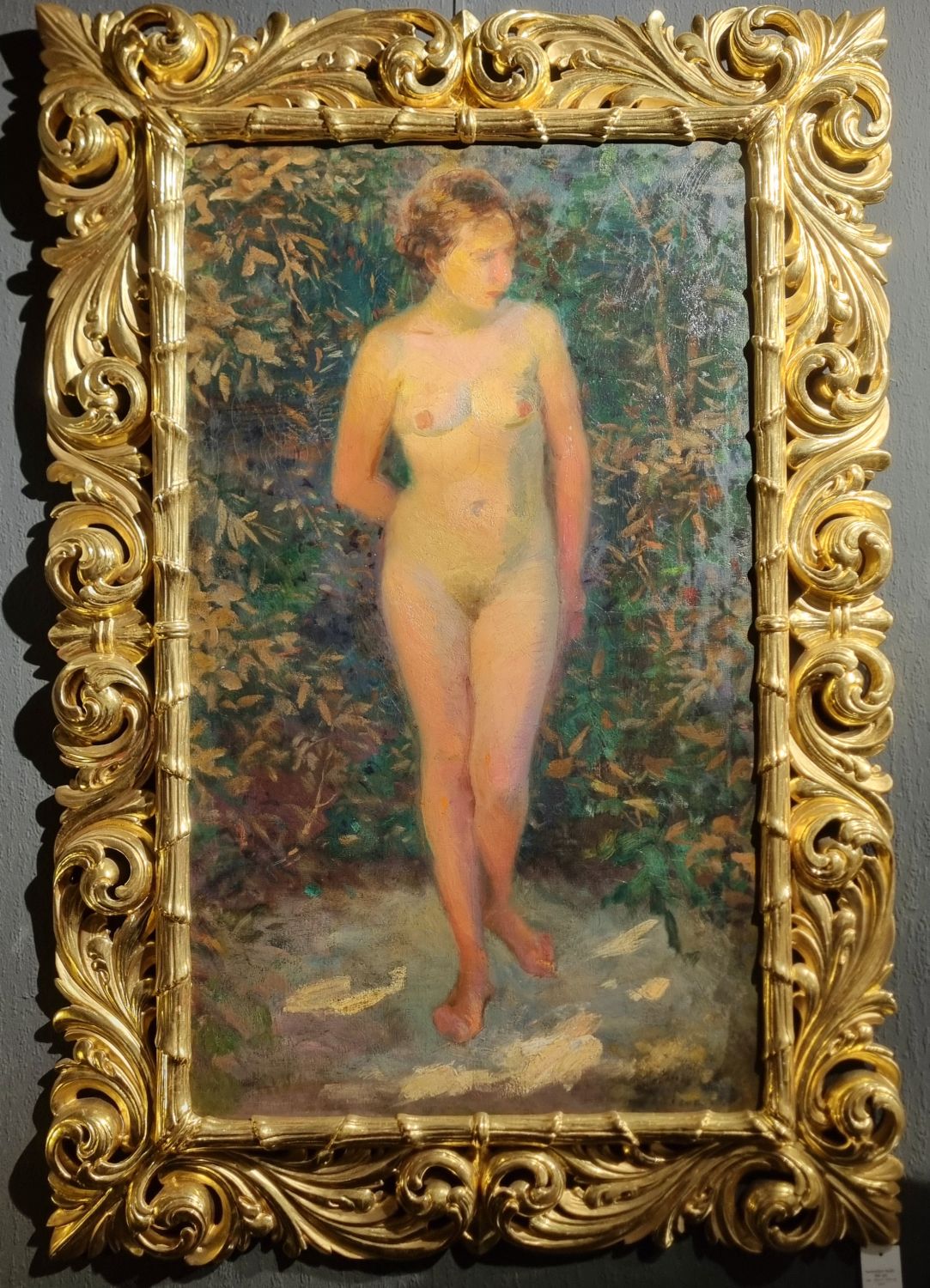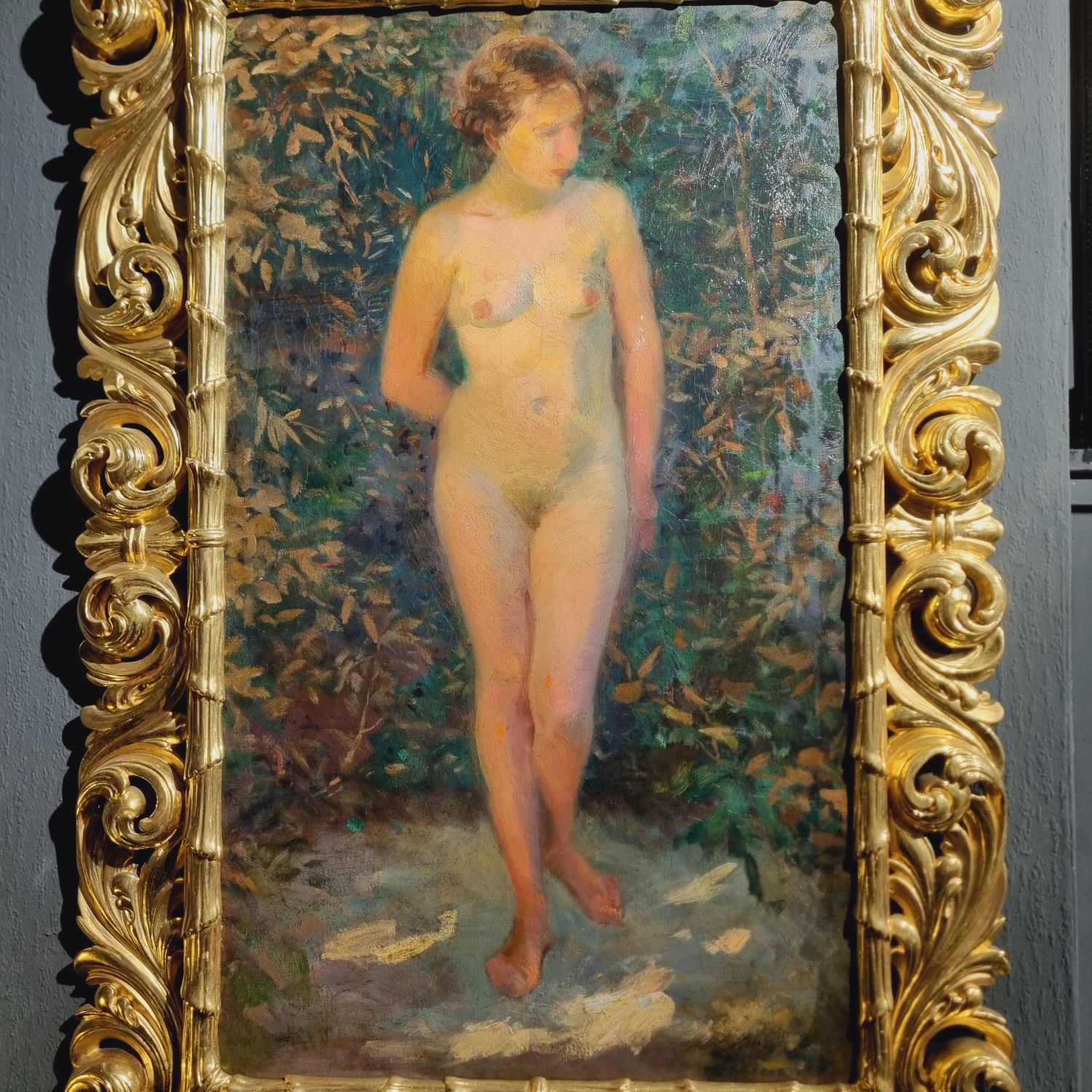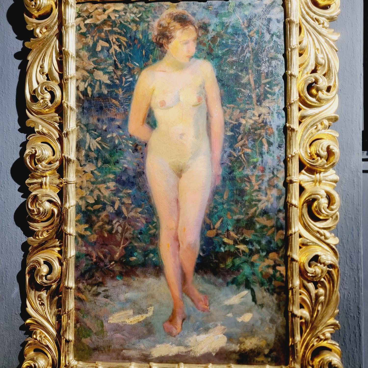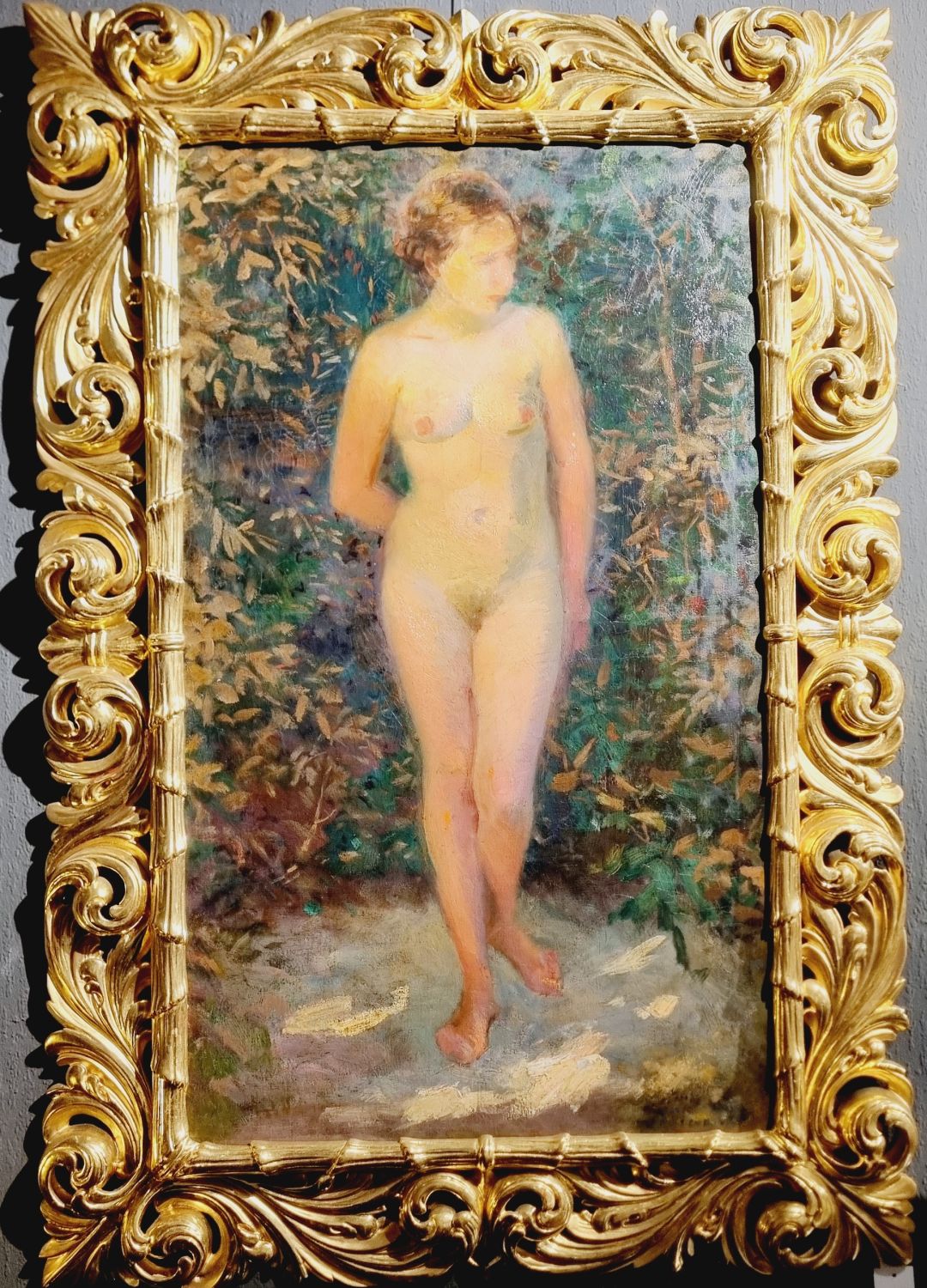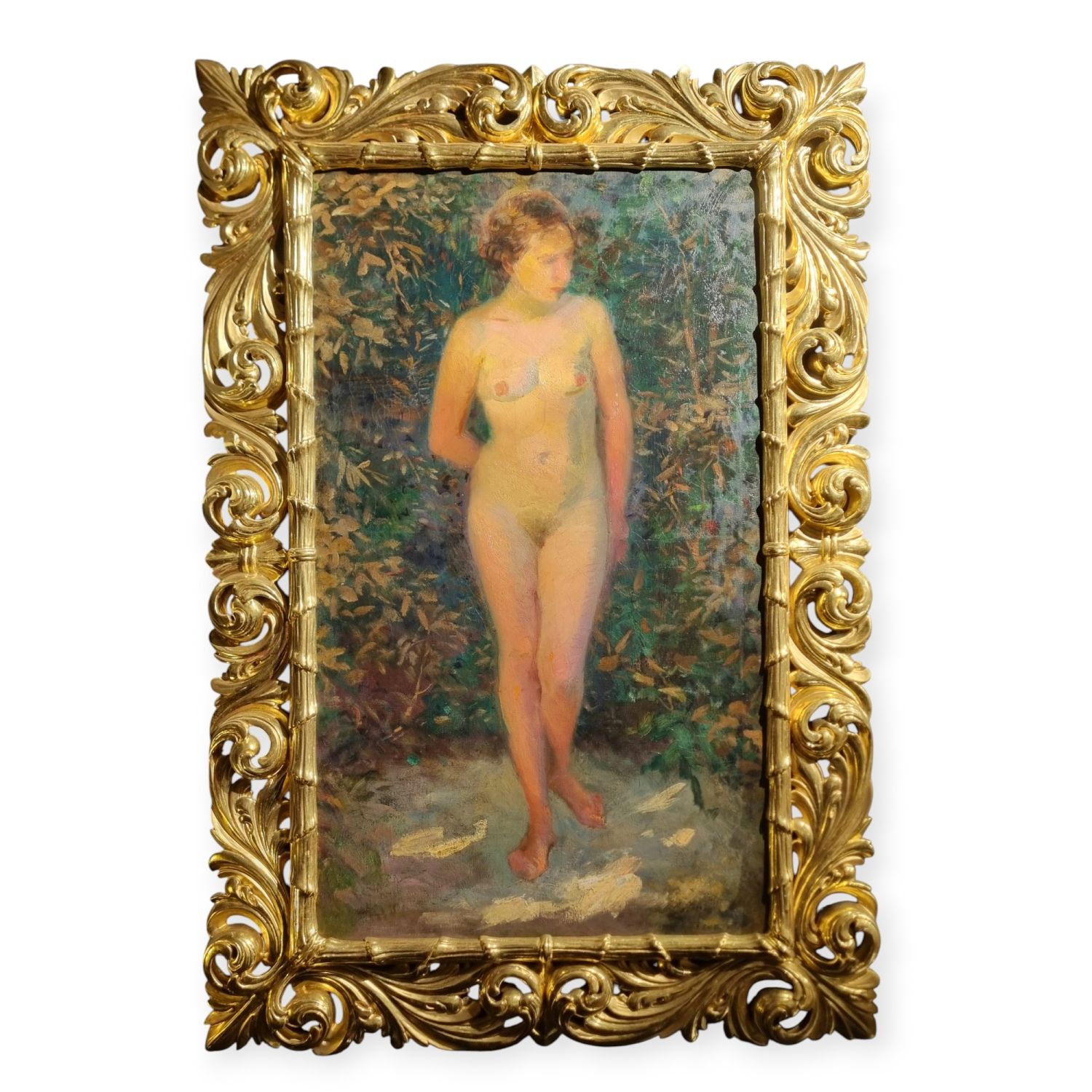 Ismeretlen festő: Női akt aranyozott florentin keretben. Finoman árnyalt, szabadban festett női akt tanulmány a 20. század elejéről. Olvashatatlan aláírás j.j.l. Kerete hibátlan . Méretei: 127 x 83 x 4 cm.