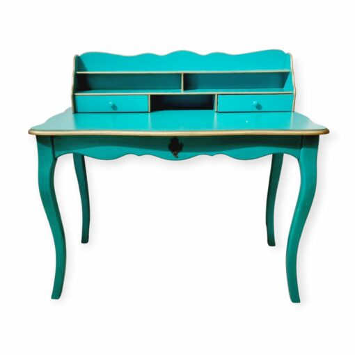 Női Kare design íróasztal tömör fából, türkiz és arany festéssel. Az antik elegancia ötvözve a modern hivalkodó, élénk színekkel. Klasszikus és modern enteriőrbe egyaránt ajánljuk. Jó állapotú.