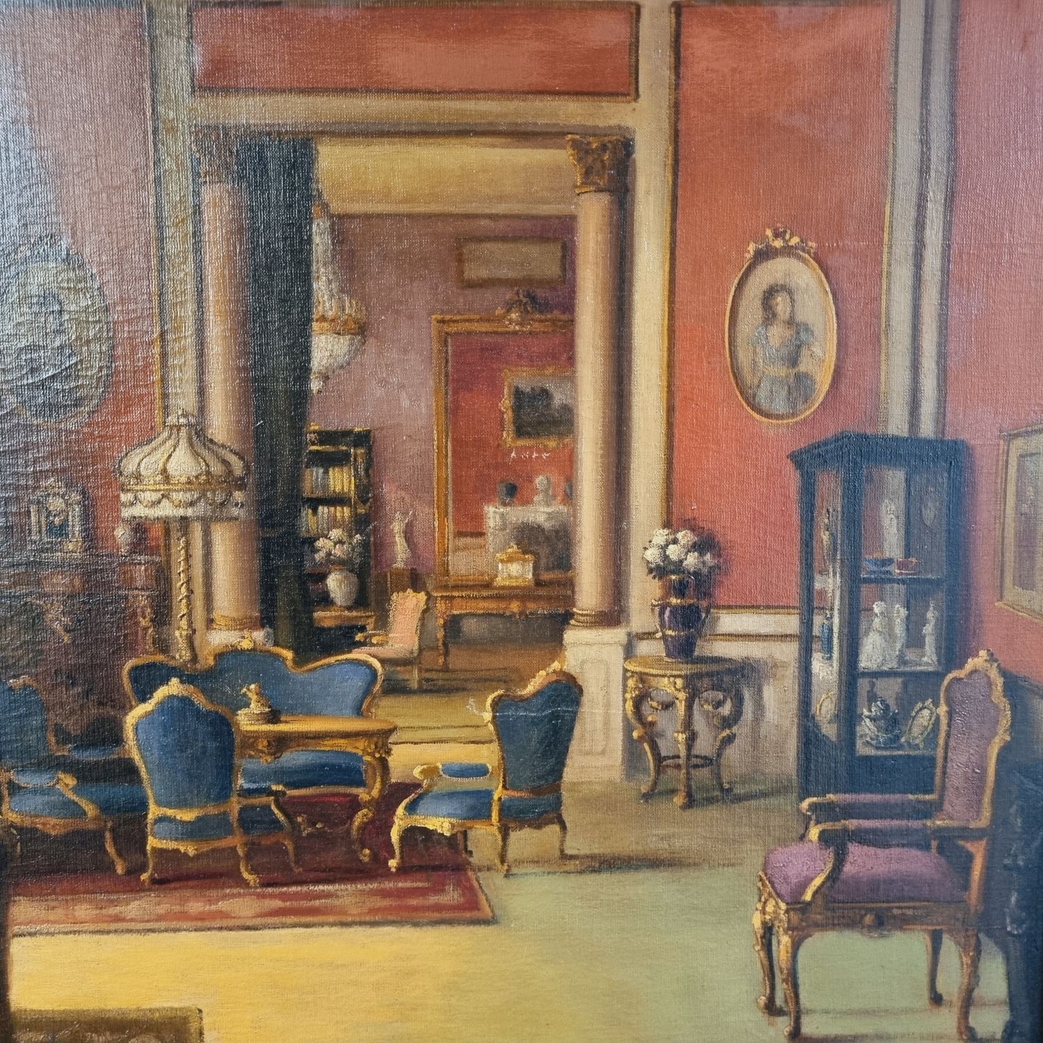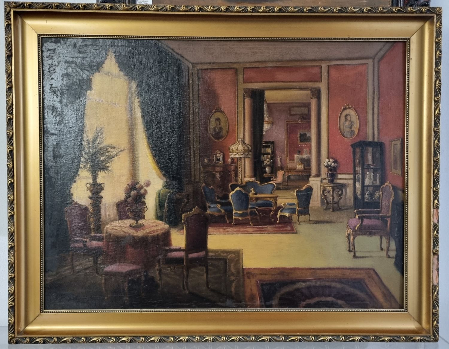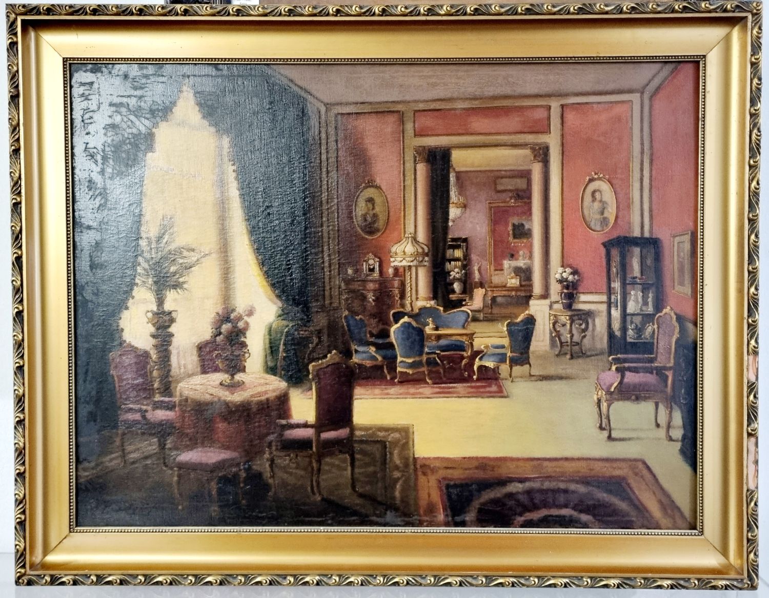 Kárpáthy László: Enteriőr 1940s évek. Olaj vászon. Szignózott, a fotón látható szép állapotban. Dekoratív, igényesen megfestett szalonkép.