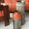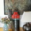 Nagyméretű kézzel készített hordó hatású padlóváza, piros és fekete fényes mázzal bevonva, az 1970-es évekből. Szép állapotban elérhető.