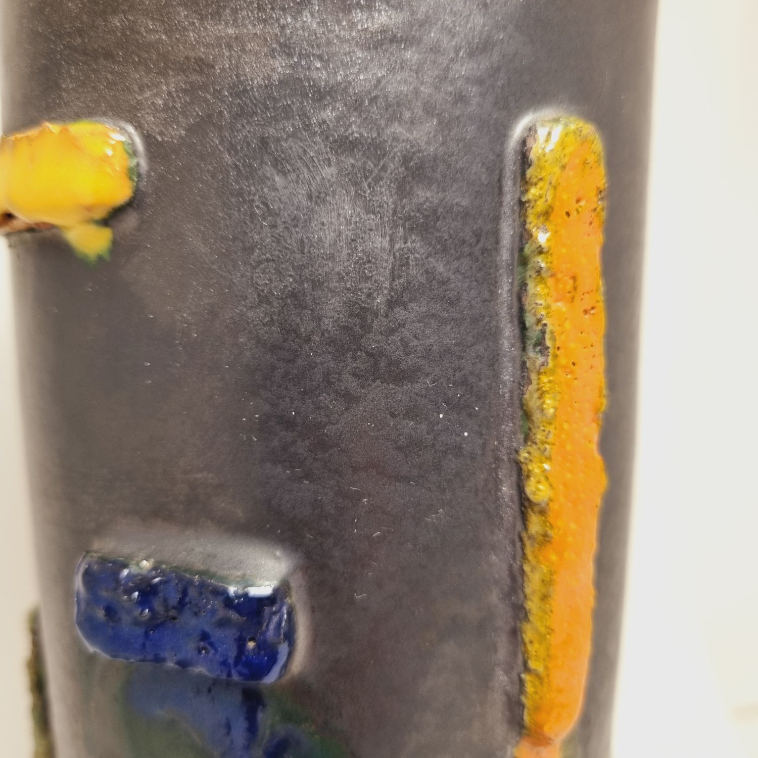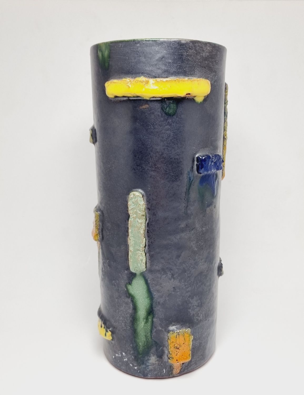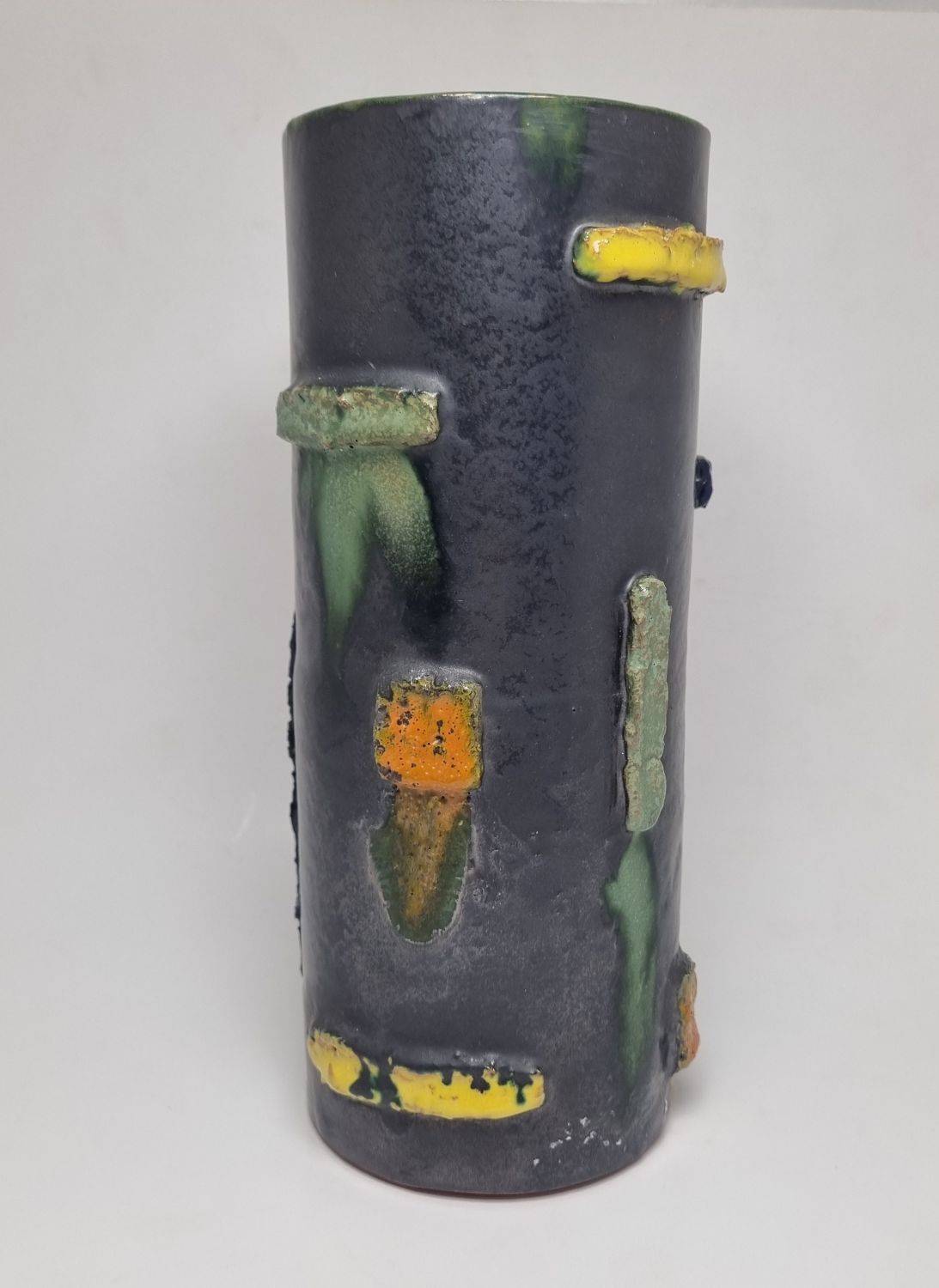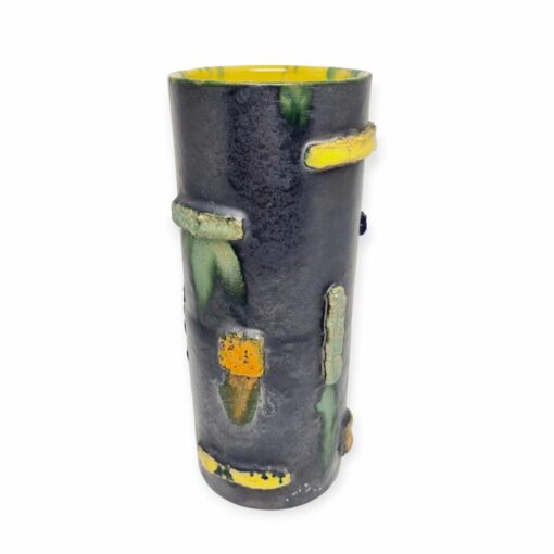 Kerámia váza az 1940-es évekből. Felülete texturált, kissé brutalista stílusú, ami kiemeli a kézműves jellegét. Jelzés nélkül. Minimalista stílusú enteriőr izgalmas darabja lehet. Hibátlan állapotú. Méretei: 22 x 9 x 9 cm