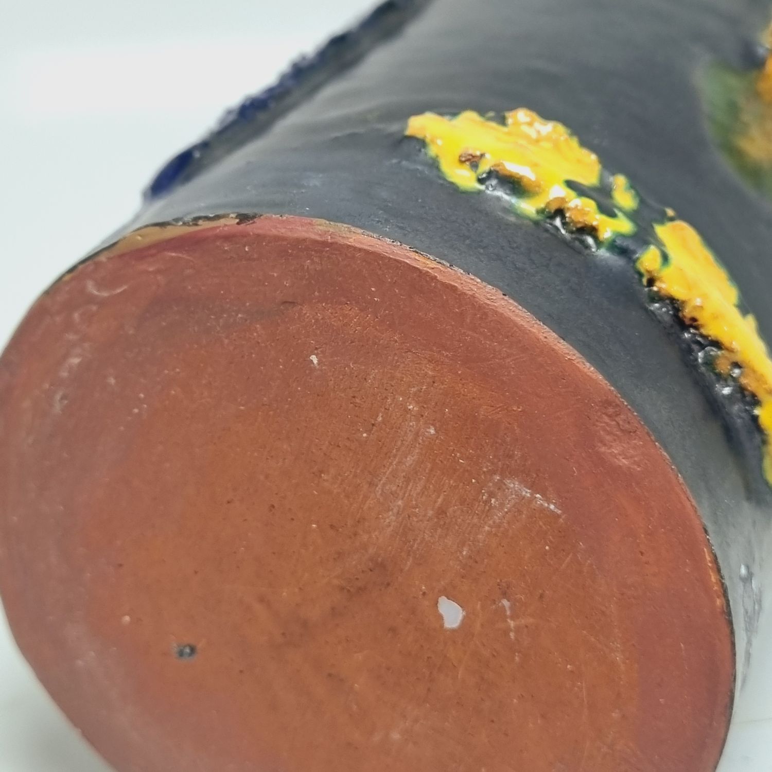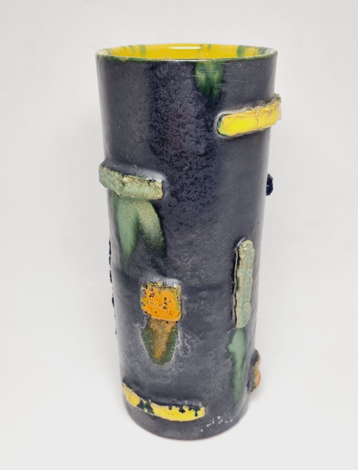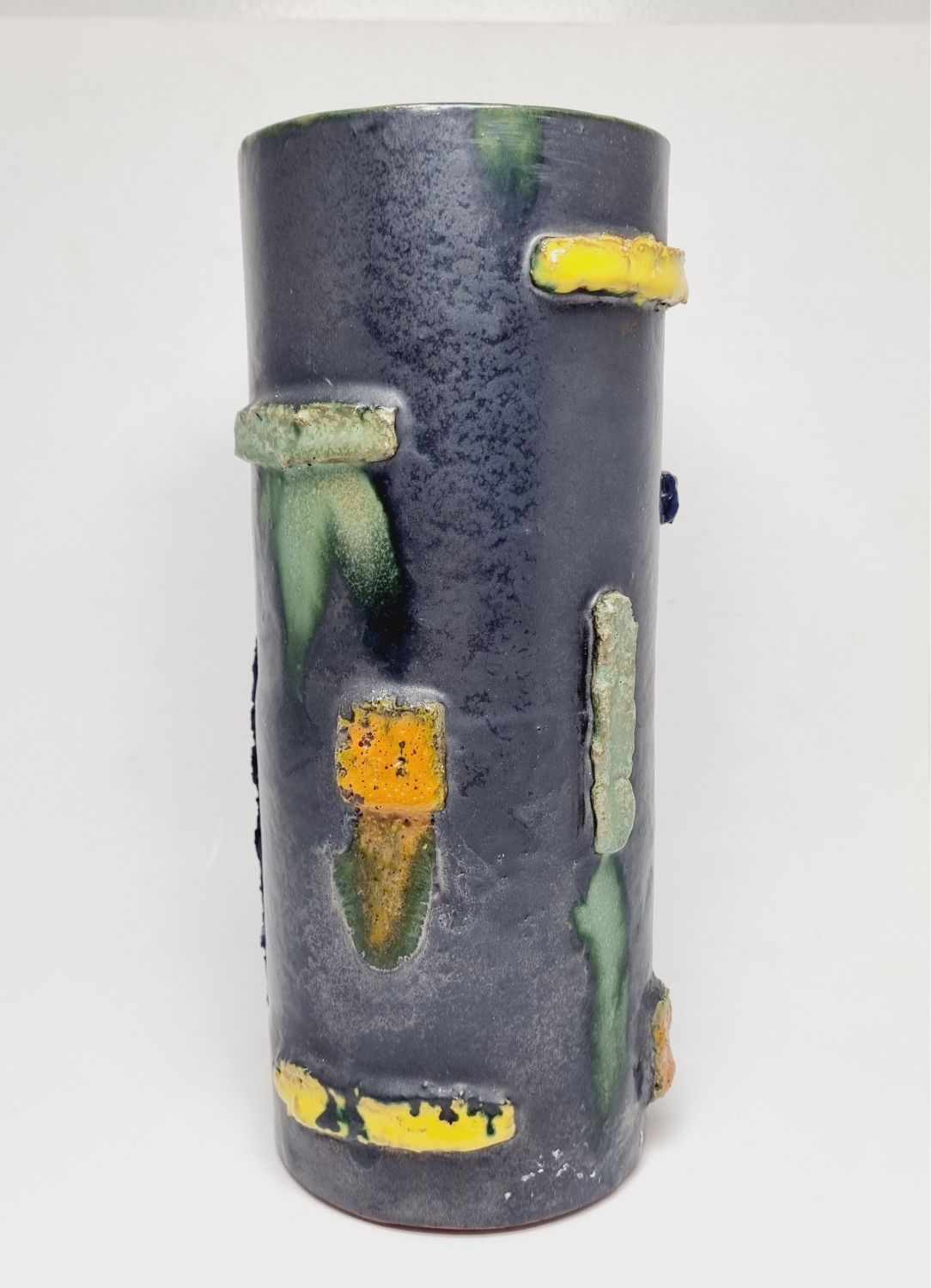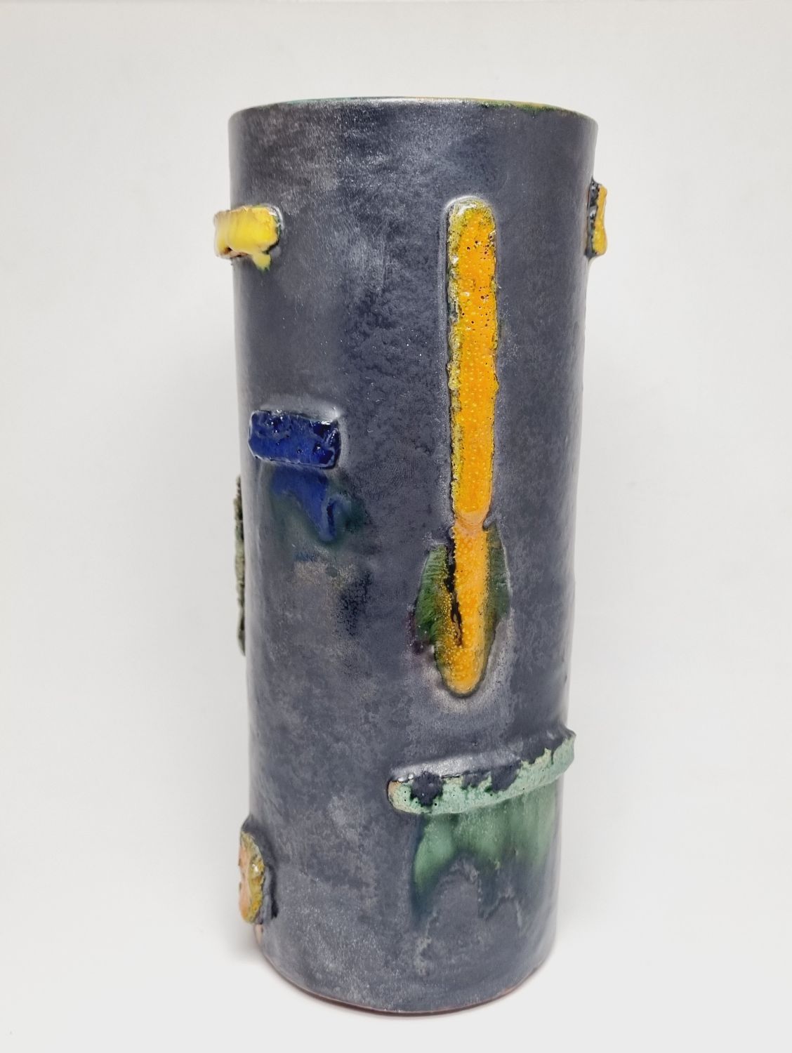 Kerámia váza az 1940-es évekből. Felülete texturált, kissé brutalista stílusú, ami kiemeli a kézműves jellegét. Jelzés nélkül. Minimalista stílusú enteriőr izgalmas darabja lehet. Hibátlan állapotú. Méretei: 22 x 9 x 9 cm