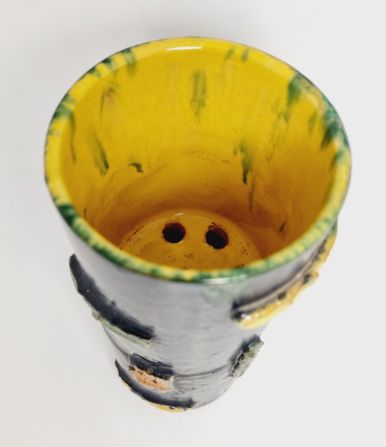 Kerámia váza az 1940-es évekből. Felülete texturált, kissé brutalista stílusú, ami kiemeli a kézműves jellegét. Jelzés nélkül. Minimalista stílusú enteriőr izgalmas darabja lehet. Hibátlan állapotú. Méretei: 22 x 9 x 9 cm