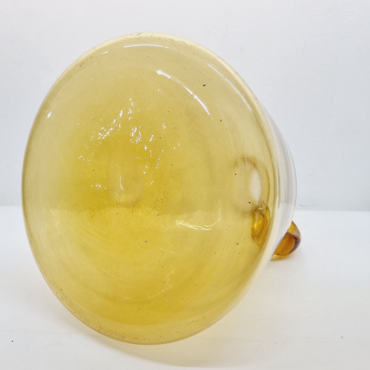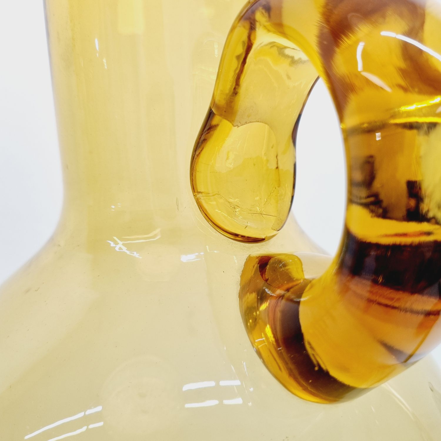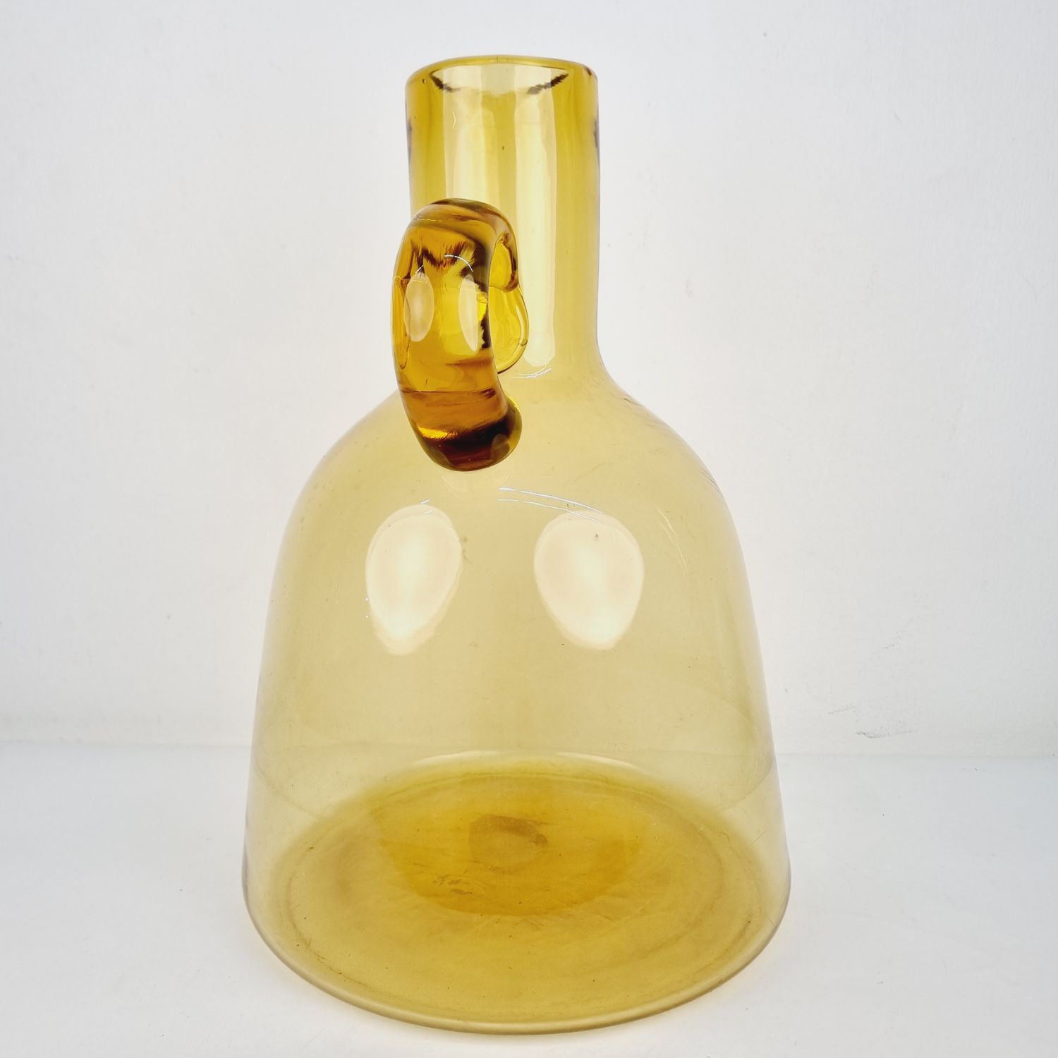 A kézműves fúvás technikája miatt egyedi formával rendelkező borostyánüveg az 1920s években készült. Gyűjtői darab, dekorációként vagy italok tárolására használható. Korának megfelelő állapotú. Méretei: 35 x 24 x 24 cm.